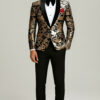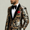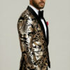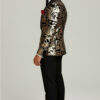 Are you looking for something different to wear to your next formal affair? This stunning men’s black and gold tuxedo jacket will have all eyes on you the minute you enter the room. Wrap yourself in the luxury of velvet and eye-catching sequins without emptying your wallet. This stylish dinner jacket shows off your sophisticated sense of style and sets you apart from those around you.