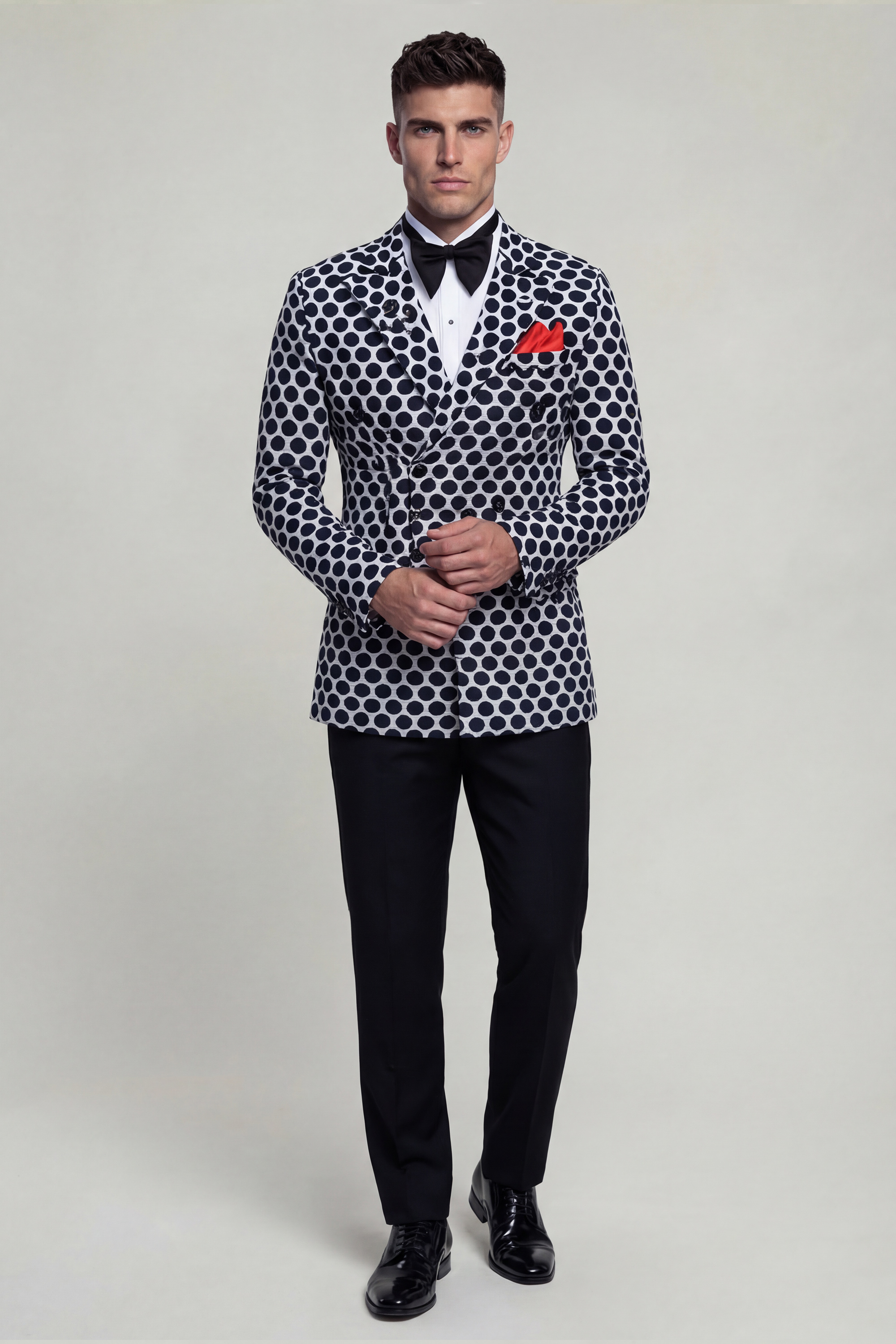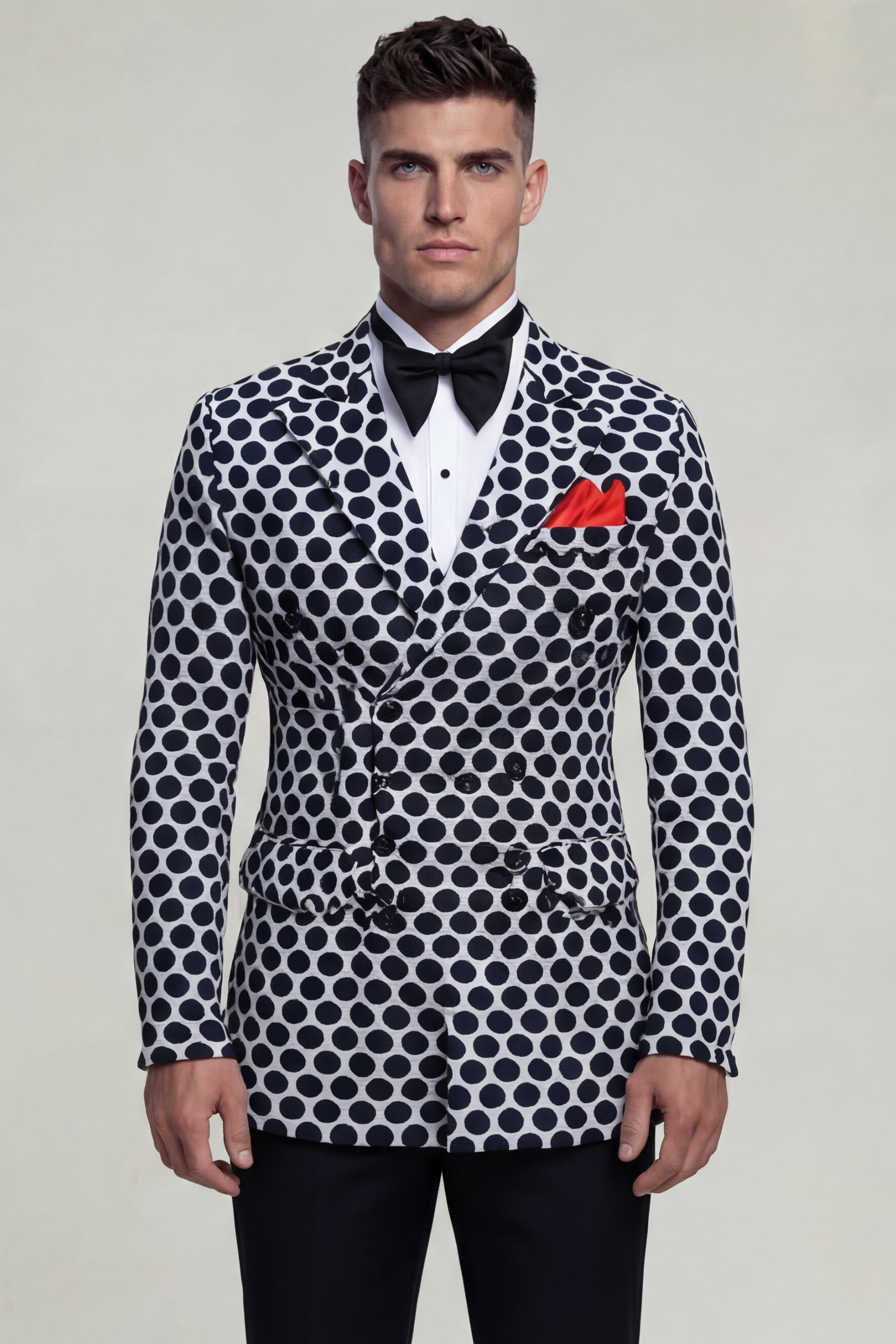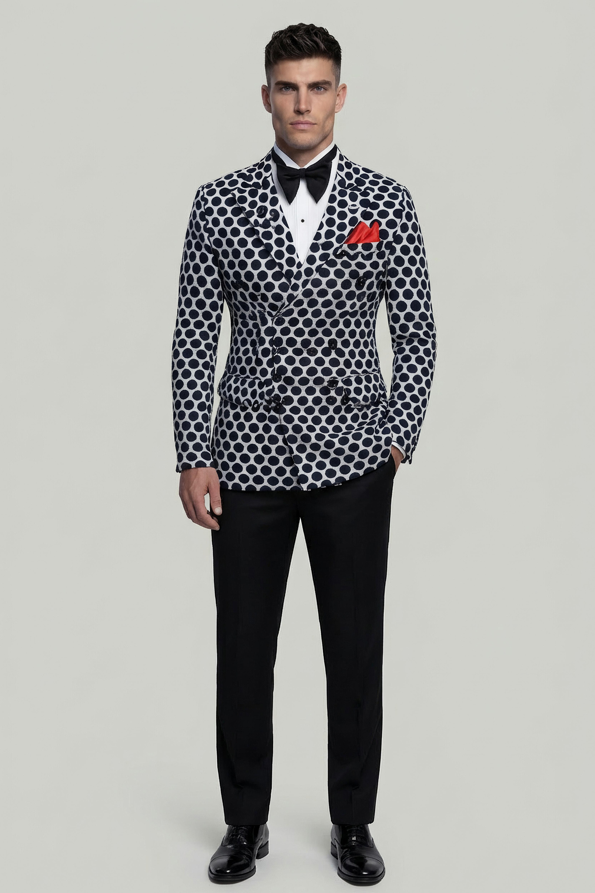 Ideal for formal events, upscale celebrations, and fashion-forward occasions, the Double Breasted Black & White Polka Dot Suit embodies confidence, individuality, and elevated style in every detail.