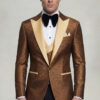The jacket is styled with a modern single-breasted closure and a wide satin shawl lapel in a complementary champagne-gold tone, creating a bold yet polished contrast. Coordinated satin-trimmed pockets and refined buttons further elevate the overall aesthetic. The matching vest completes the ensemble with a tailored cut that enhances structure and formality, delivering a cohesive and distinguished look.