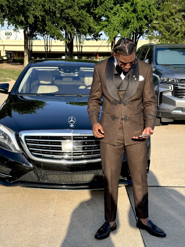 The Gentleman’s Guru Diamond Dark Brown Tuxedo – 3 Piece is an exquisite ensemble that seamlessly combines vintage charm with contemporary elegance. Meticulously designed with meticulous attention to detail, this tuxedo is a true masterpiece, destined to make a bold statement and elevate your style at any formal occasion. The Diamond Dark Brown Tuxedo boasts a slim-fit cut, ensuring a modern and tailored look that accentuates your physique with finesse. For those seeking a personalized fit, we offer a custom-size option, guaranteeing a flawless and comfortable fit for every discerning gentleman. The vintage micro Diamond pattern on a classic dark brown backdrop adds a touch of refined artistry to the tuxedo. This intricate and unique design captures your attention while reflecting your distinctive sense of style and appreciation for exquisite craftsmanship. The jacket features a modern single-breasted closure with two embroidered buttons, showcasing a wide shawl collar. This distinctive collar design exudes sophistication and modernity, making it an ideal choice for those who seek to make a bold and memorable impression. The vest boasts a double-breasted closure with six buttons, featuring a classic cut and a wide shawl lapel. The Gentleman’s Guru Crimson Stitches signature discreetly embellishes the tuxedo, symbolizing unparalleled quality and craftsmanship that define our brand. To ensure unparalleled comfort and adaptability, the tuxedo is half-canvassed, allowing it to mold to your body over time while maintaining its impeccable structure. The fully lined jacket and vest provide a luxurious feel and a polished appearance, ensuring you exude confidence at every turn. Handcrafted with a blend of wool, cotton, linen, and polyester, this tuxedo guarantees exceptional durability without compromising on comfort or style. The premium fabric blend ensures breathability, softness, and resilience, making it an excellent choice for various formal events. The 3 Piece Diamond Dark Brown Tuxedo comes complete with matching pants that perfectly complement the jacket and vest. Additionally, we offer a solid black pants option, providing you with the flexibility to create different looks and styles effortlessly. In summary, The Gentleman’s Guru Diamond Dark Brown Tuxedo – 3 Piece is a masterpiece that flawlessly combines vintage charm with contemporary elegance. With its slim-fit cut, micro Diamond pattern, single-breasted closure, and luxurious fabric blend, this tuxedo epitomizes the essence of refined style with a touch of sophistication. Whether you’re attending a wedding, gala, or any formal event, this tuxedo will elevate your presence with its distinctive charm and undeniable sophistication. Choose The Gentleman’s Guru and embrace the pinnacle of sartorial excellence. Every suit and full tuxedo comes with a Gentleman’s Guru waterproof garment bag to protect your investment.
