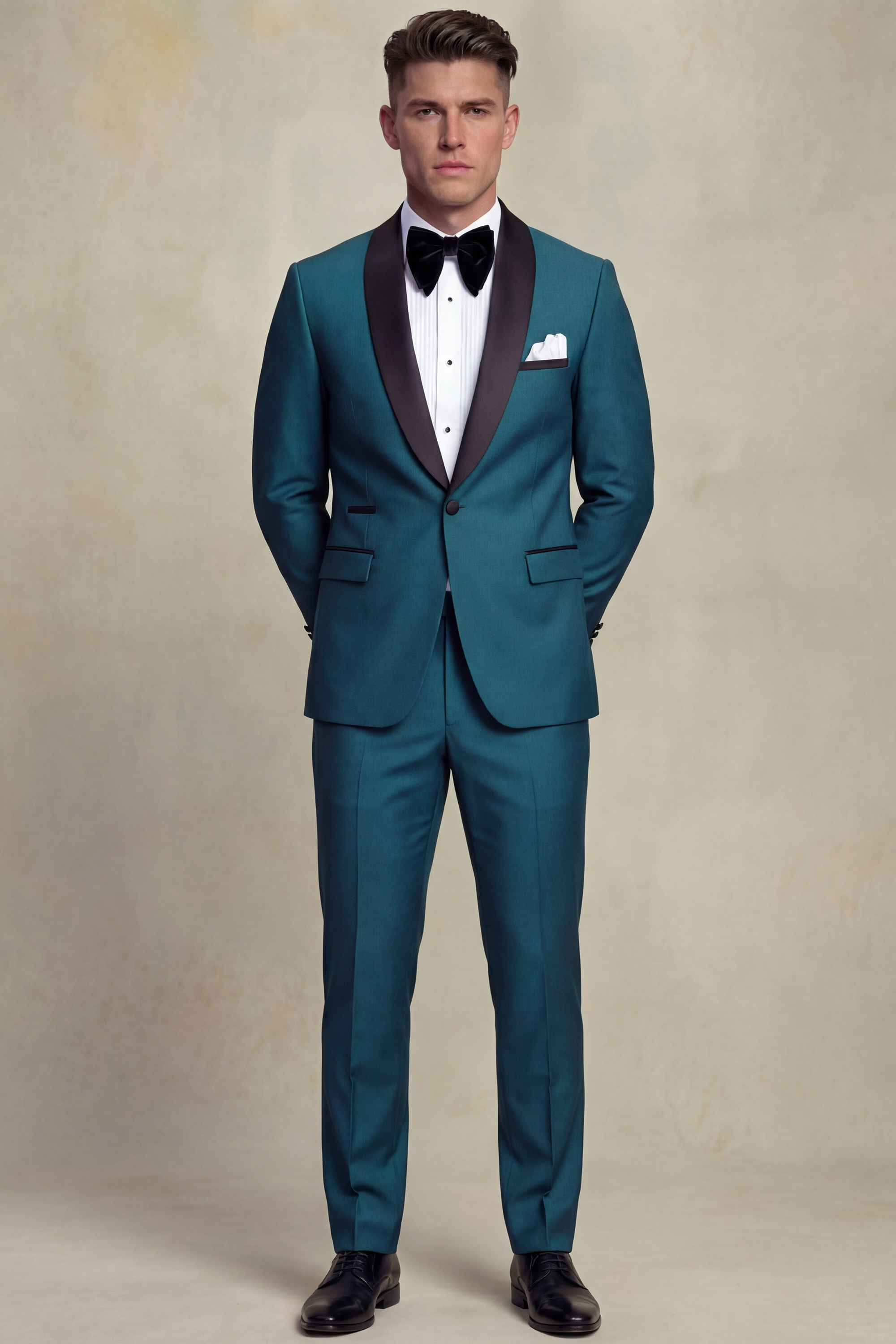 The fabric features a solid classic teal pattern, delivering a rich and elegant tone that stands out with understated authority. The jacket is styled with a modern single-breasted closure and one button, complemented by a refined shawl peak collar that adds a contemporary edge to a classic tuxedo profile. Three front pockets provide a clean, balanced finish while maintaining functional sophistication.