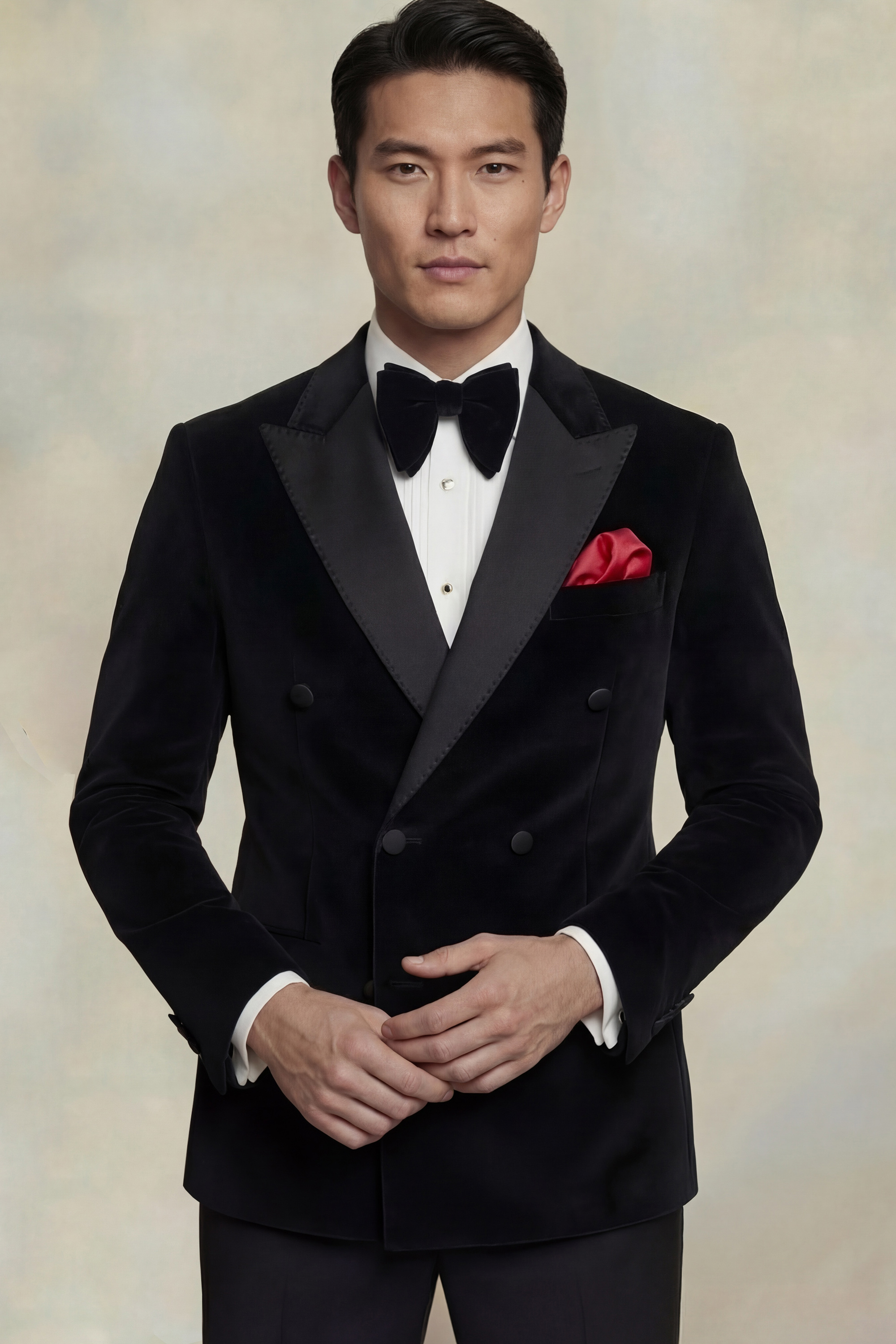 Introducing The Gentleman’s Guru Double Breasted Black Velvet Tuxedo Jacket – a true embodiment of opulence and contemporary elegance. Crafted with the utmost precision and attention to detail, this jacket is a testament to refined taste and impeccable craftsmanship, designed to make an indelible impression at upscale events and formal occasions.
