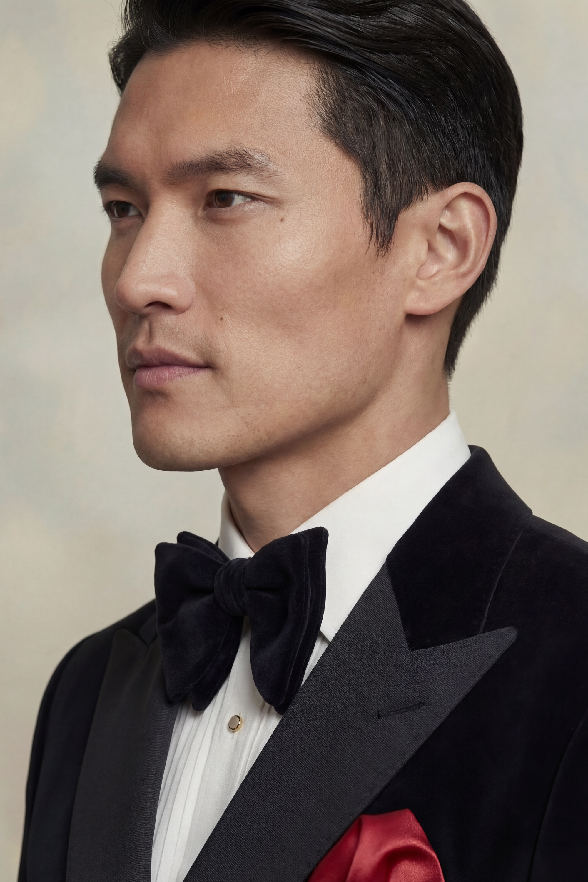 The Black Velvet Tuxedo Jacket boasts a slim-fit cut, tailored to perfection for a sophisticated and modern silhouette. Its elegant design is further heightened by a modern double-breasted closure featuring six buttons, exuding an air of timeless sophistication. The jacket’s wide peak collar adds a touch of refinement and modern flair, creating a captivating focal point.