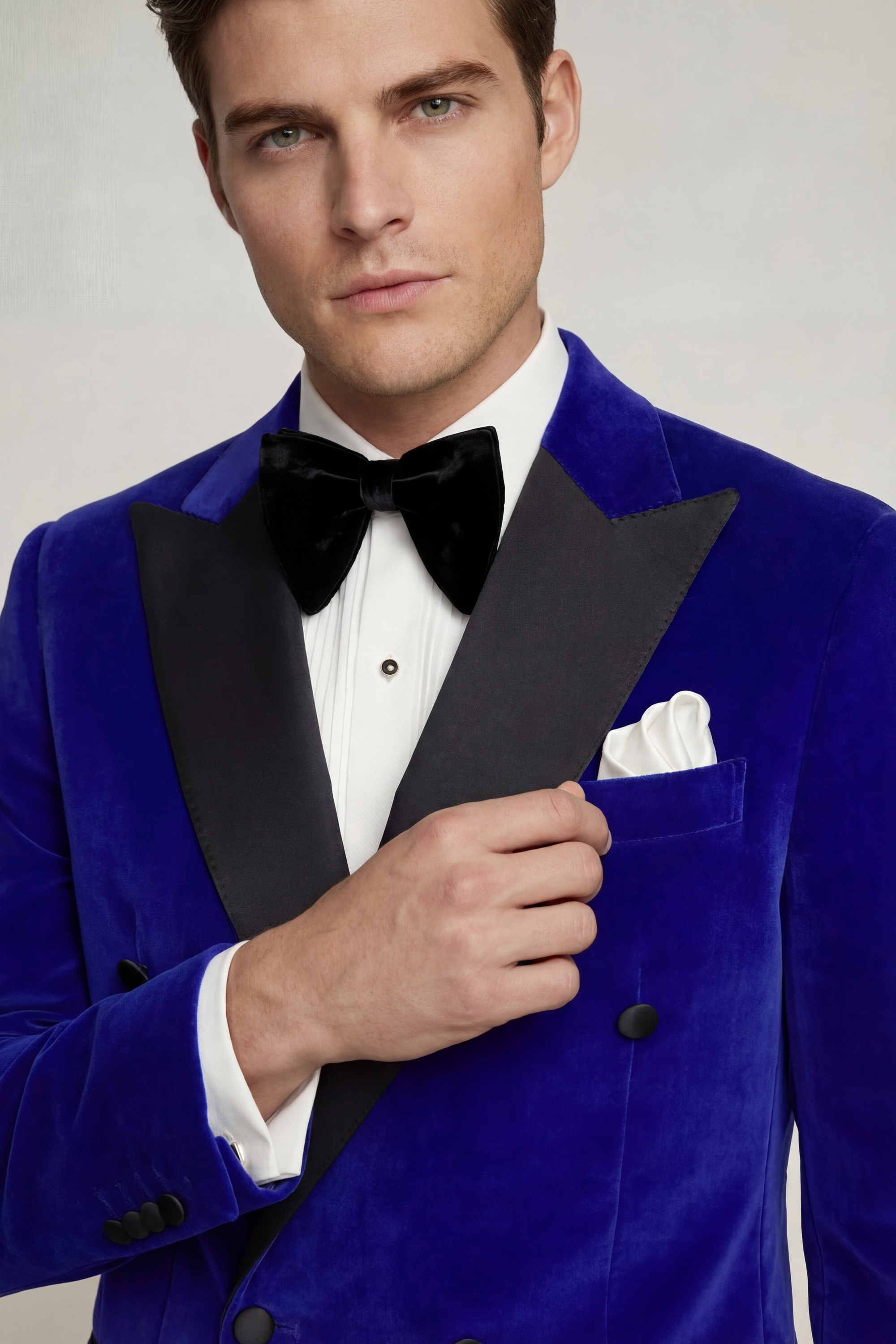 Introducing The Gentleman’s Guru Double Breasted Royal Blue Velvet Tuxedo Jacket – a true embodiment of opulence and contemporary elegance. Crafted with the utmost precision and attention to detail, this jacket is a testament to refined taste and impeccable craftsmanship, designed to make an indelible impression at upscale events and formal occasions.