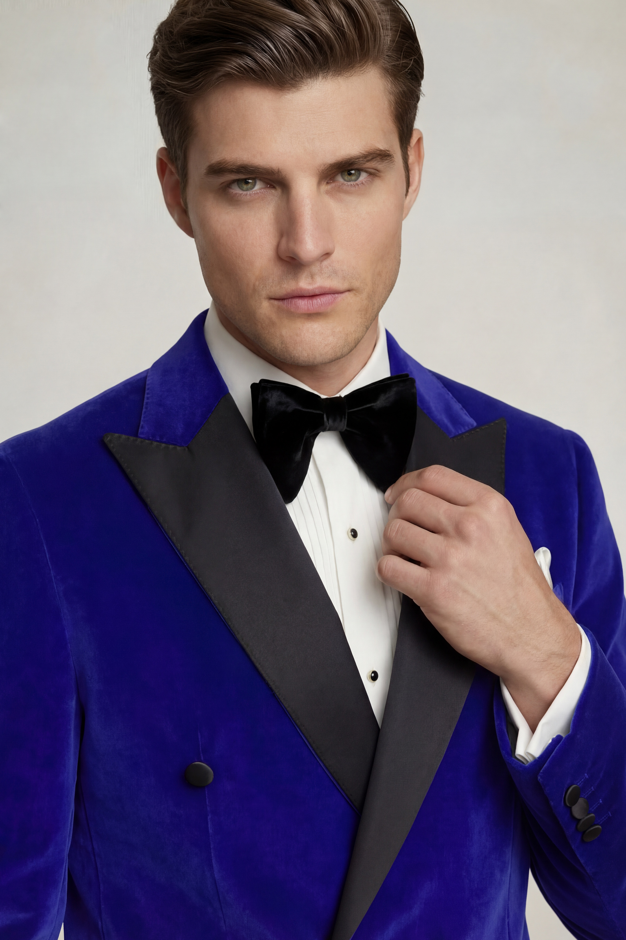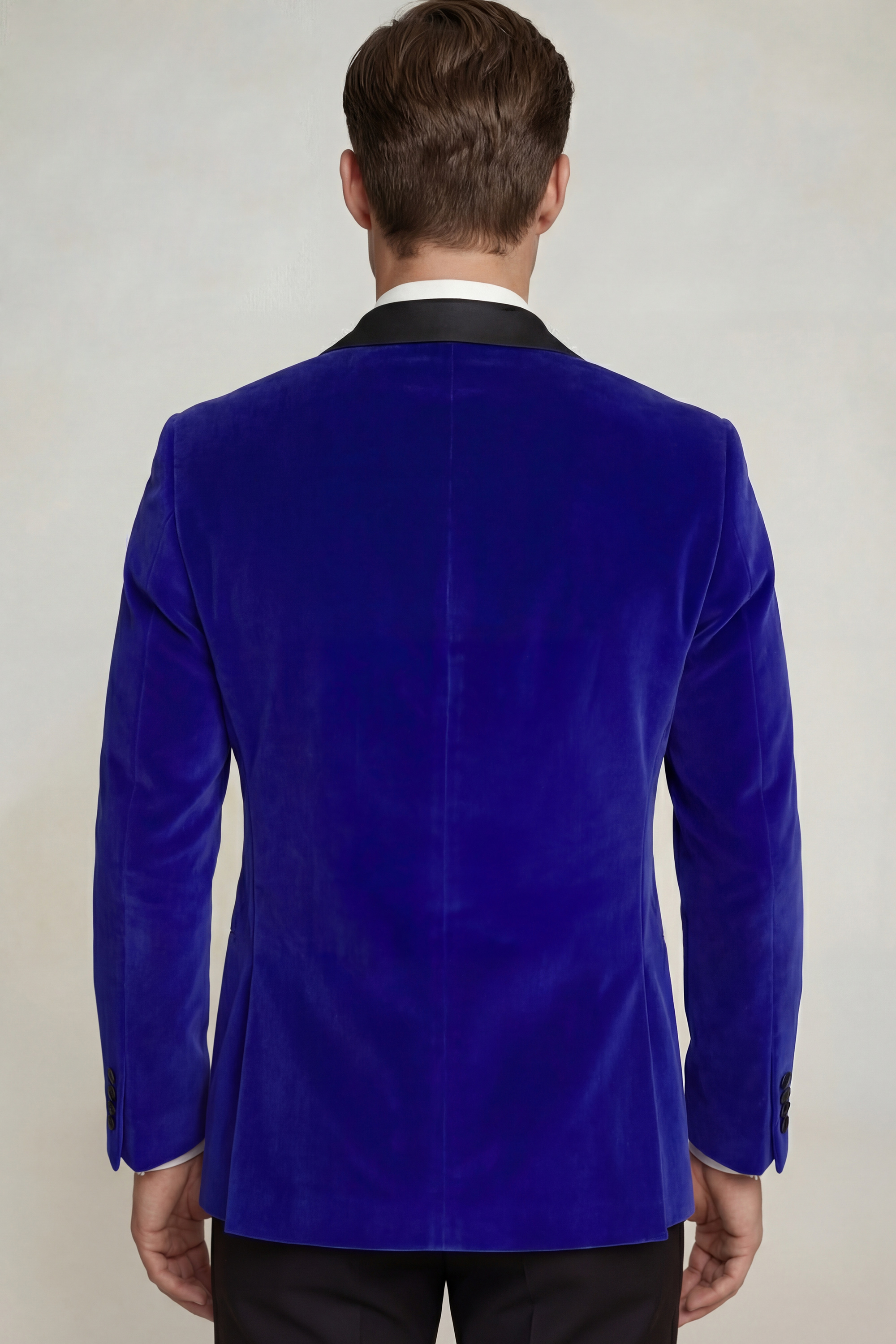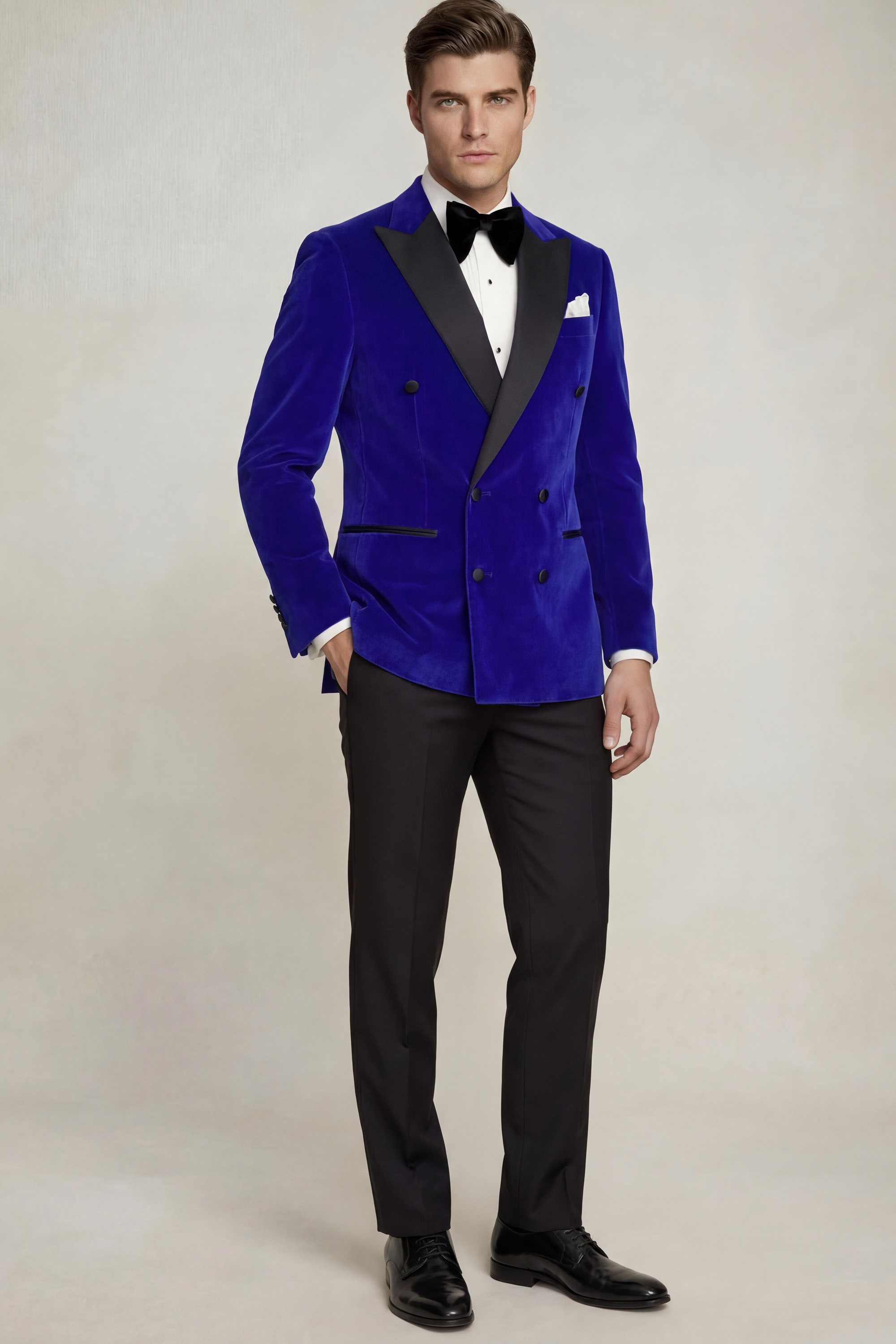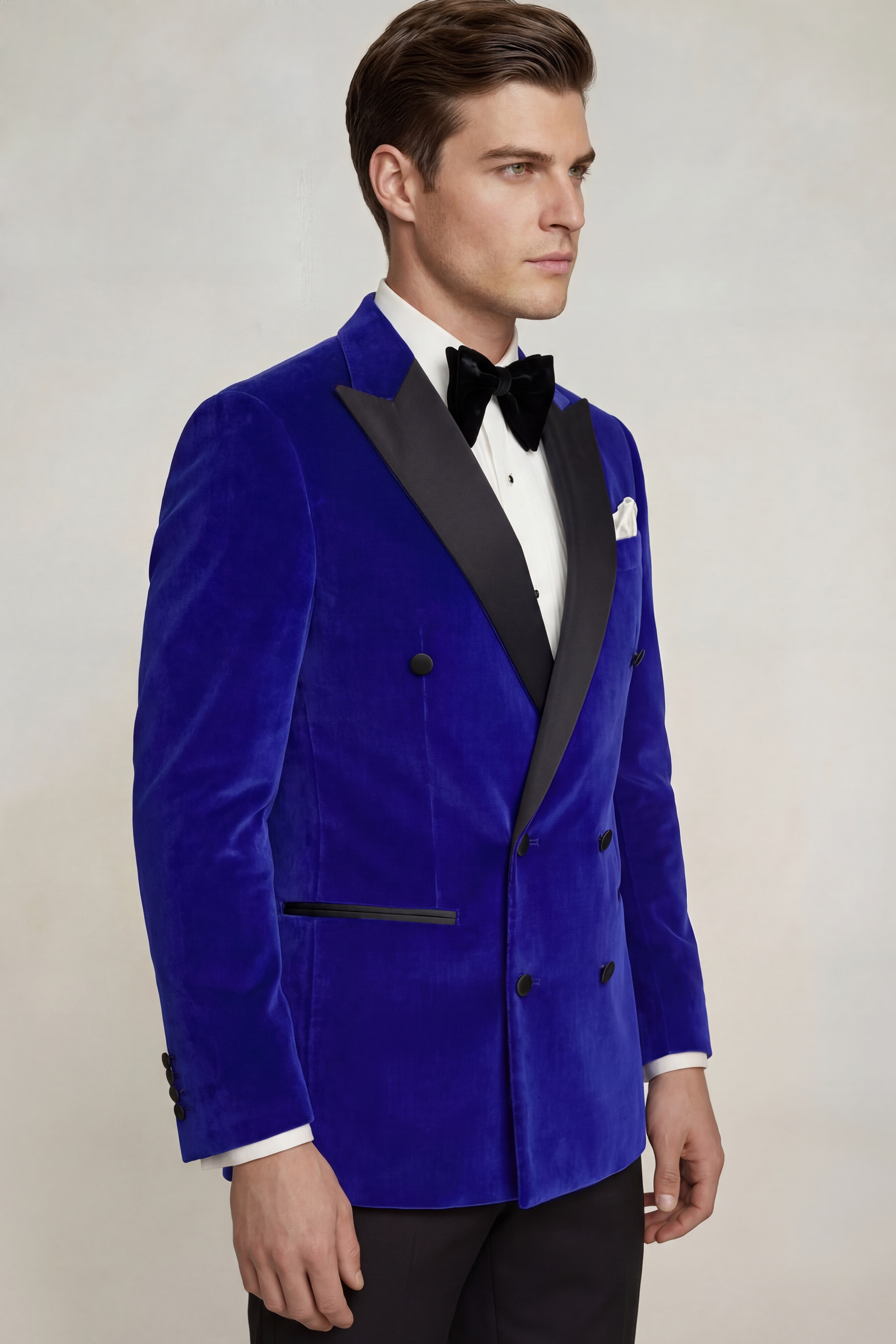 The Royal Blue Velvet Tuxedo Jacket boasts a slim-fit cut, tailored to perfection for a sophisticated and modern silhouette. Its elegant design is further heightened by a modern double-breasted closure featuring six buttons, exuding an air of timeless sophistication. The jacket’s wide peak collar adds a touch of refinement and modern flair, creating a captivating focal point.