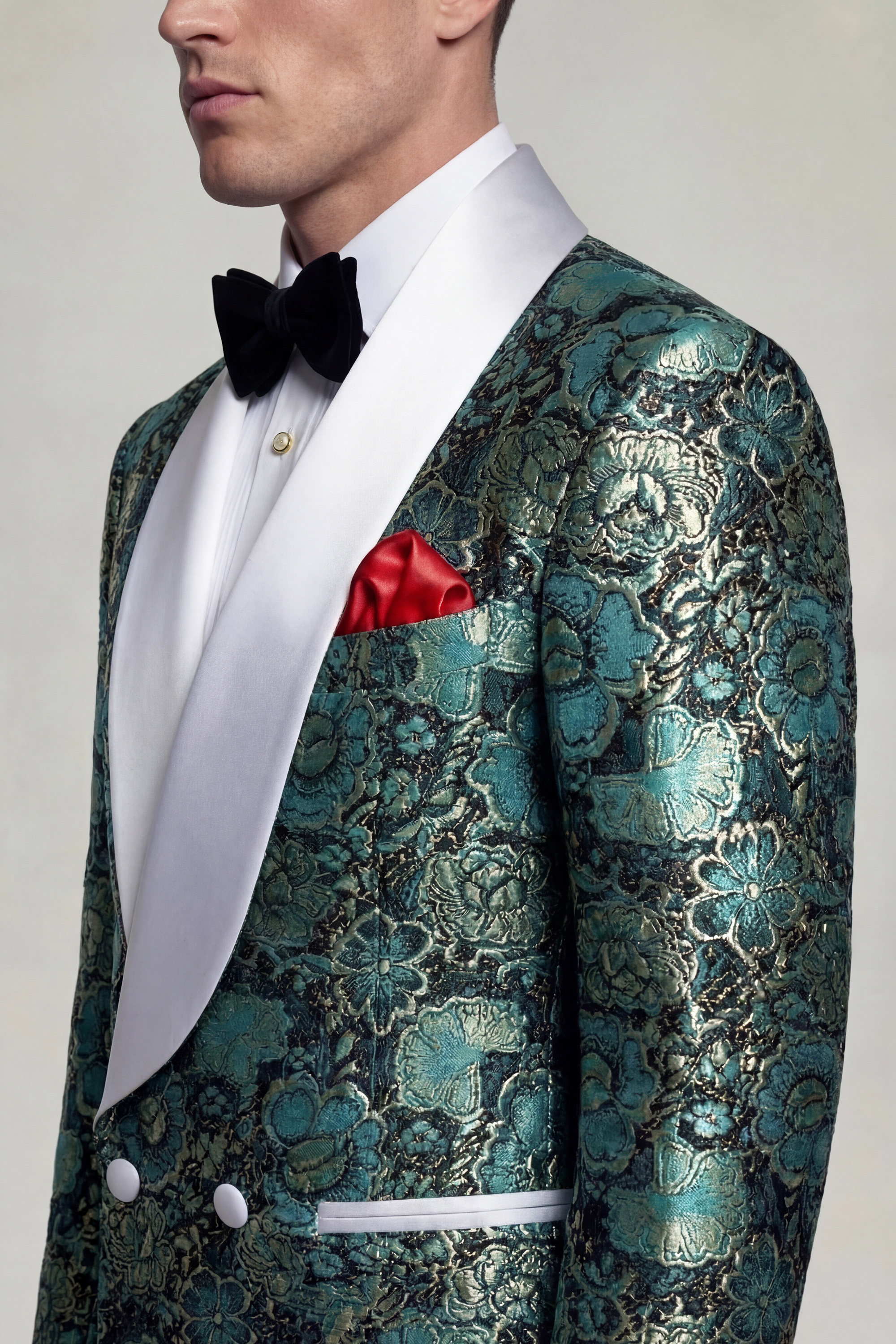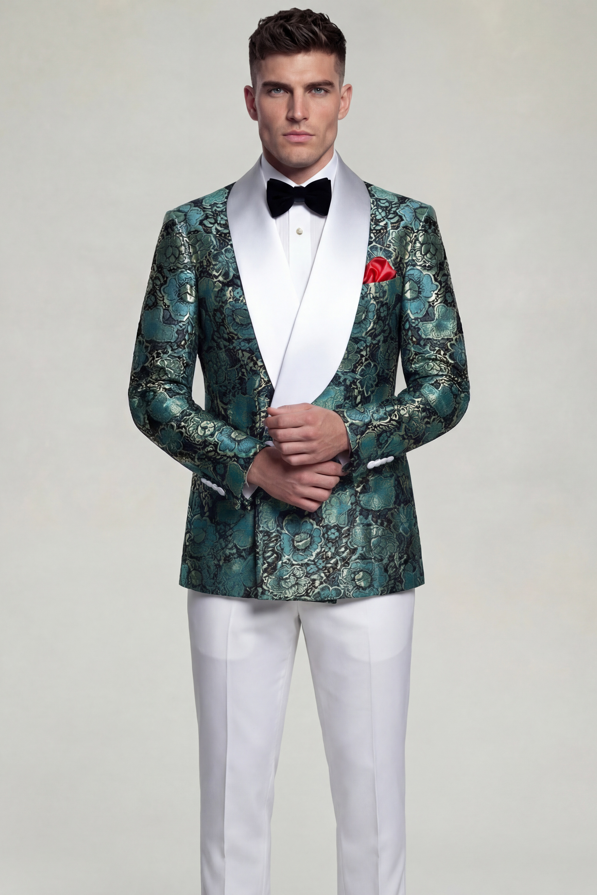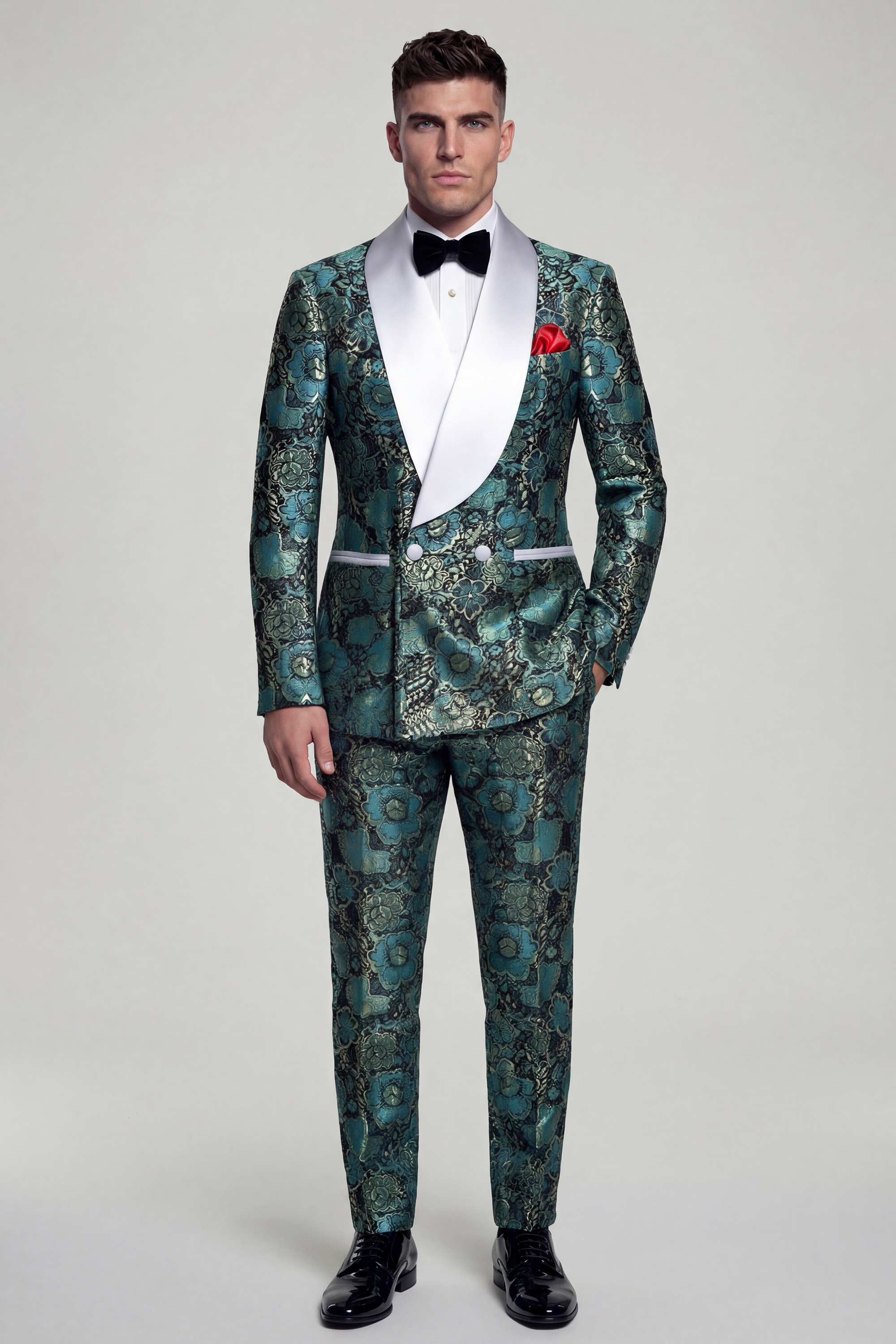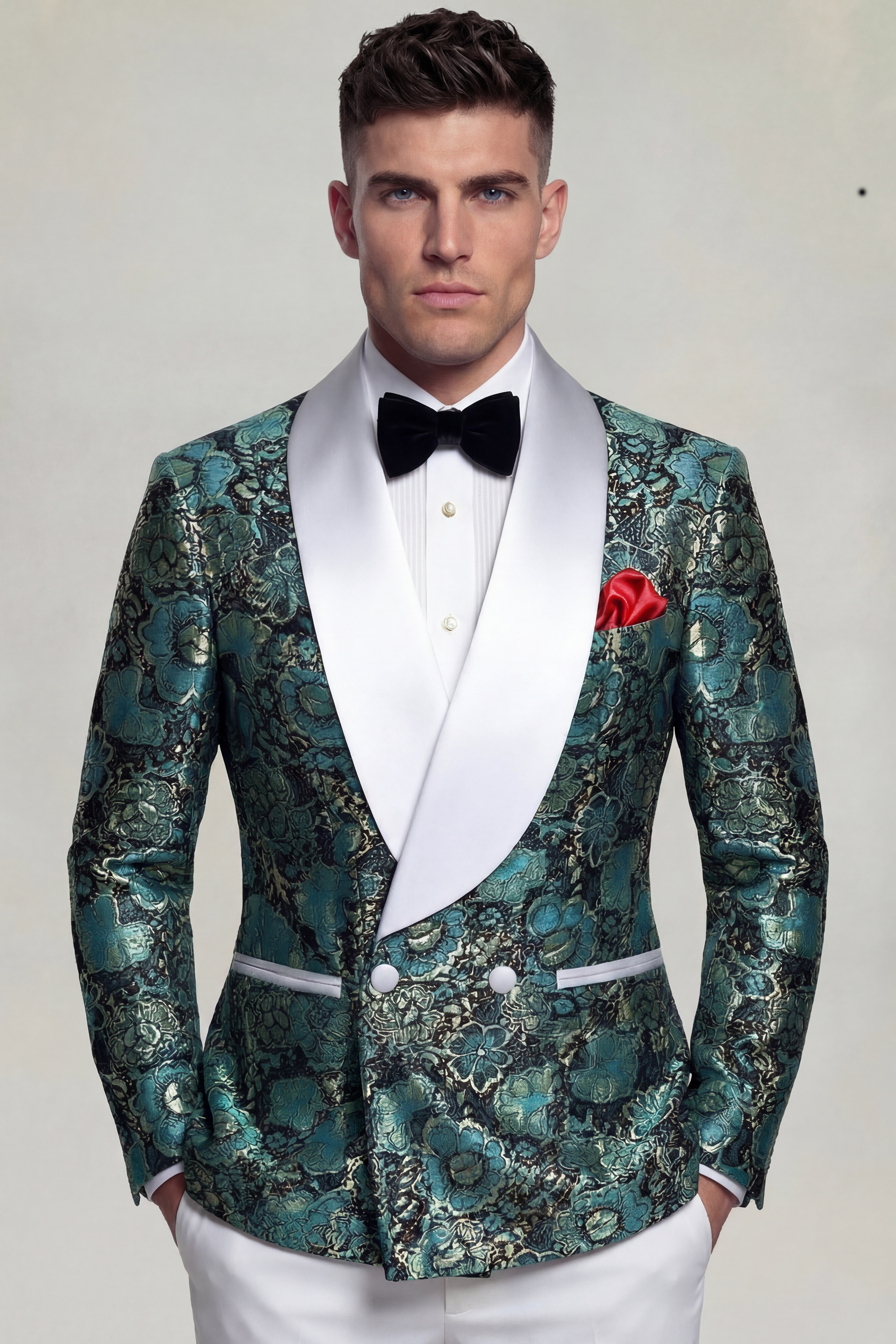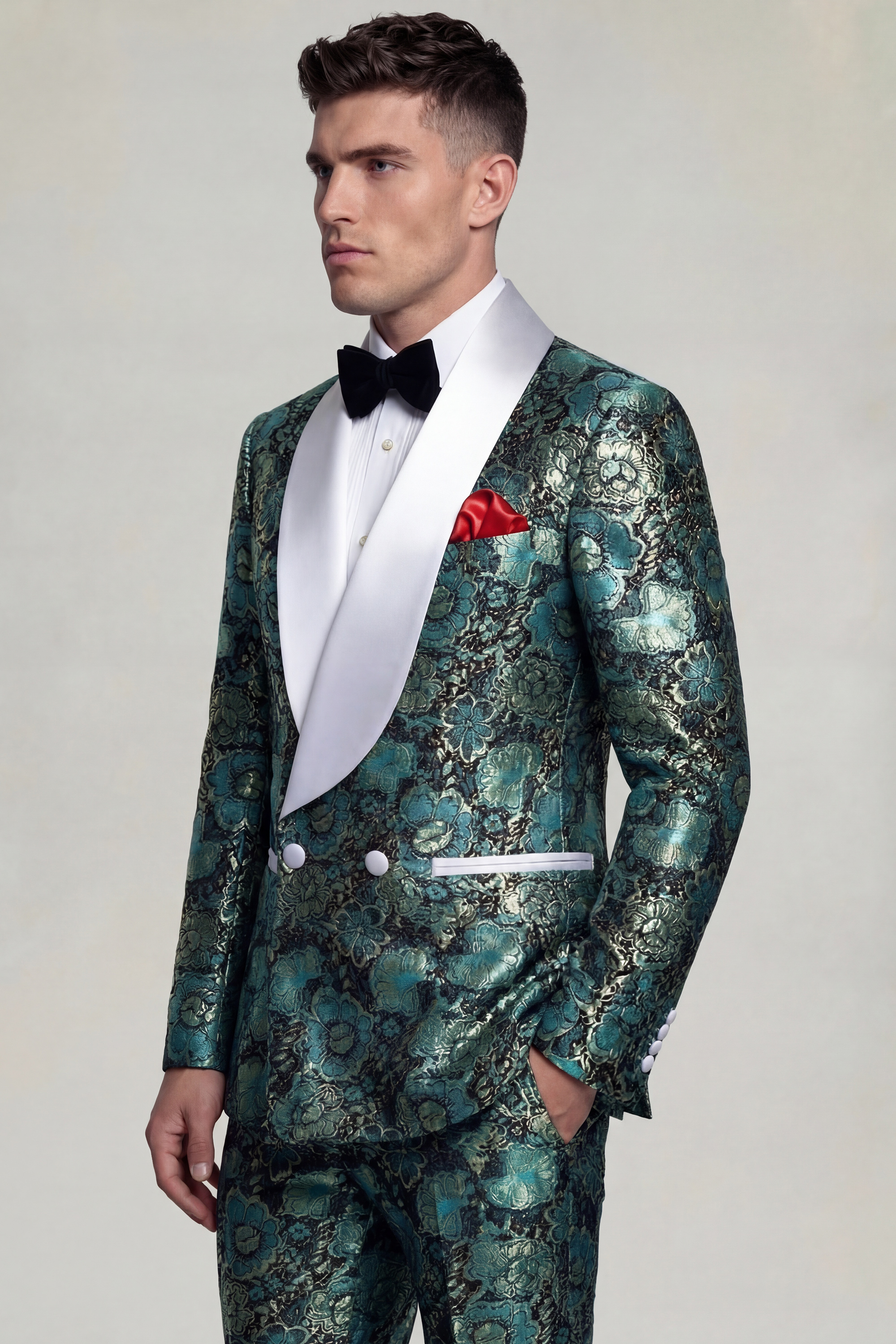 Ideal for weddings, gala events, upscale parties, and formal celebrations, the Double Breasted Teal Blue Green Floral Tuxedo – 2 Piece is designed for those who appreciate statement-making fashion while maintaining a refined and sophisticated edge.