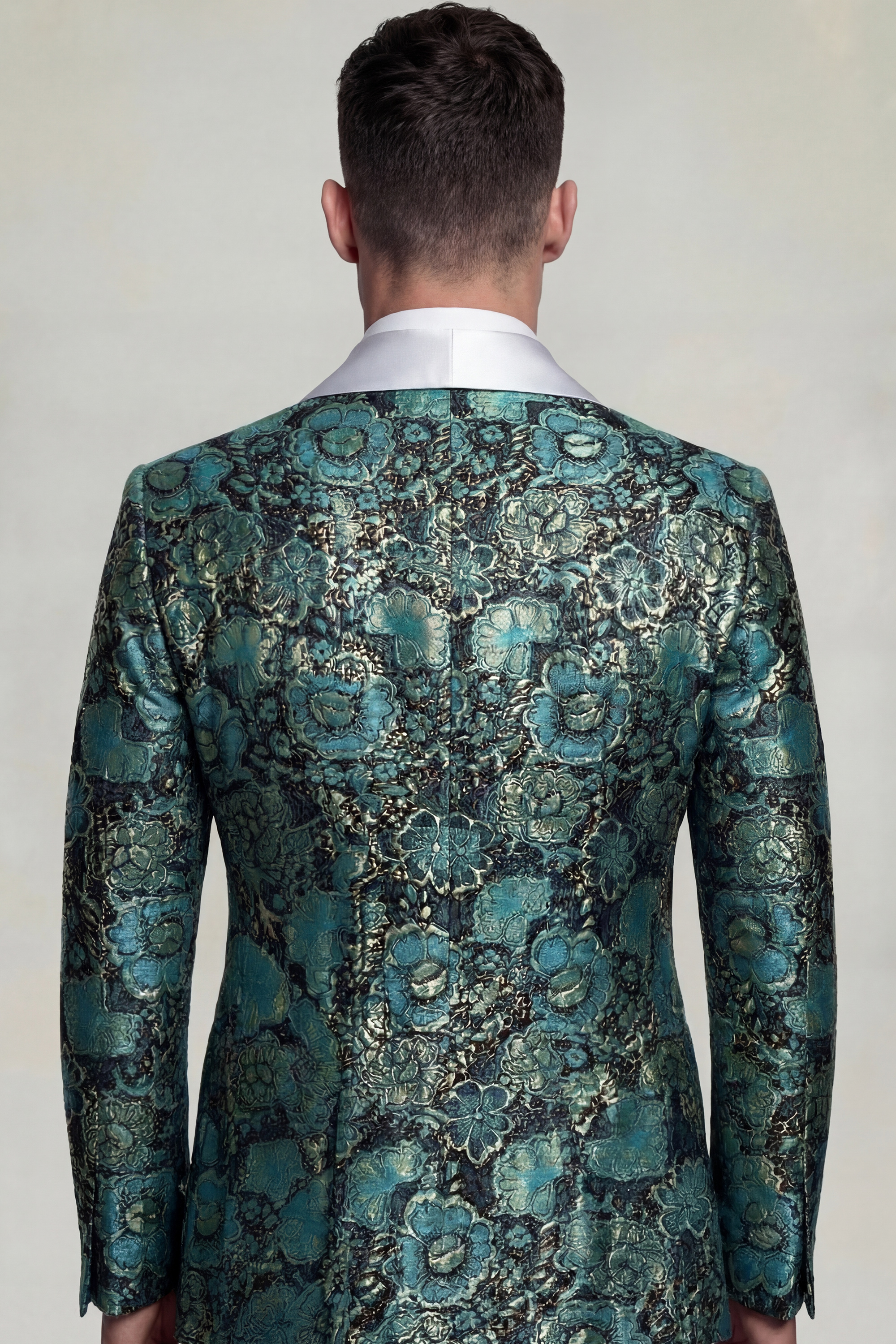 Tailored in a slim fit with a custom size option available, this ensemble offers a clean, structured silhouette that enhances both comfort and style. The fabric features a luxurious teal, blue, and green floral pattern with subtle gold undertones, creating depth and a visually captivating finish that elevates the entire look.