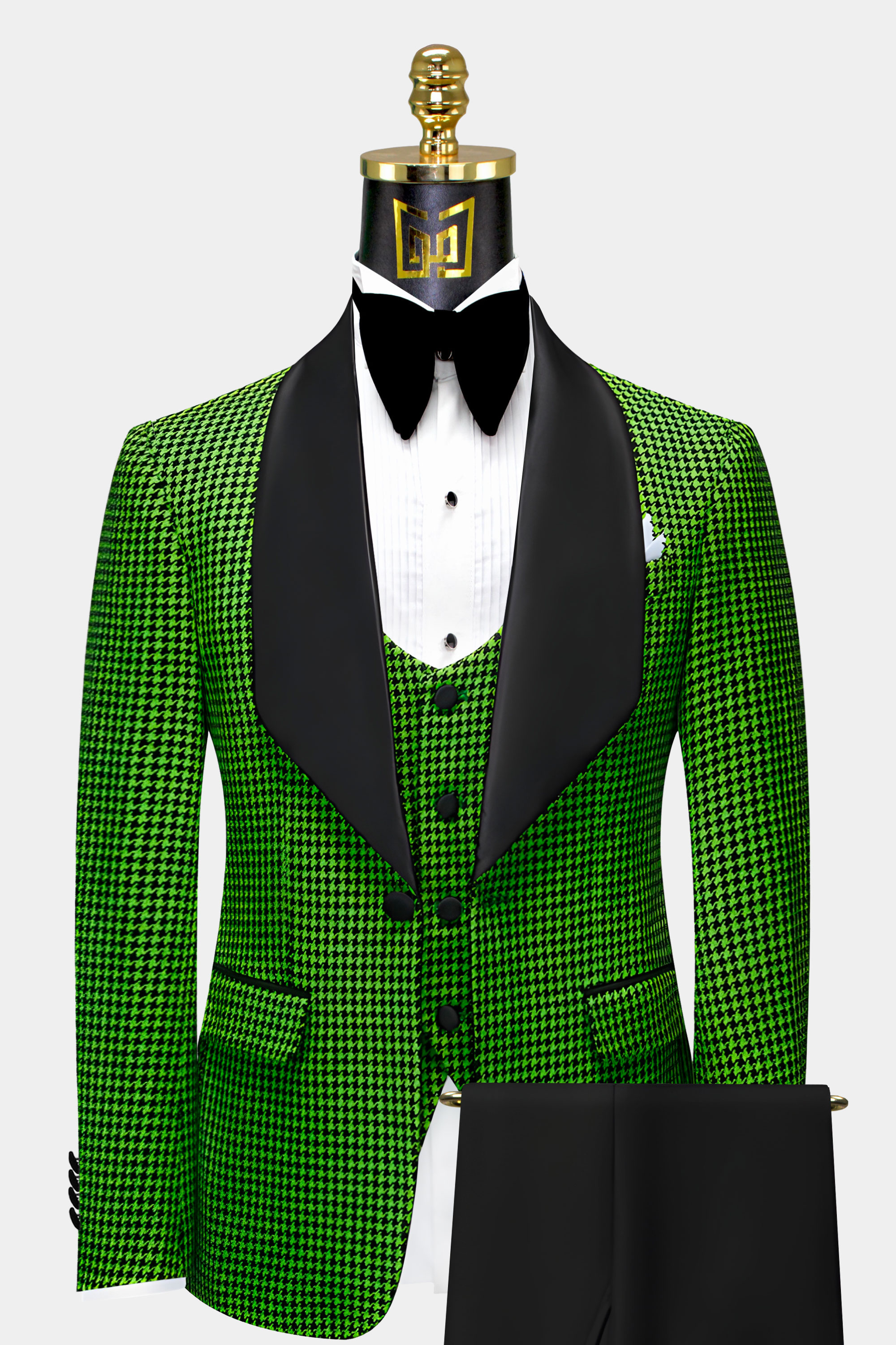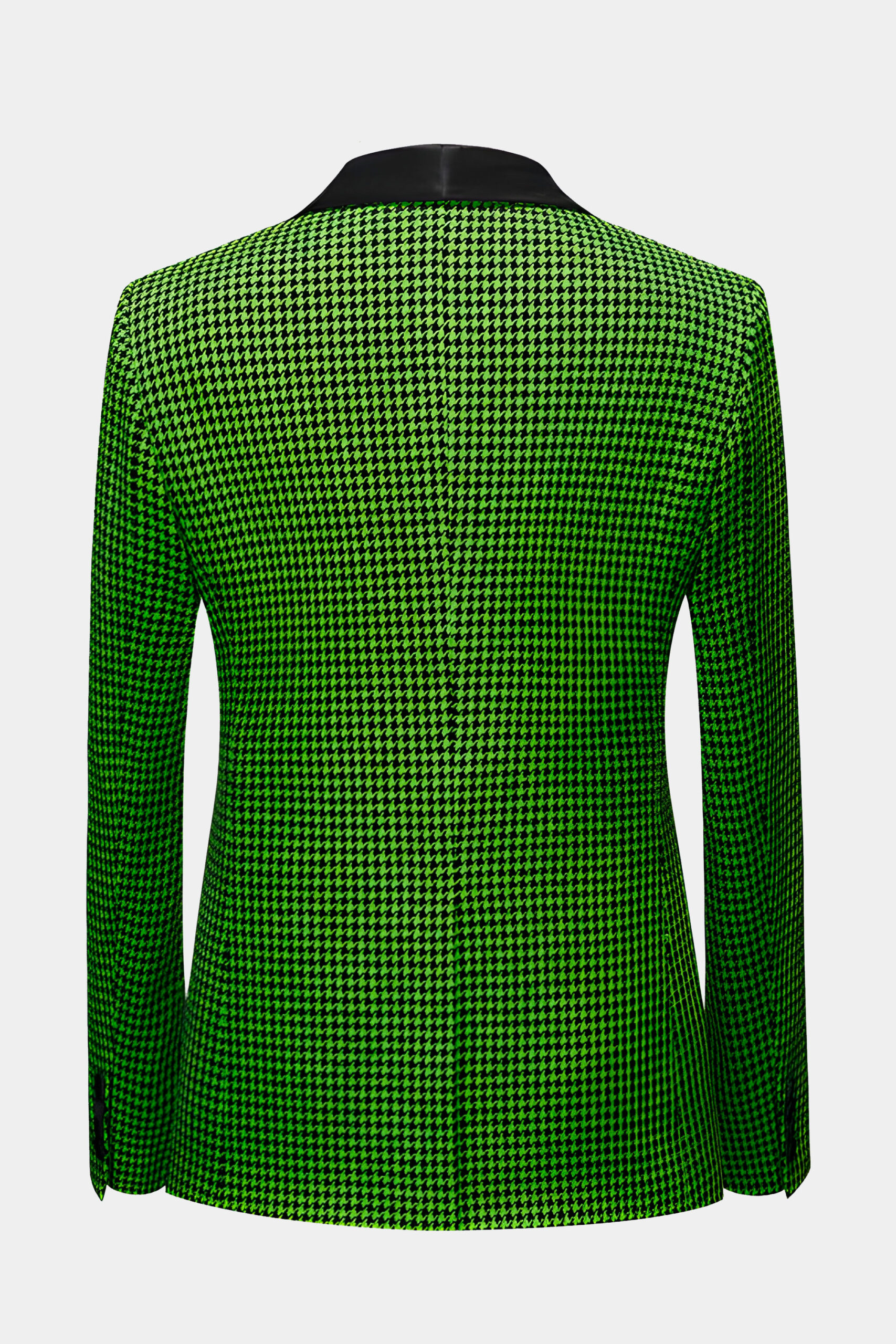 introducing The Gentleman’s Guru Green Houndstooth Tuxedo – 3 Piece, a sophisticated and stylish choice for the modern gentleman. With a slim fit cut, this tuxedo is designed to provide a flattering silhouette and can be custom-sized to ensure a perfect fit. The vintage green houndstooth pattern is a nod to traditional tailoring, while the modern single-breasted closure with a wide shawl lapel adds a touch of contemporary flair.