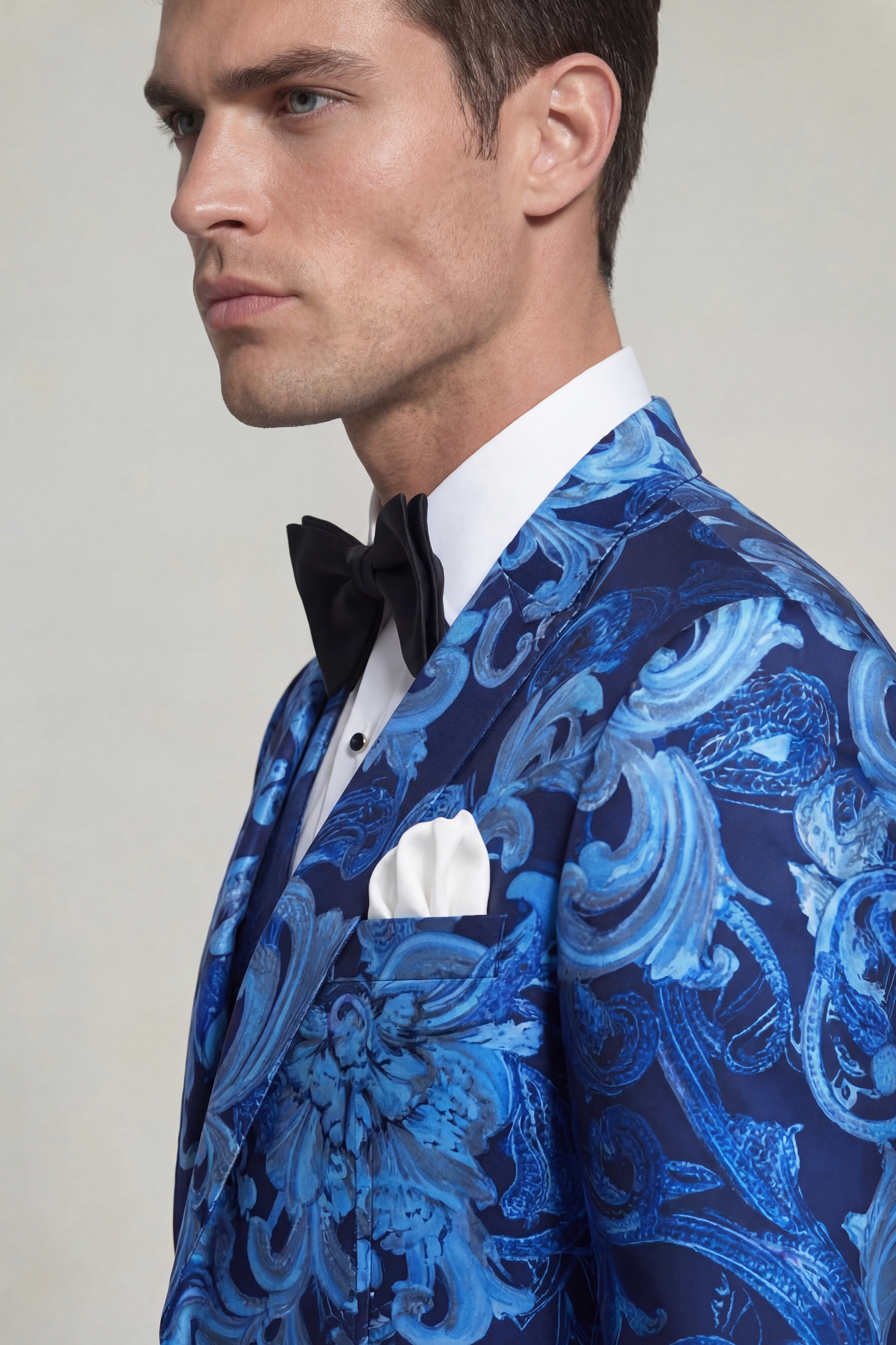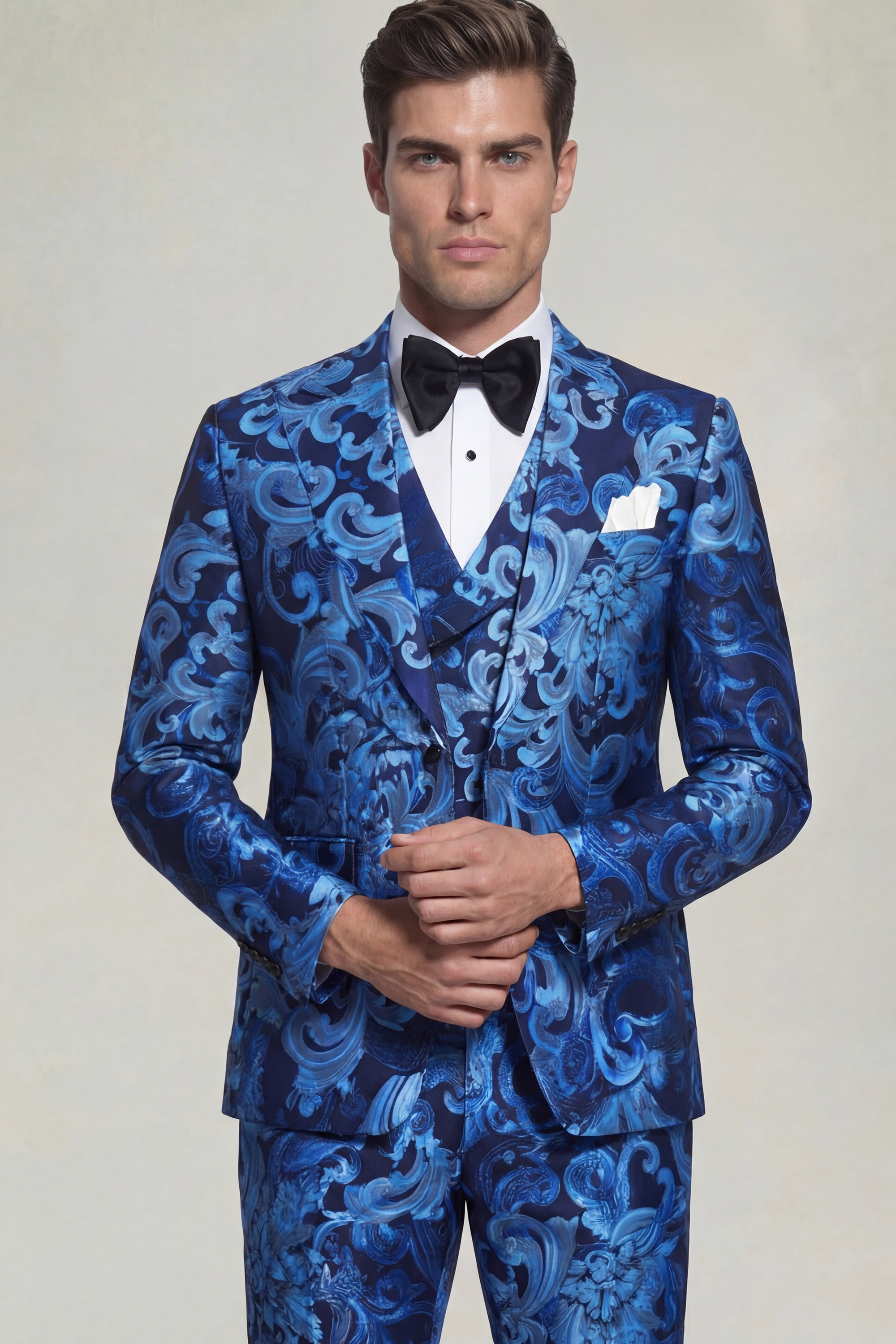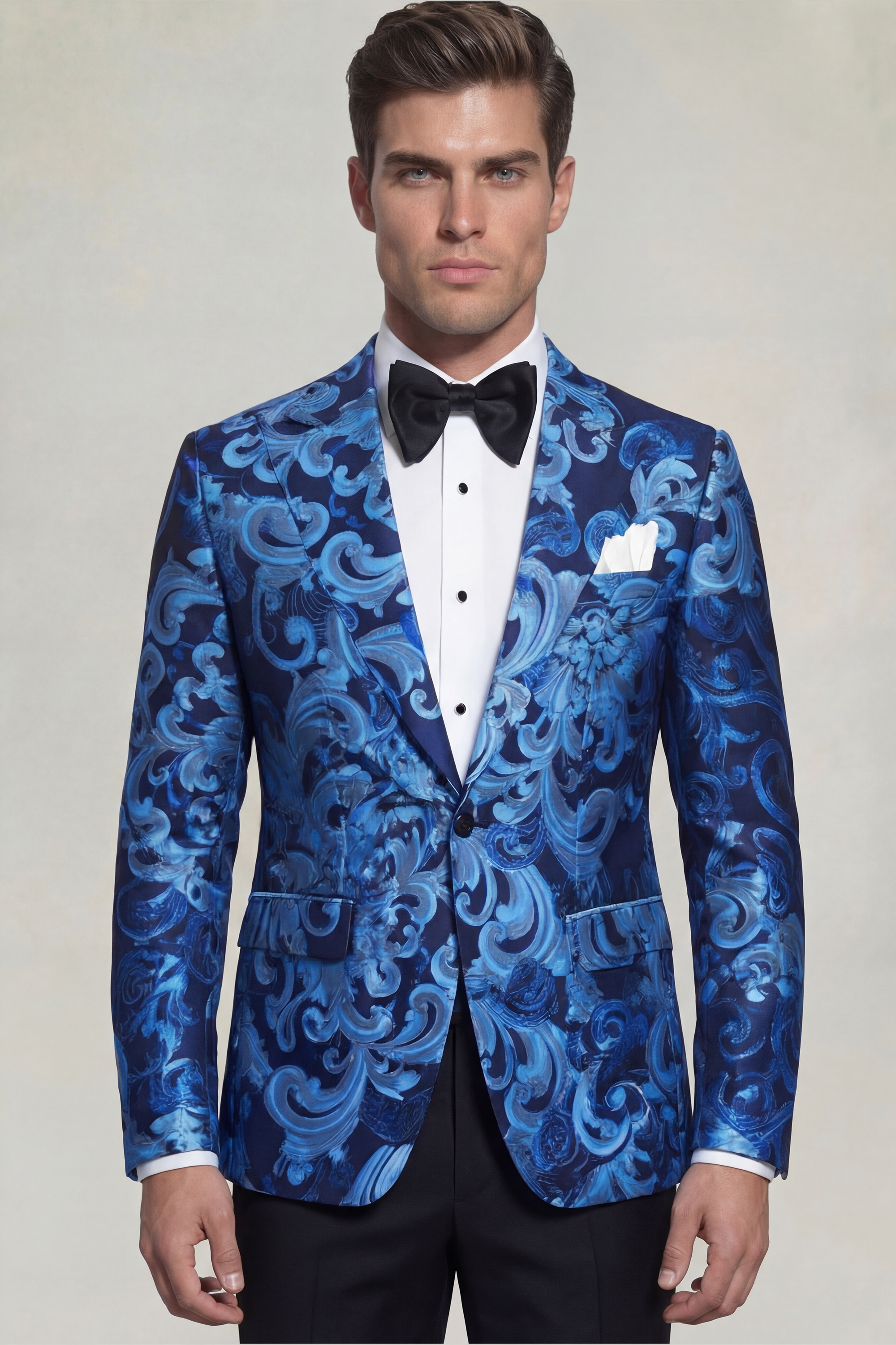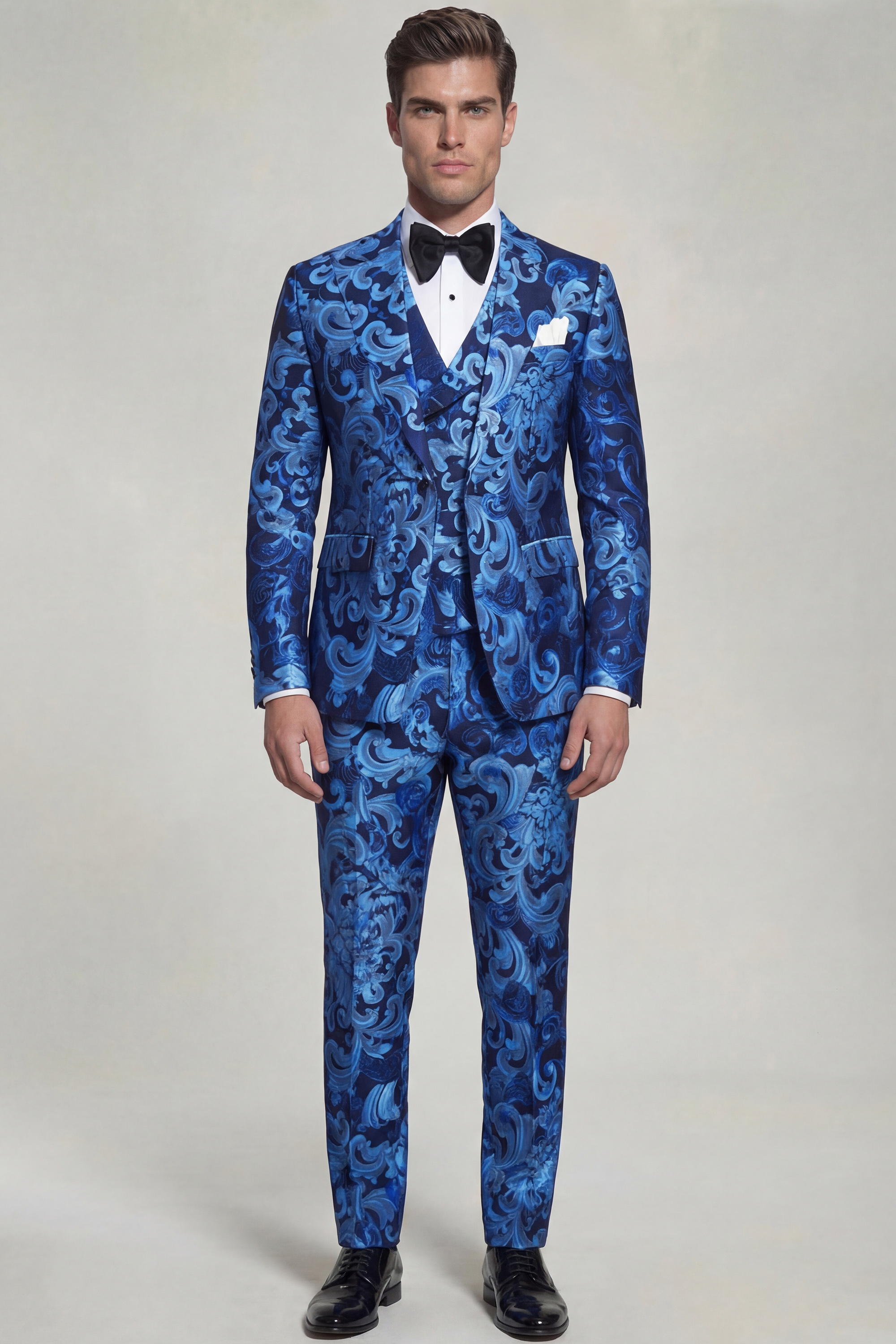 The light blue vintage baroque floral pattern on a deep dark blue backdrop adds a touch of captivating elegance to the suit. This exquisite and ornate design evokes a sense of refinement and opulence, making it an ideal choice for those who appreciate sophisticated aesthetics.