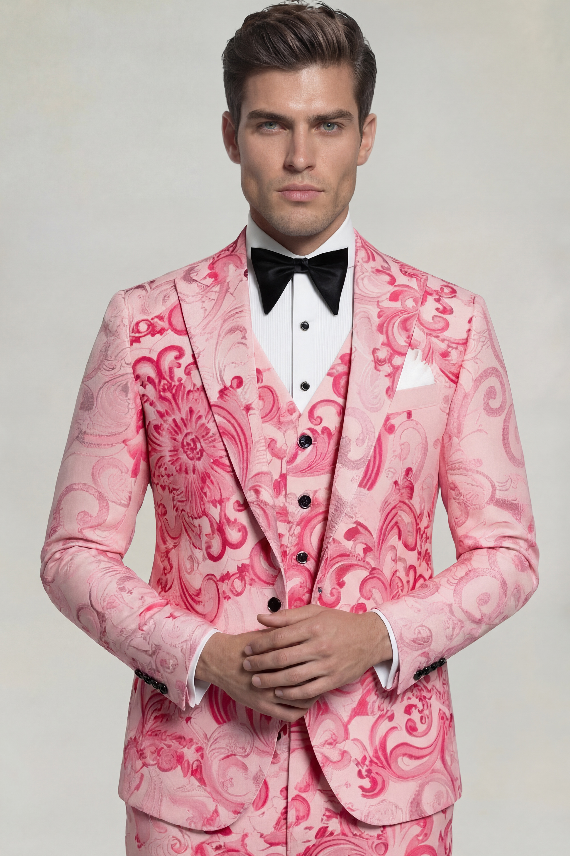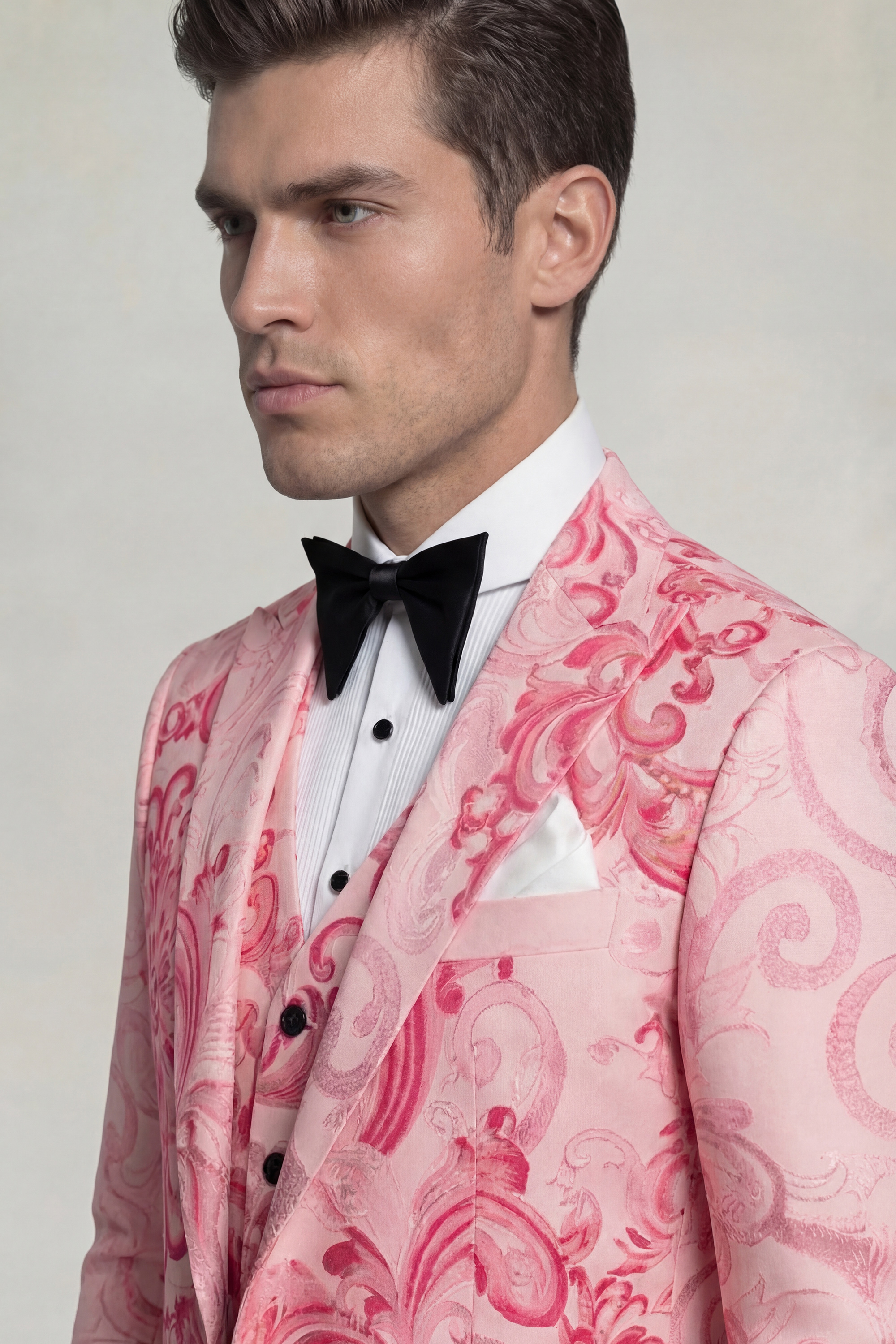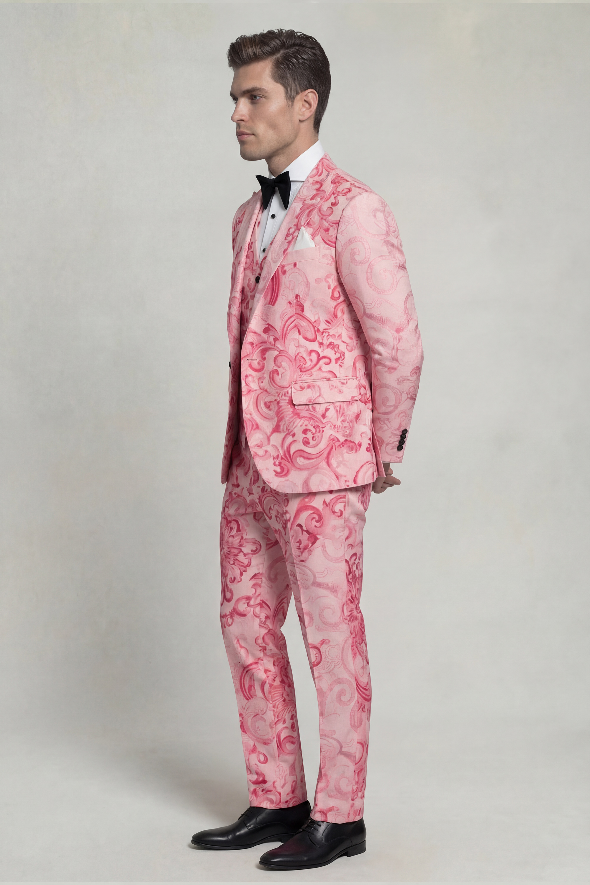 The light pink vintage baroque floral pattern on a deep light pink backdrop adds a touch of captivating elegance to the suit. This exquisite and ornate design evokes a sense of refinement and opulence, making it an ideal choice for those who appreciate sophisticated aesthetics.