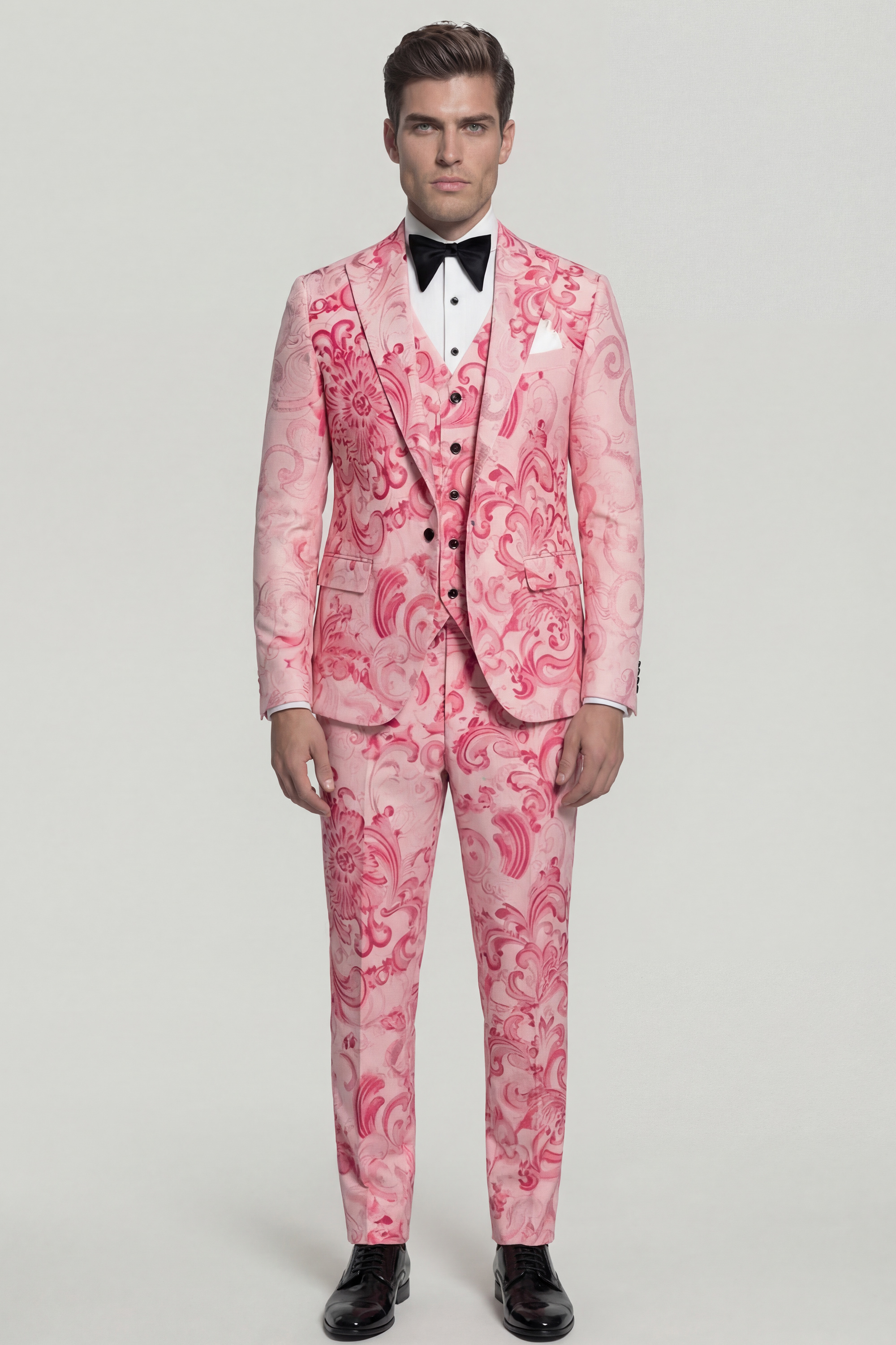 The Gentleman’s Guru Baroque Men’s Pink Floral Suit – 3 Piece is a masterpiece that seamlessly merges modern sophistication with timeless elegance. With its slim-fit cut, vintage baroque floral pattern, modern single-breasted closure, and luxurious fabric blend, this suit epitomizes the essence of refined style with a touch of opulence. Whether you’re attending a wedding, gala, or any formal event, this suit will elevate your presence with its distinctive charm and captivating allure. Choose The Gentleman’s Guru and embrace the pinnacle of sartorial excellence.