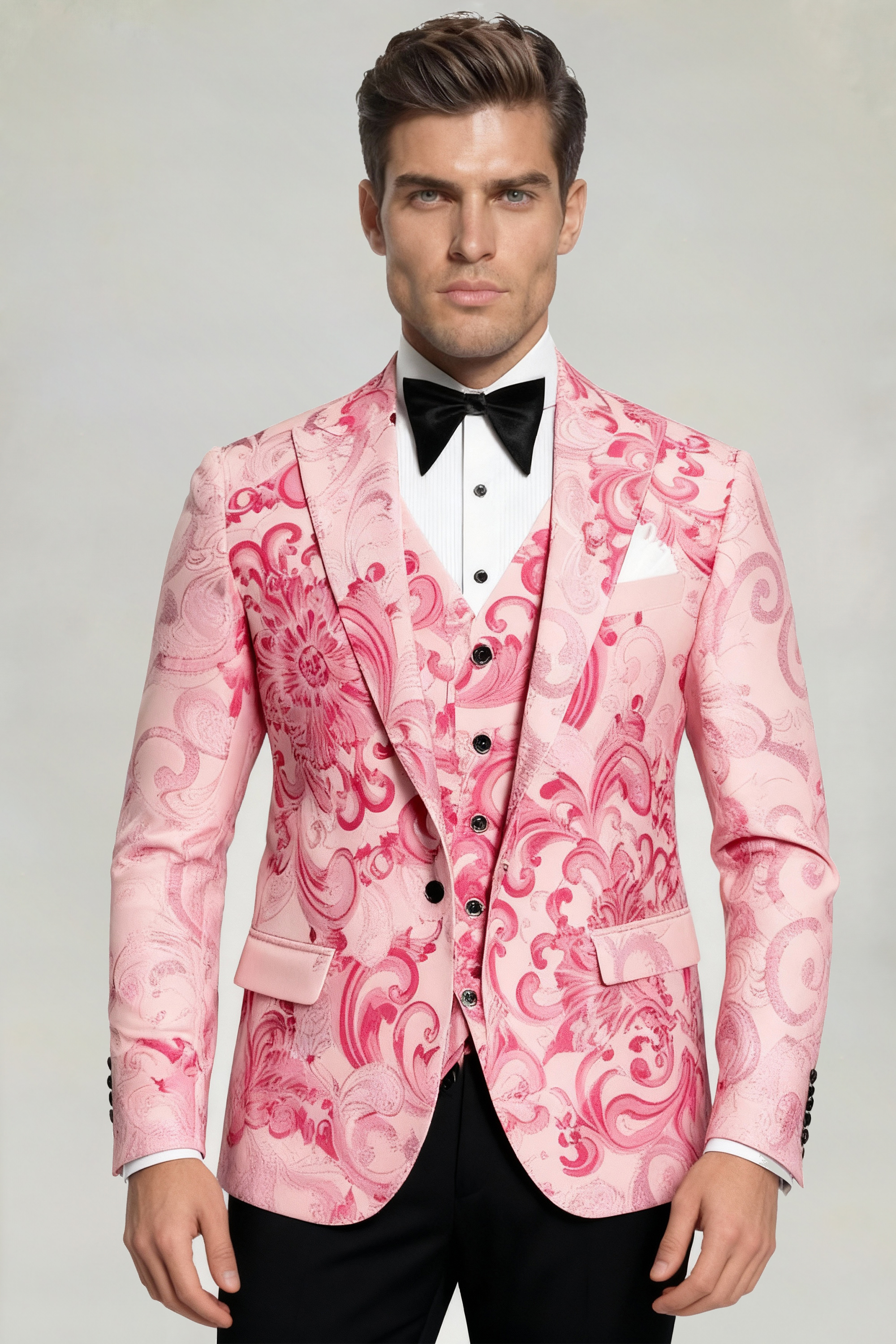 The 3 Piece Baroque Men’s Pink Floral Suit comes complete with matching pants that perfectly complement the jacket and vest. Additionally, we offer a solid black pants option, providing you with the flexibility to create different looks and styles effortlessly.