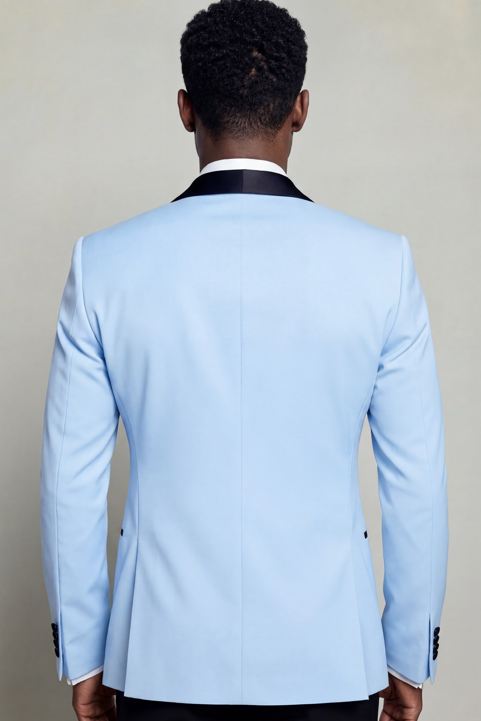 Tailored in a slim fit with a custom size option available, this tuxedo is crafted to provide a clean, structured silhouette that enhances the natural form while ensuring all-day comfort. The fabric features a smooth light blue backdrop, offering a crisp and elevated look that stands out with subtle confidence.