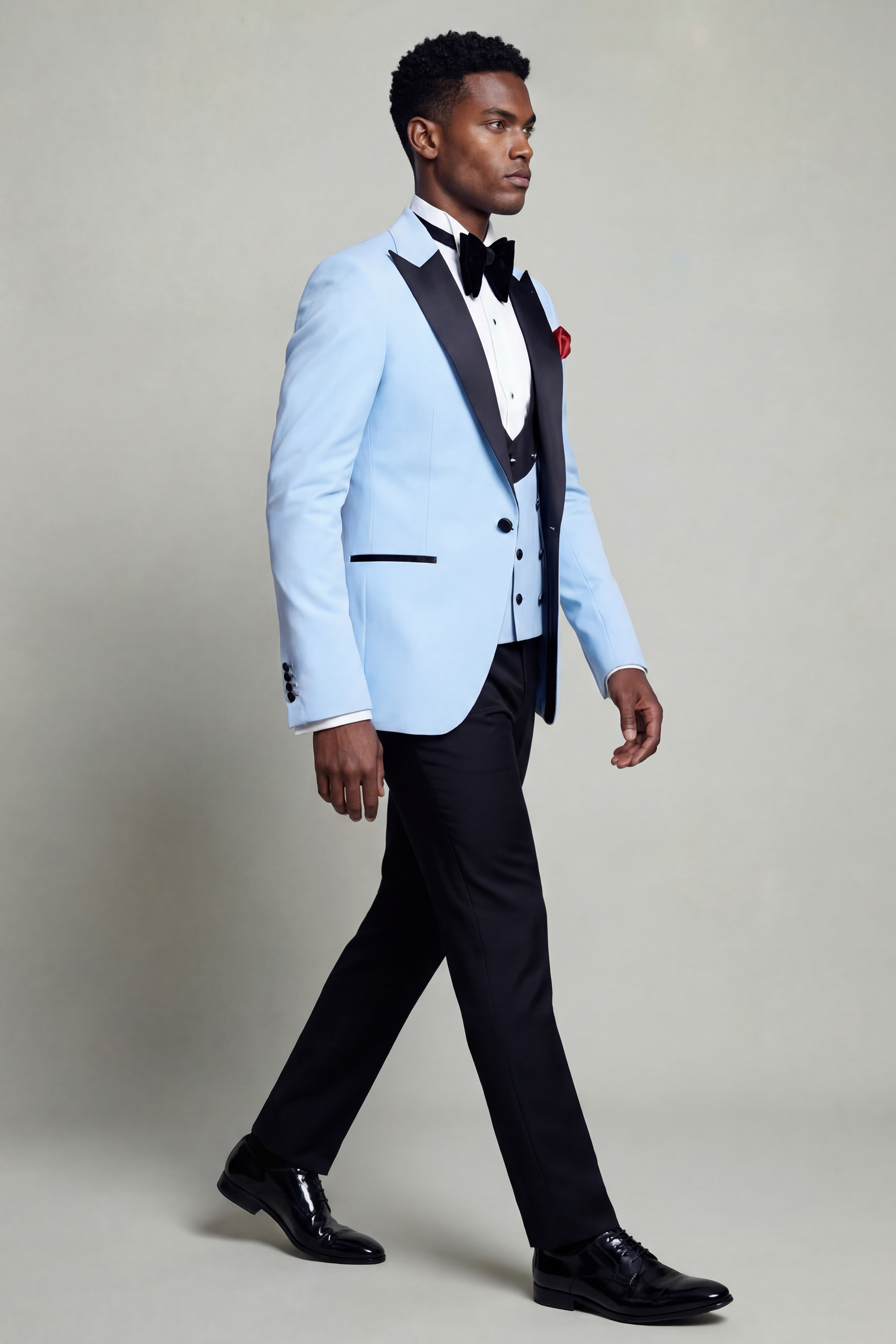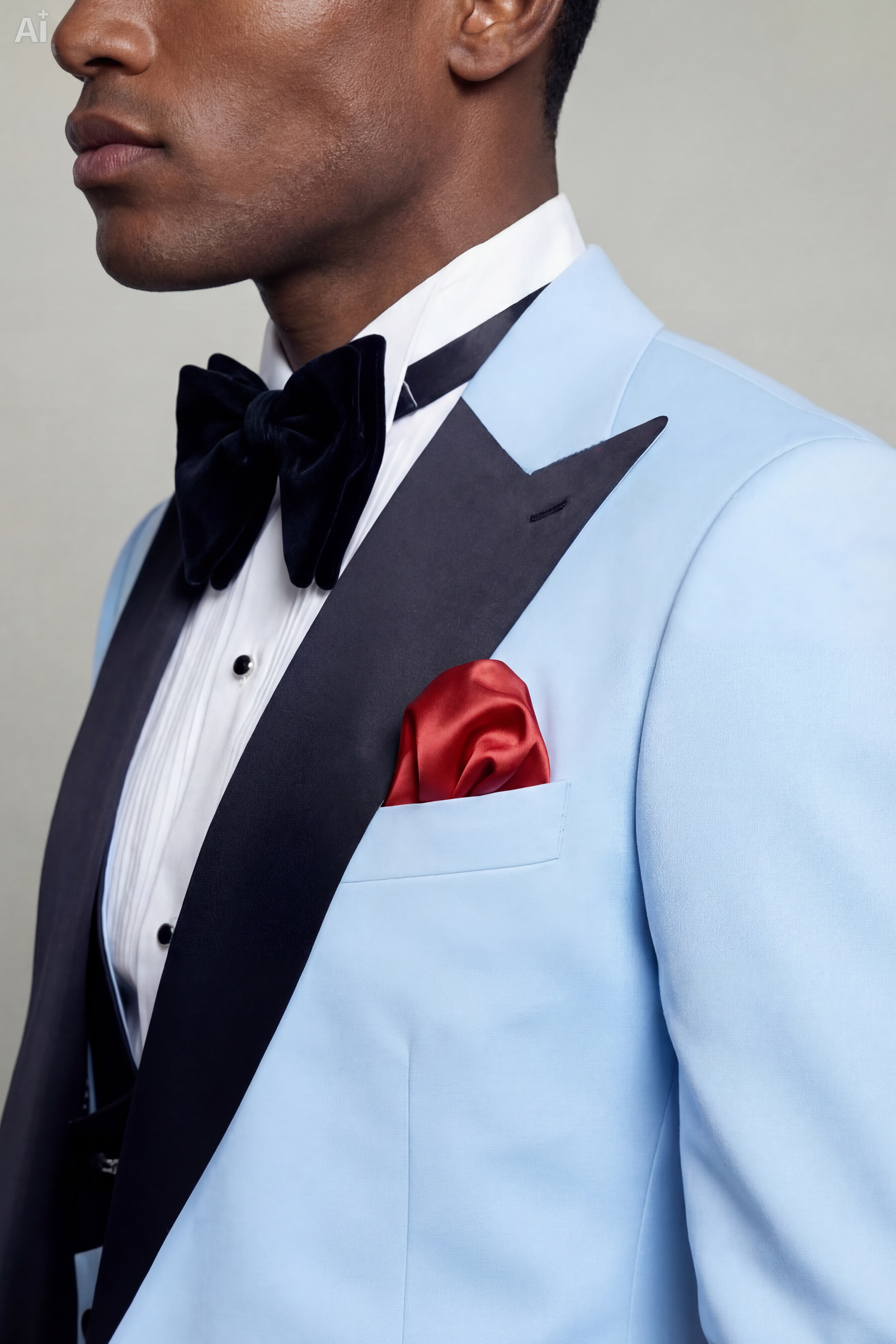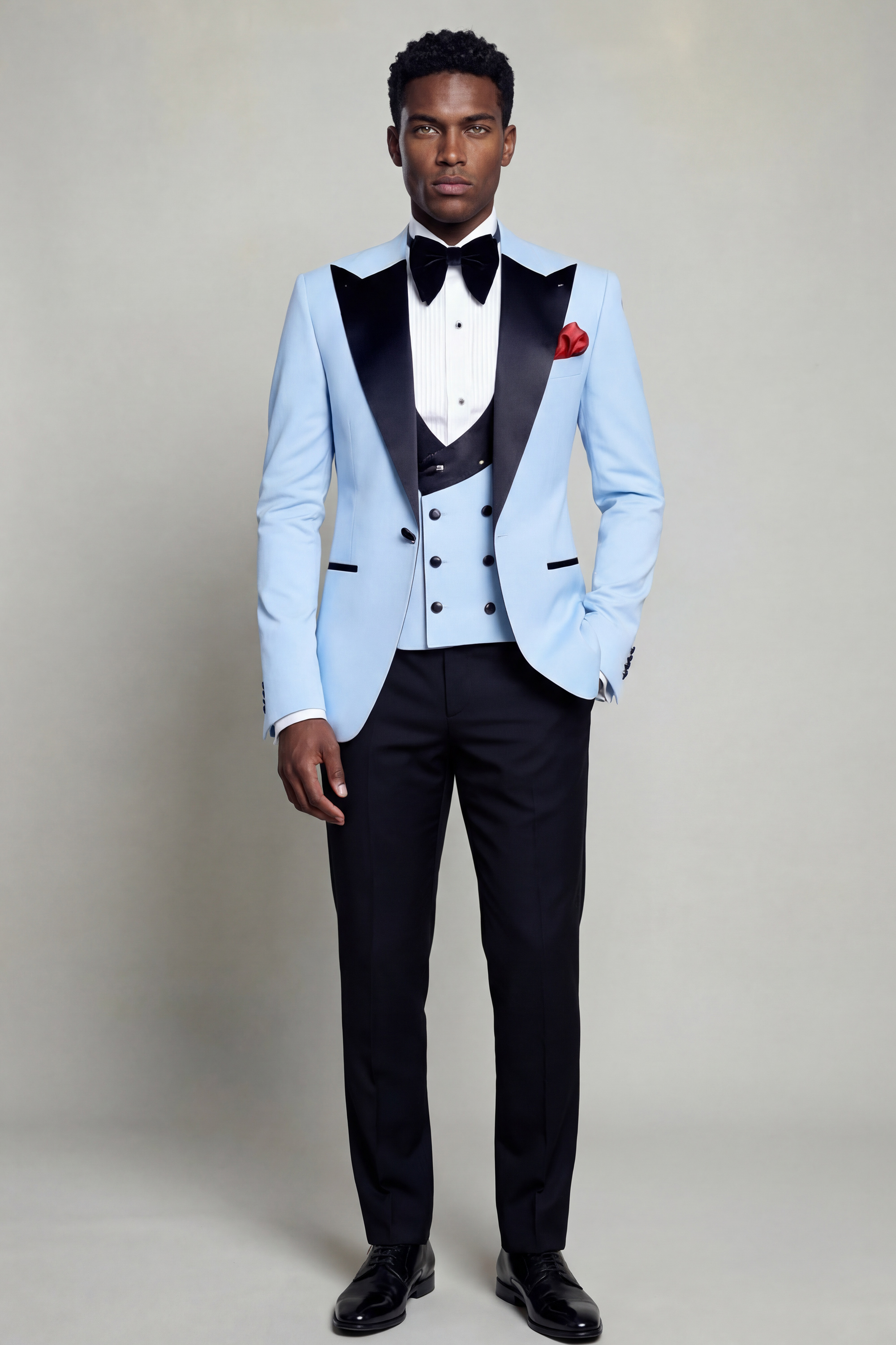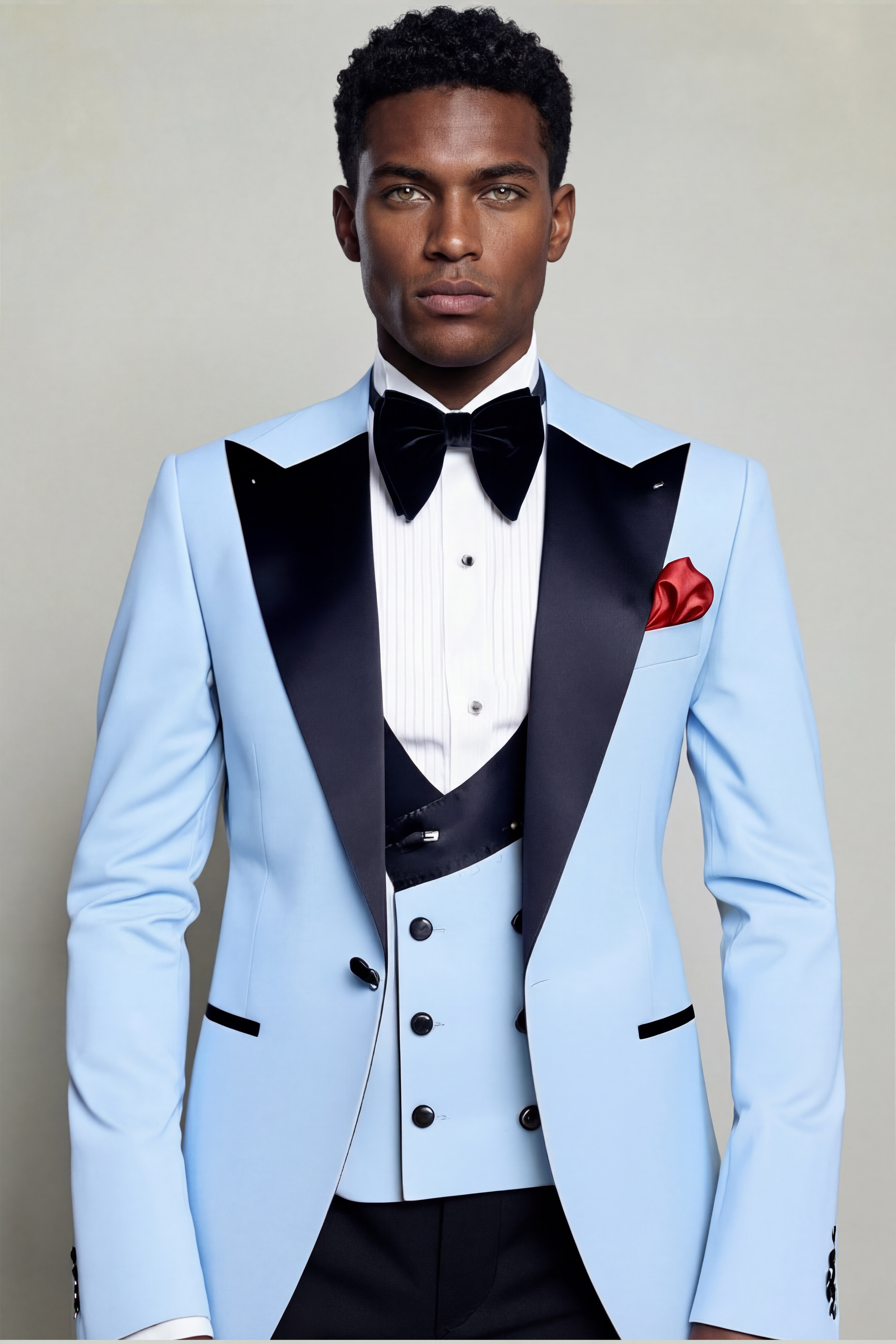 Make a refined statement at your next formal occasion with The Gentleman’s Guru Modern Light Blue Peak Lapel Tuxedo, a sophisticated three-piece ensemble that blends contemporary elegance with fresh, modern color. Designed for the gentleman who appreciates distinctive style without compromising refinement, this tuxedo delivers a polished and memorable presence.