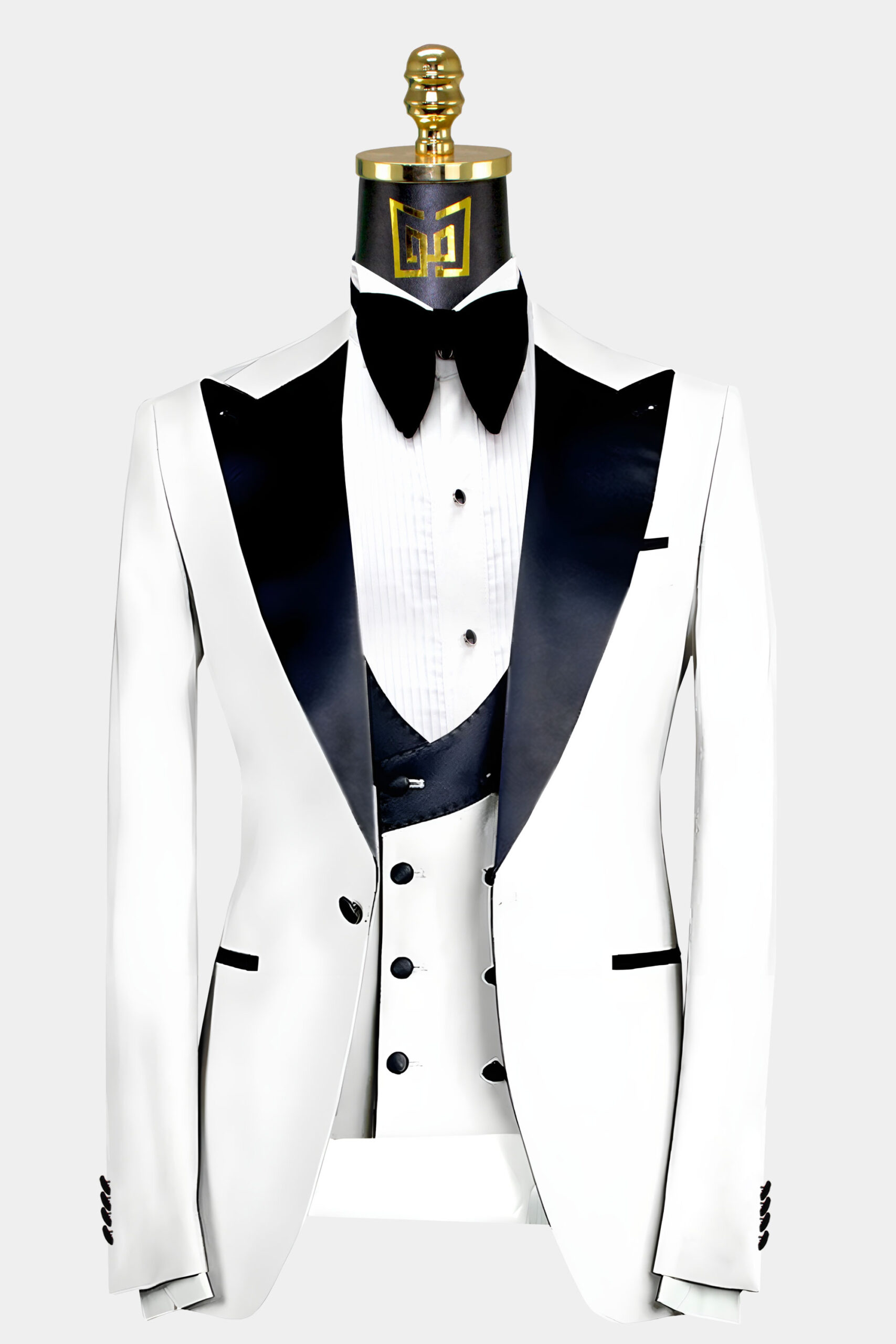This modern white peak lapel tuxedo is finely handcrafted from high-quality material, durable and timeless. The single-breasted white dinner jacket is fully lined and has three exterior pockets. The slim-fit jacket has two functional breast pockets, one interior and one exterior. The long-lasting fabric is comfortable and soft. This elegant white tux lets you stand out from the crowd but keeps that classic look. The black peak lapel and the design details have a subtle black satin finish that contrasts nicely with the white color. The classic design has a slim-fit cut that gives you a sleek and trimmer silhouette.