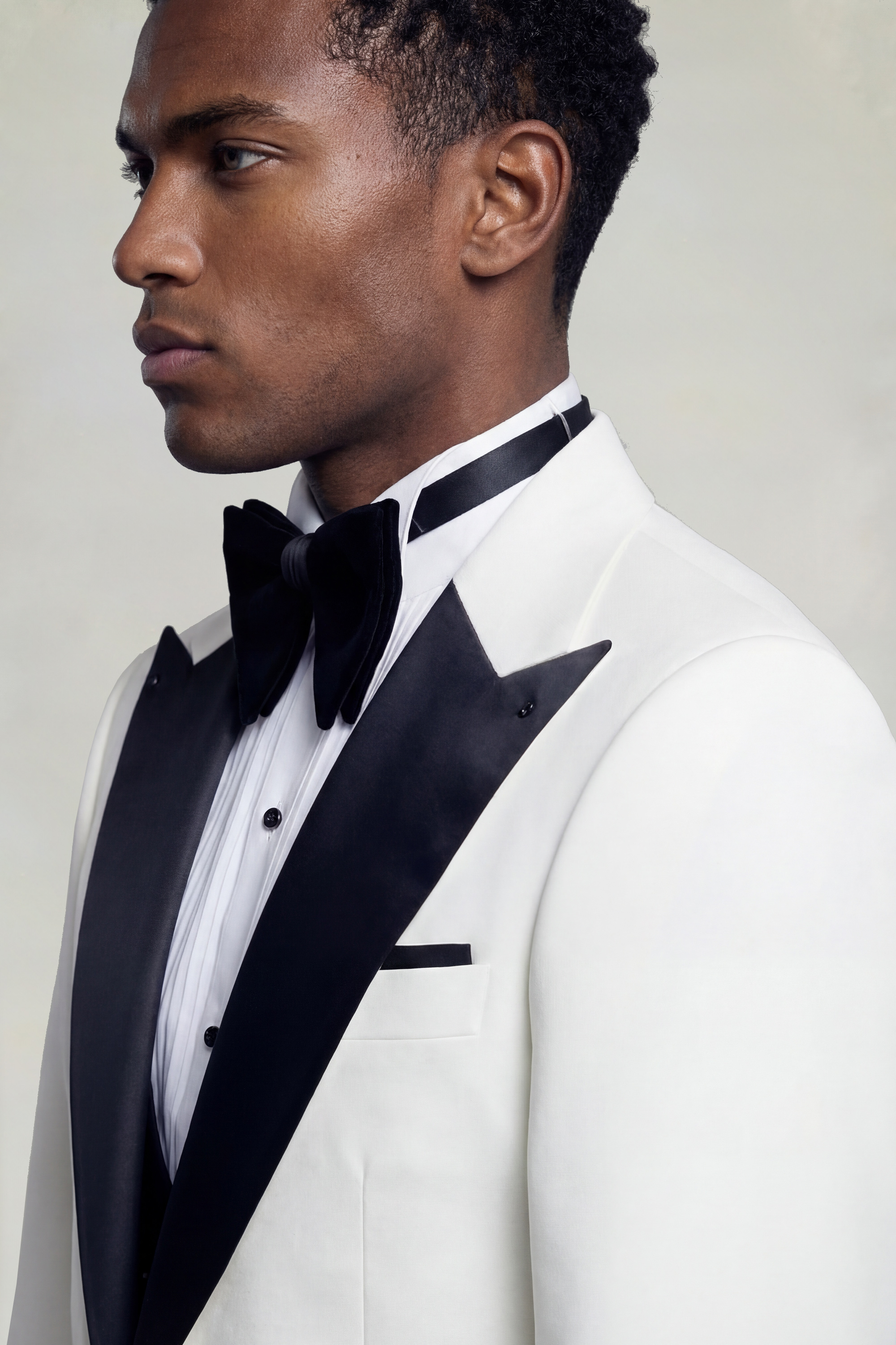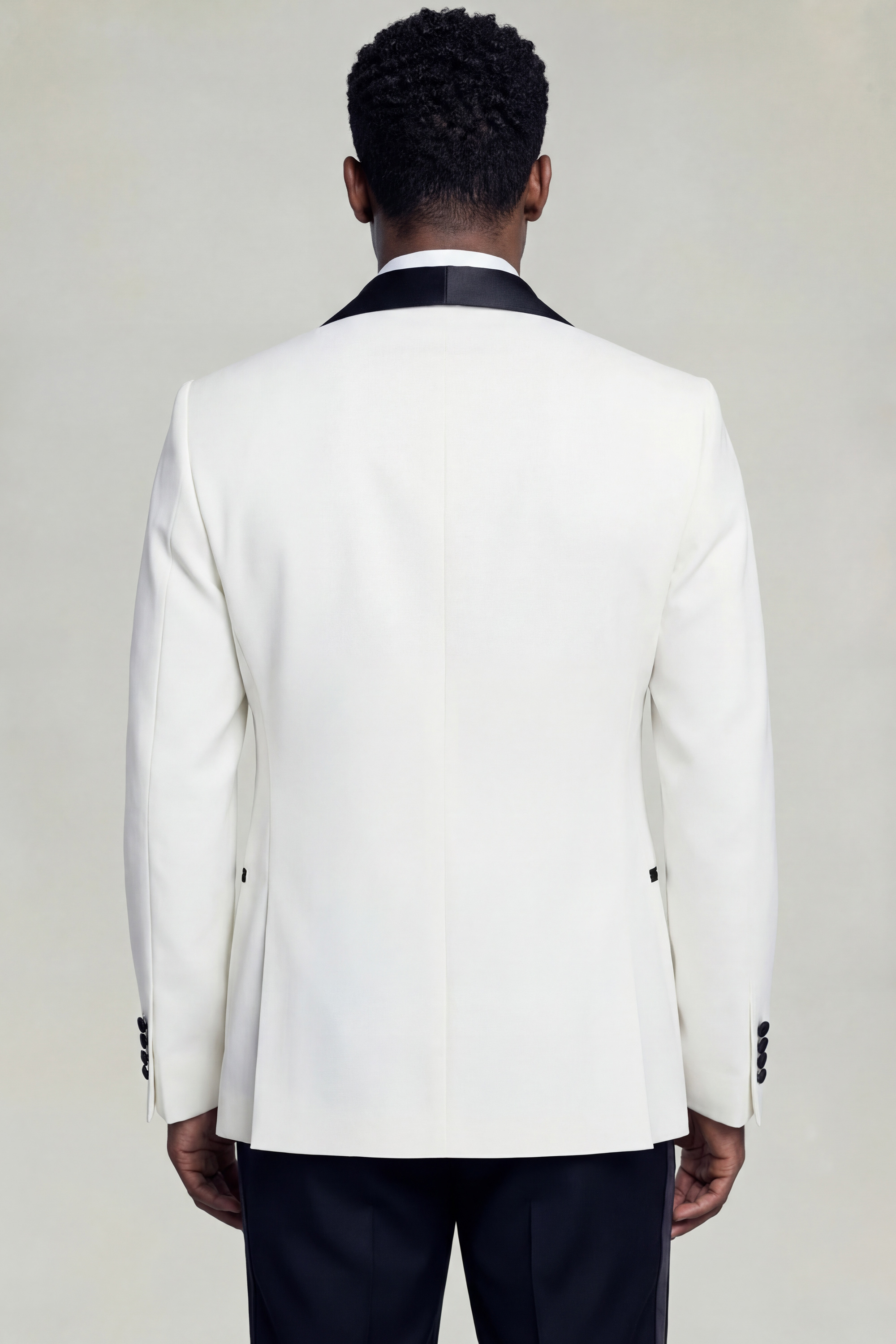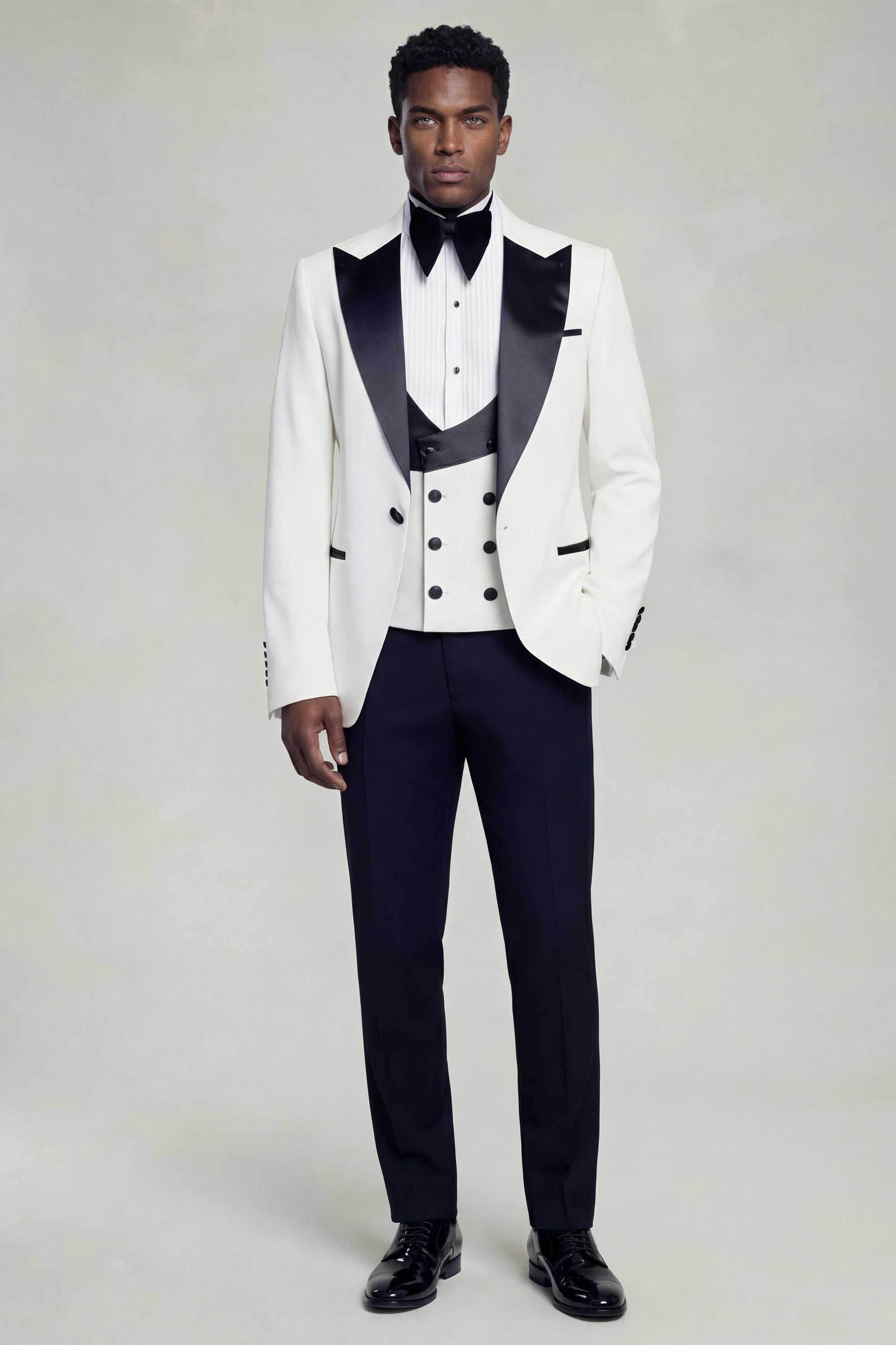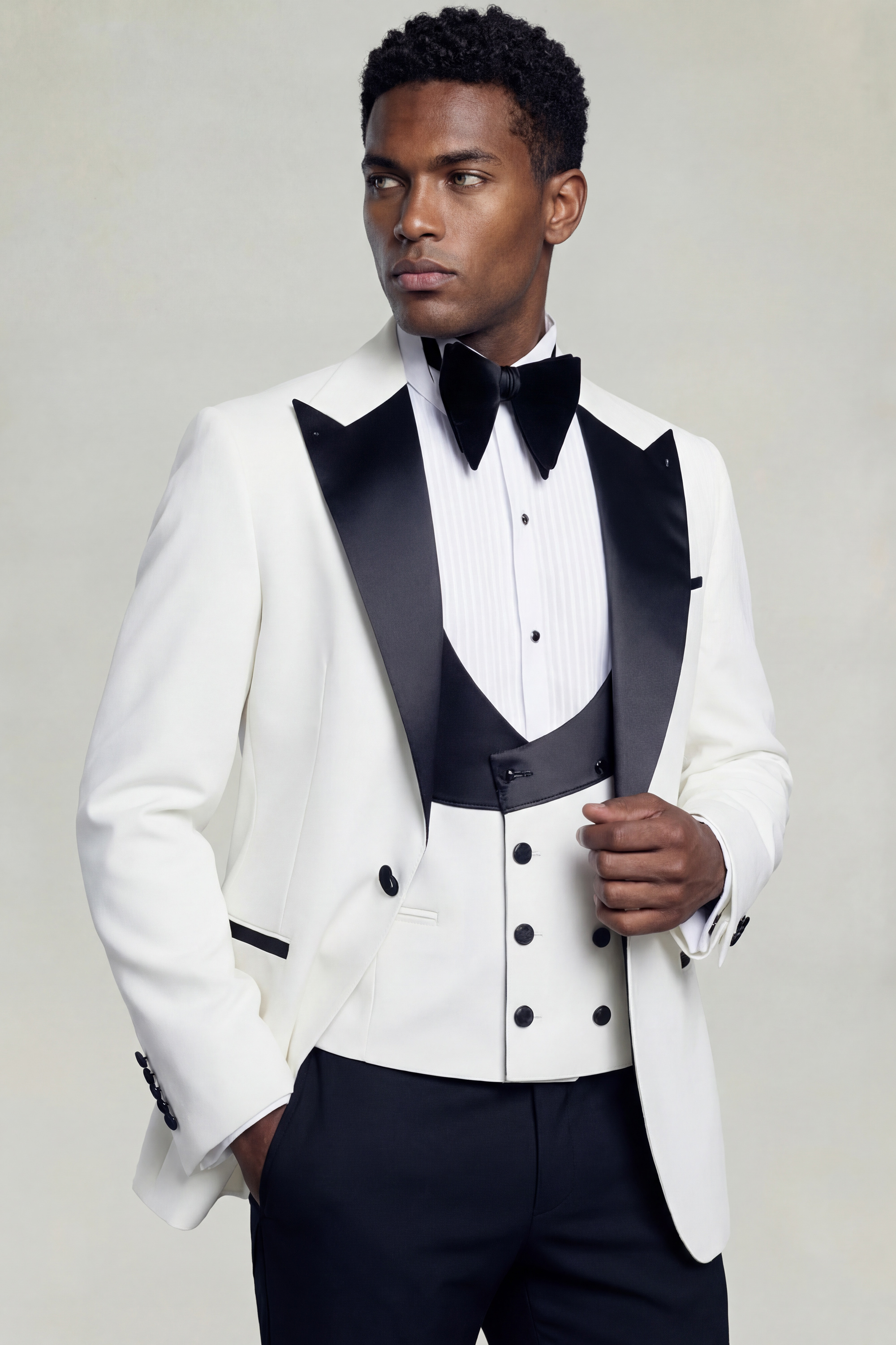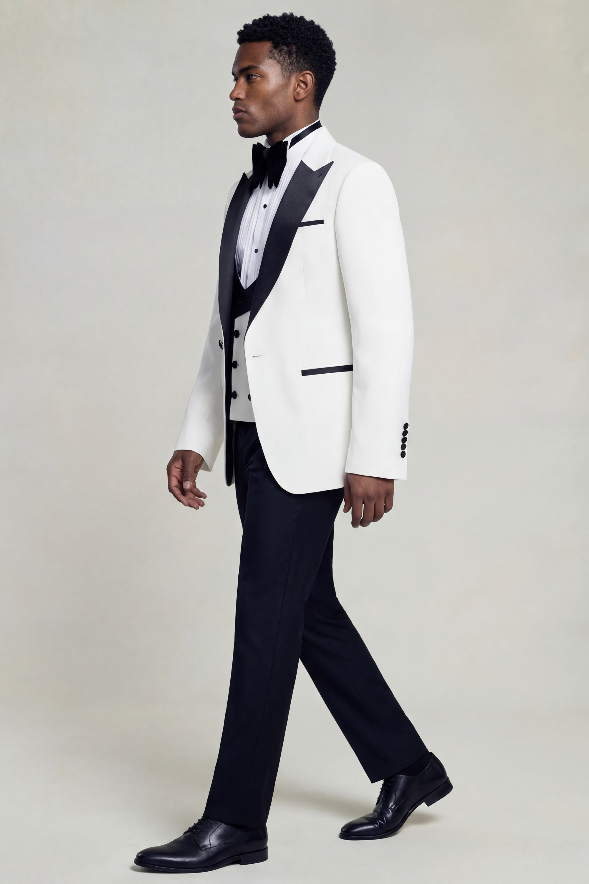 Black satin accents create a striking contrast against the white fabric, with coordinated detailing applied to the buttons, vest trim, and pocket finishes, elevating the overall sophistication of the tuxedo. Both the jacket and vest are fully lined and half canvassed, ensuring enhanced flexibility, breathability, and long-lasting structure.