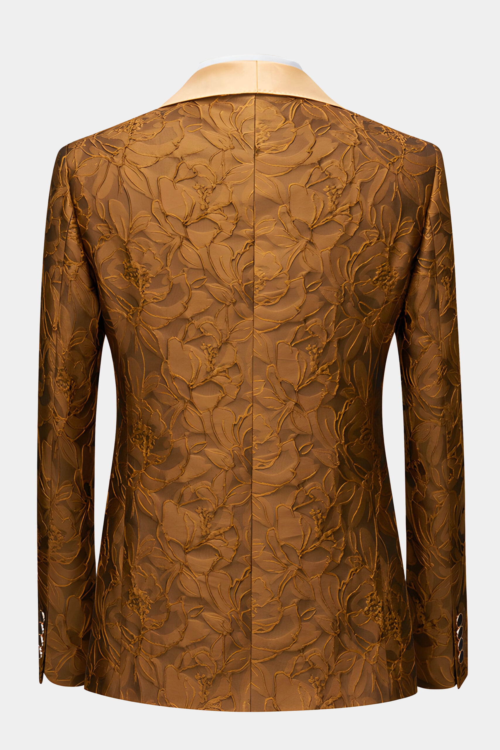 The jacket features a modern single-breasted closure with one button, showcasing a wide shawl lapel with gold trim. This elegant combination of colors and textures adds a touch of opulence, making the tuxedo a standout choice for special celebrations and events.
