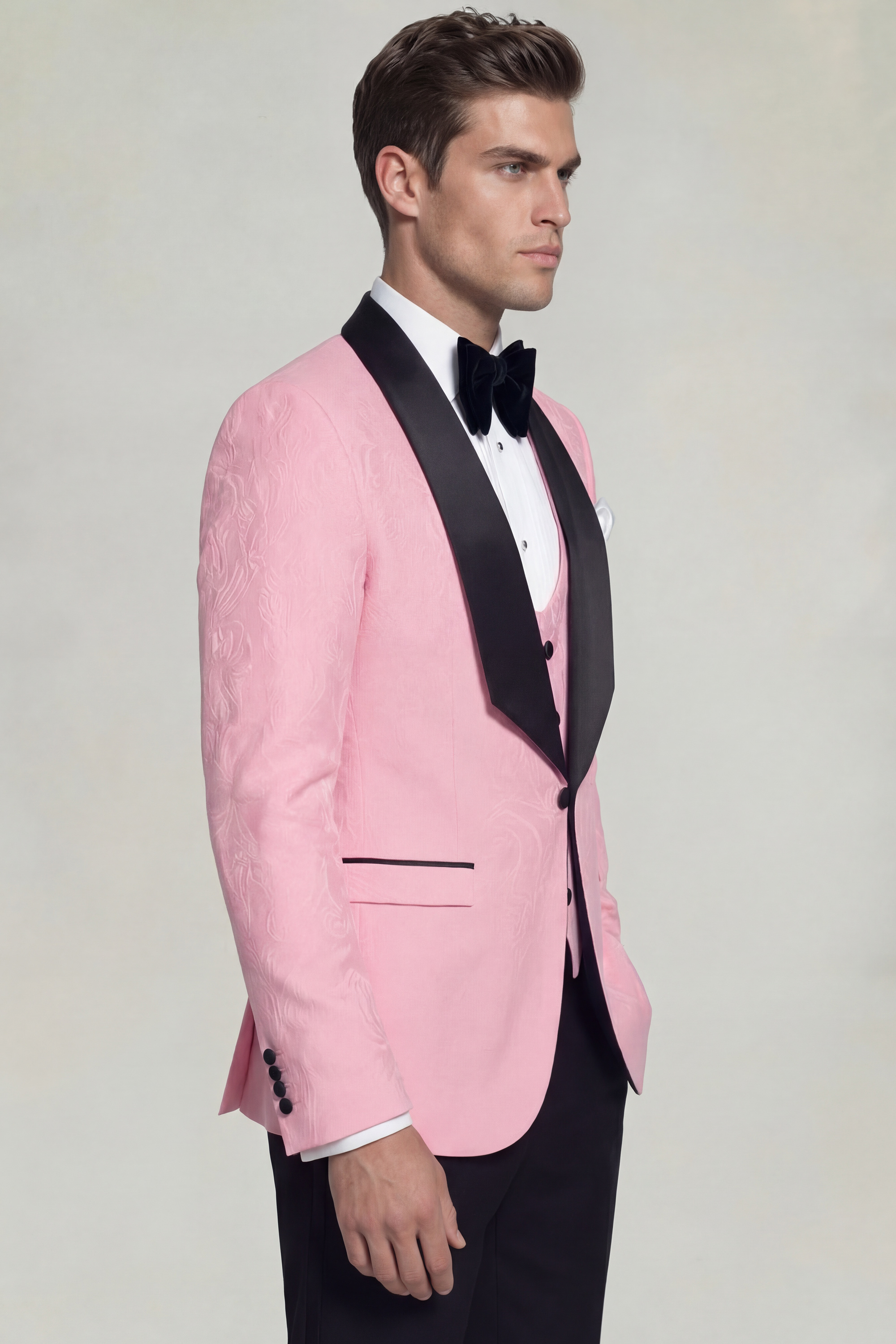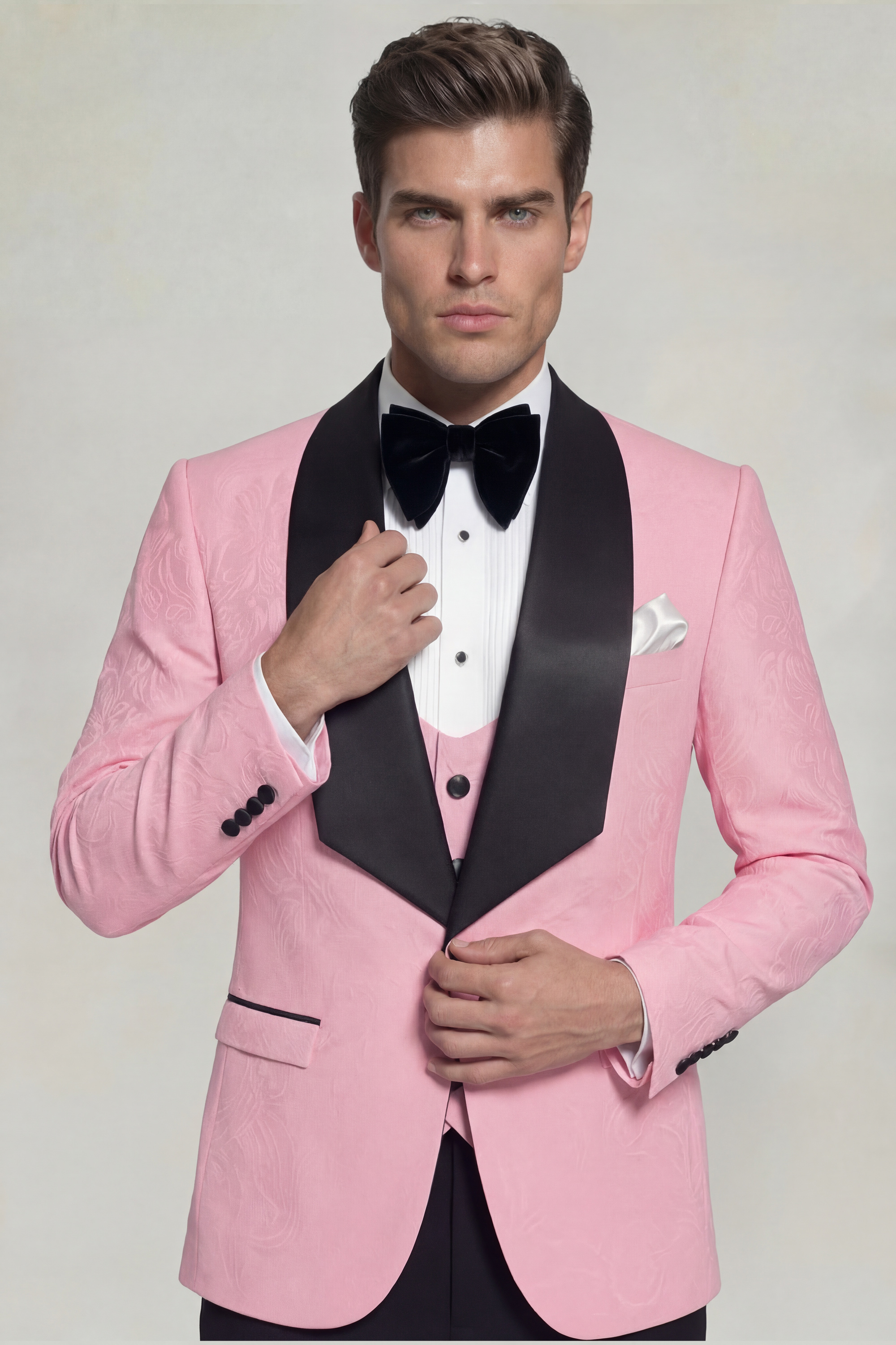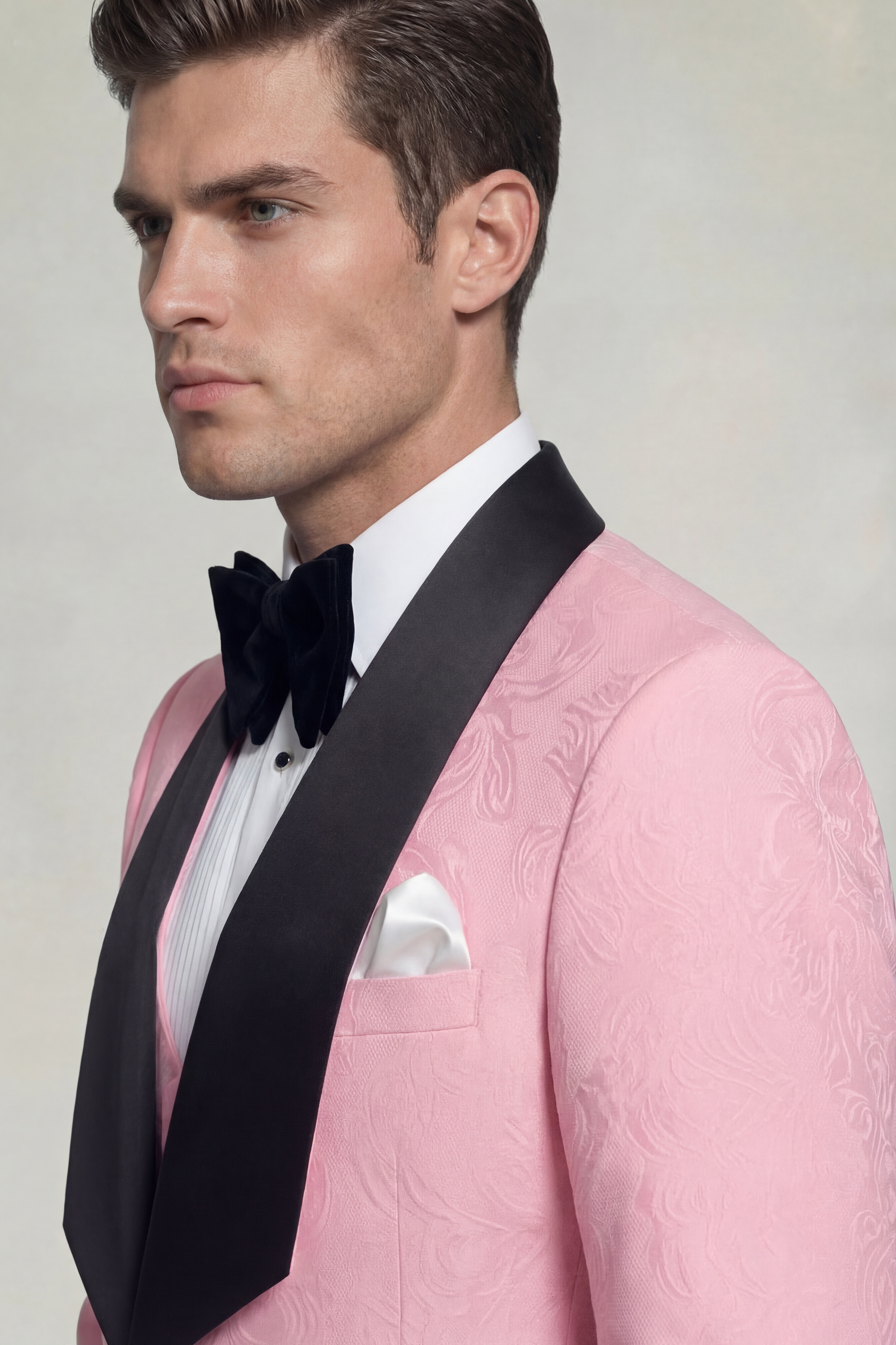 The fabric features an exclusive luxury light pink floral pattern, offering subtle texture and visual depth with a graceful, elevated aesthetic. The jacket is styled with a modern single-breasted closure and one button, accented by a wide black satin shawl lapel that creates striking contrast and a polished formal finish. Three front pockets complete the jacket with structured balance and refined functionality.