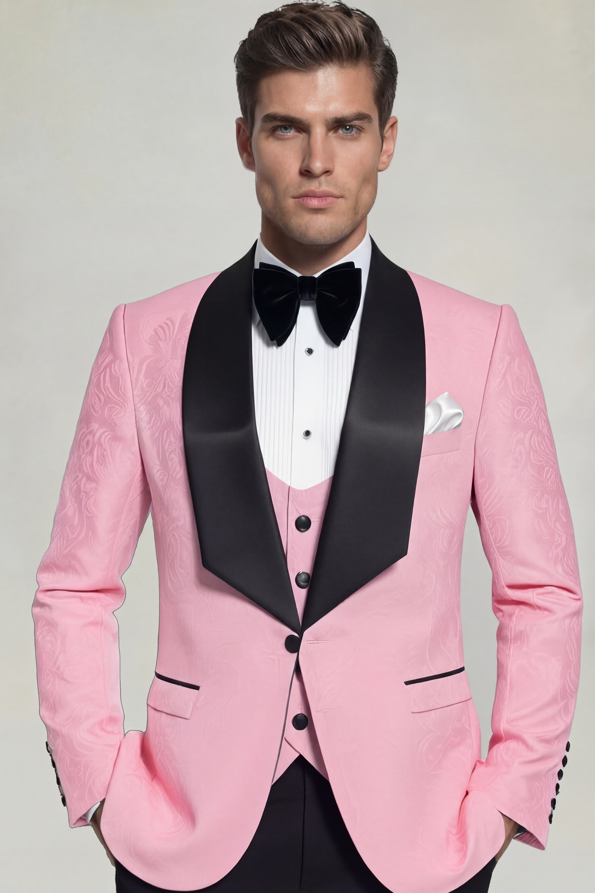 Presenting The Gentleman’s Guru Floral Pink and Black Tuxedo with Shawl Lapel – 3 Piece, a refined statement of modern elegance infused with soft color and bold contrast. Designed for the gentleman who appreciates sophisticated individuality, this tuxedo balances romantic tones with classic formal detailing for a truly distinguished look.