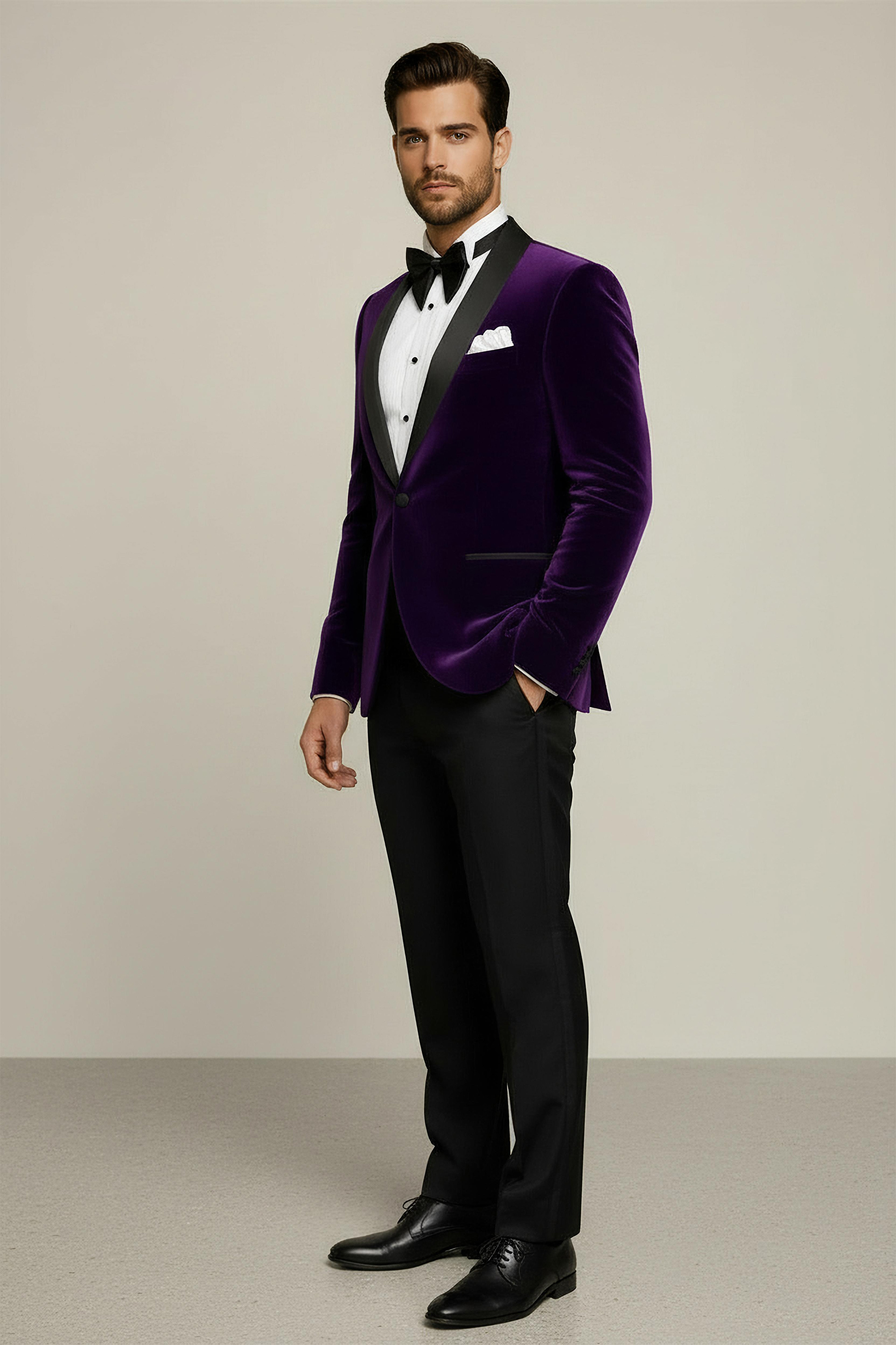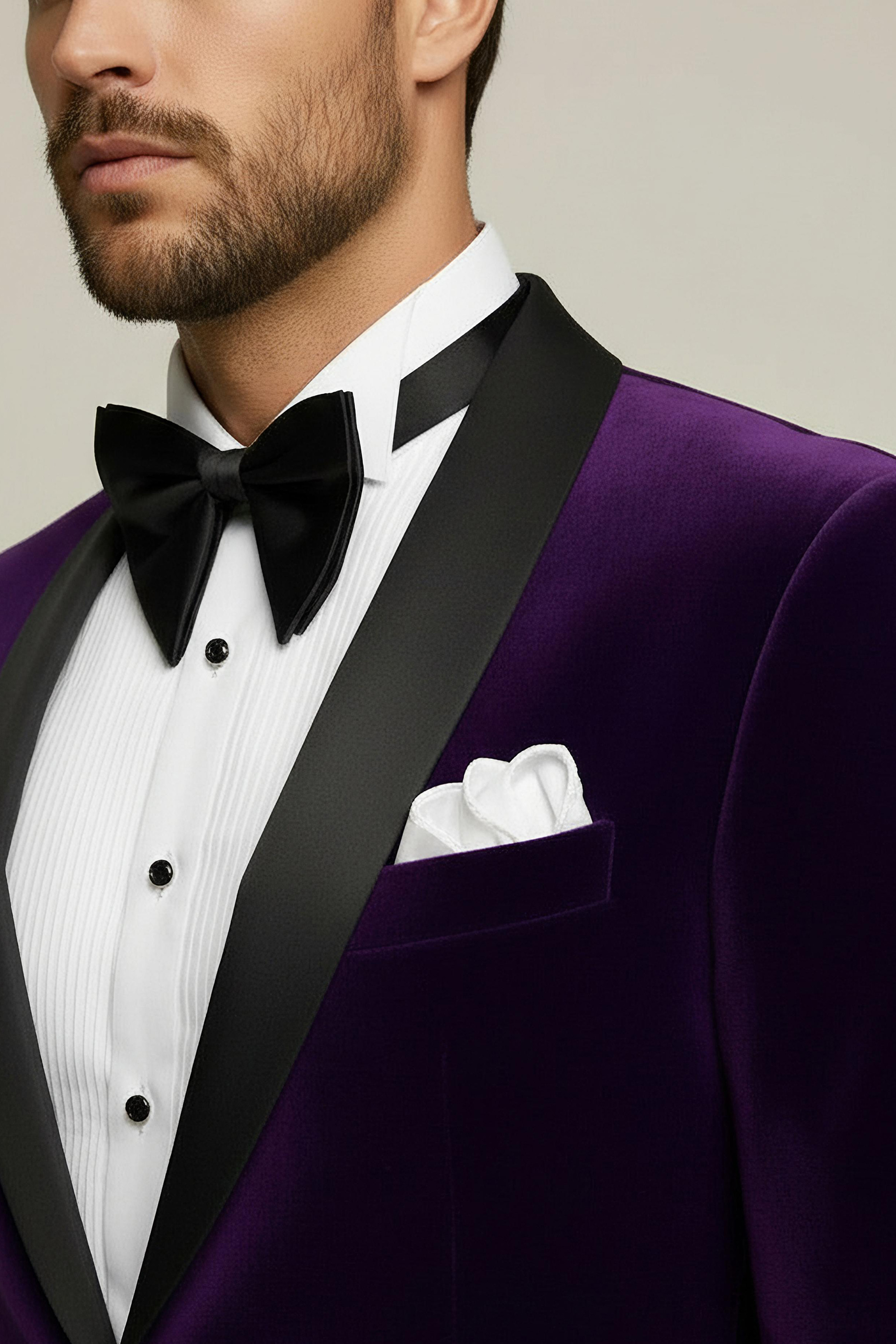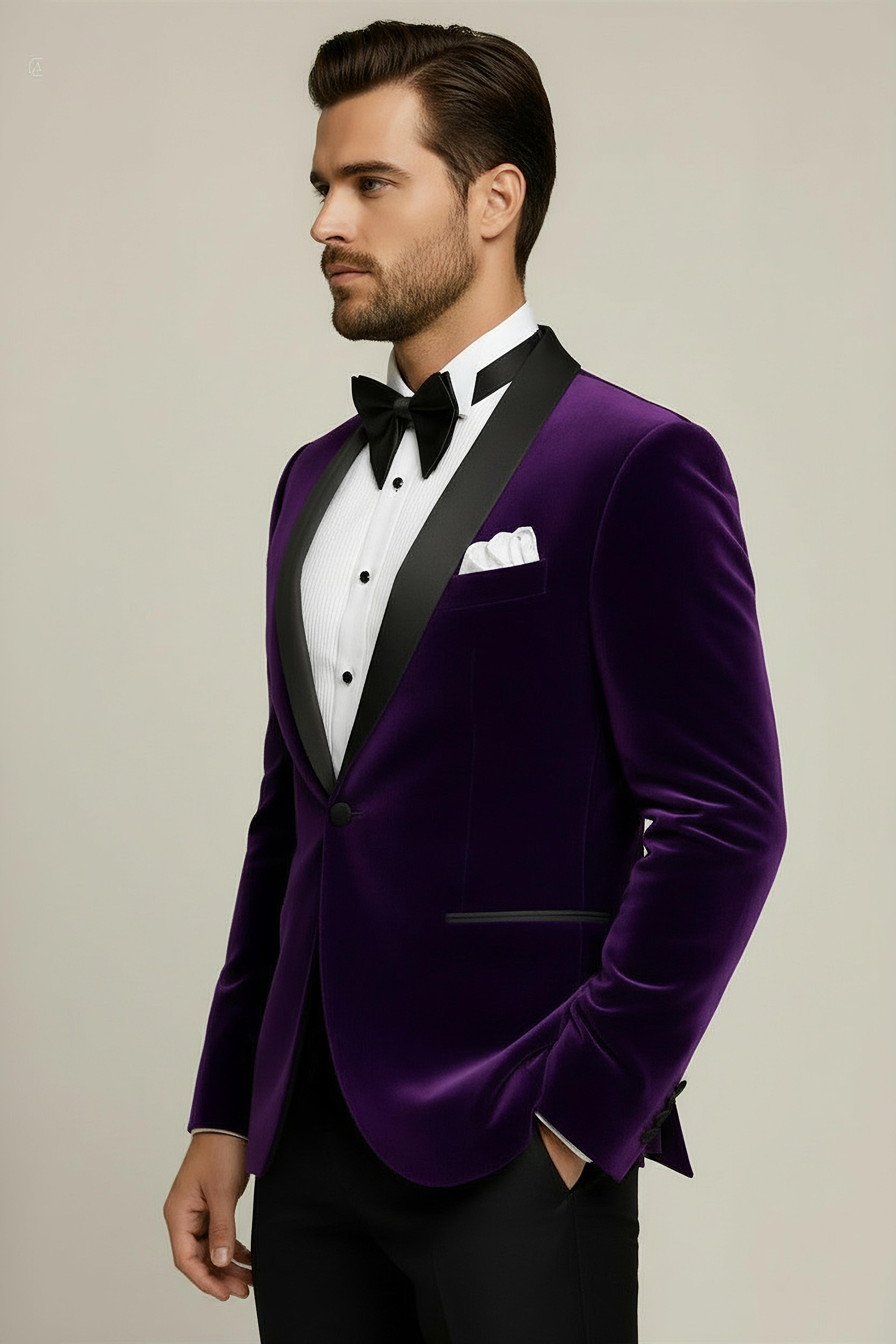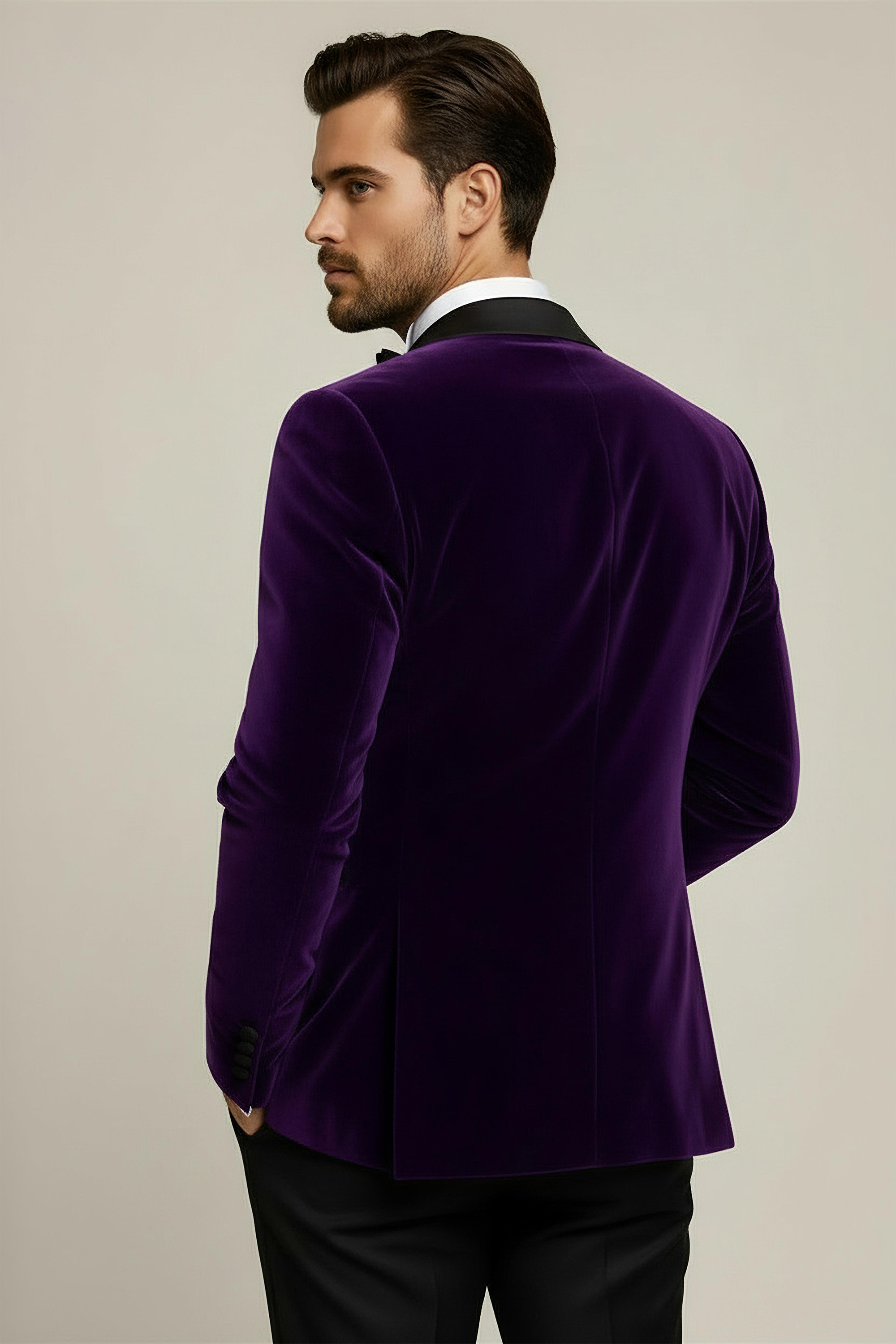 Up your wardrobe game to the next level when you add this elegant purple velvet tuxedo blazer to your collection.