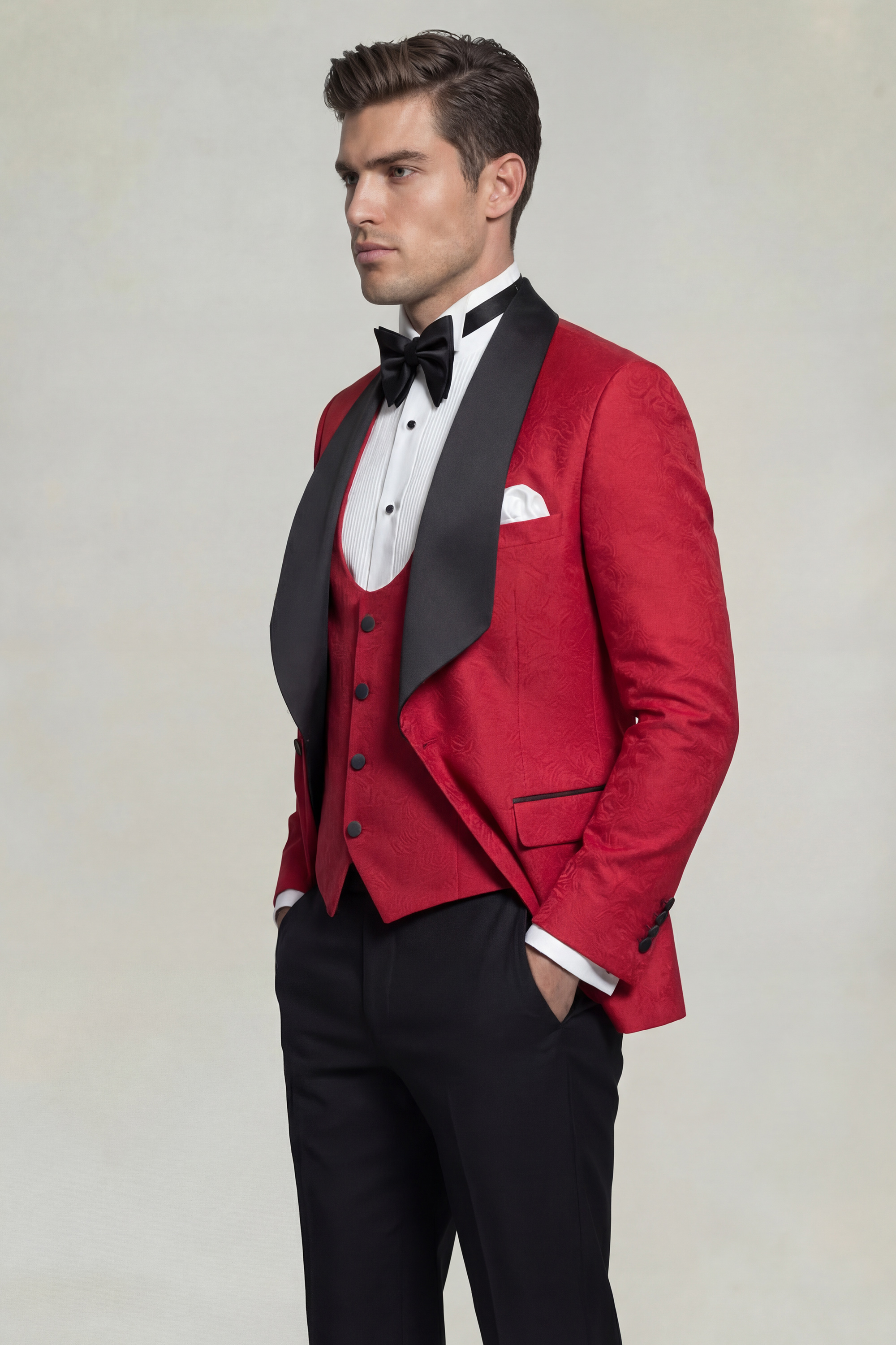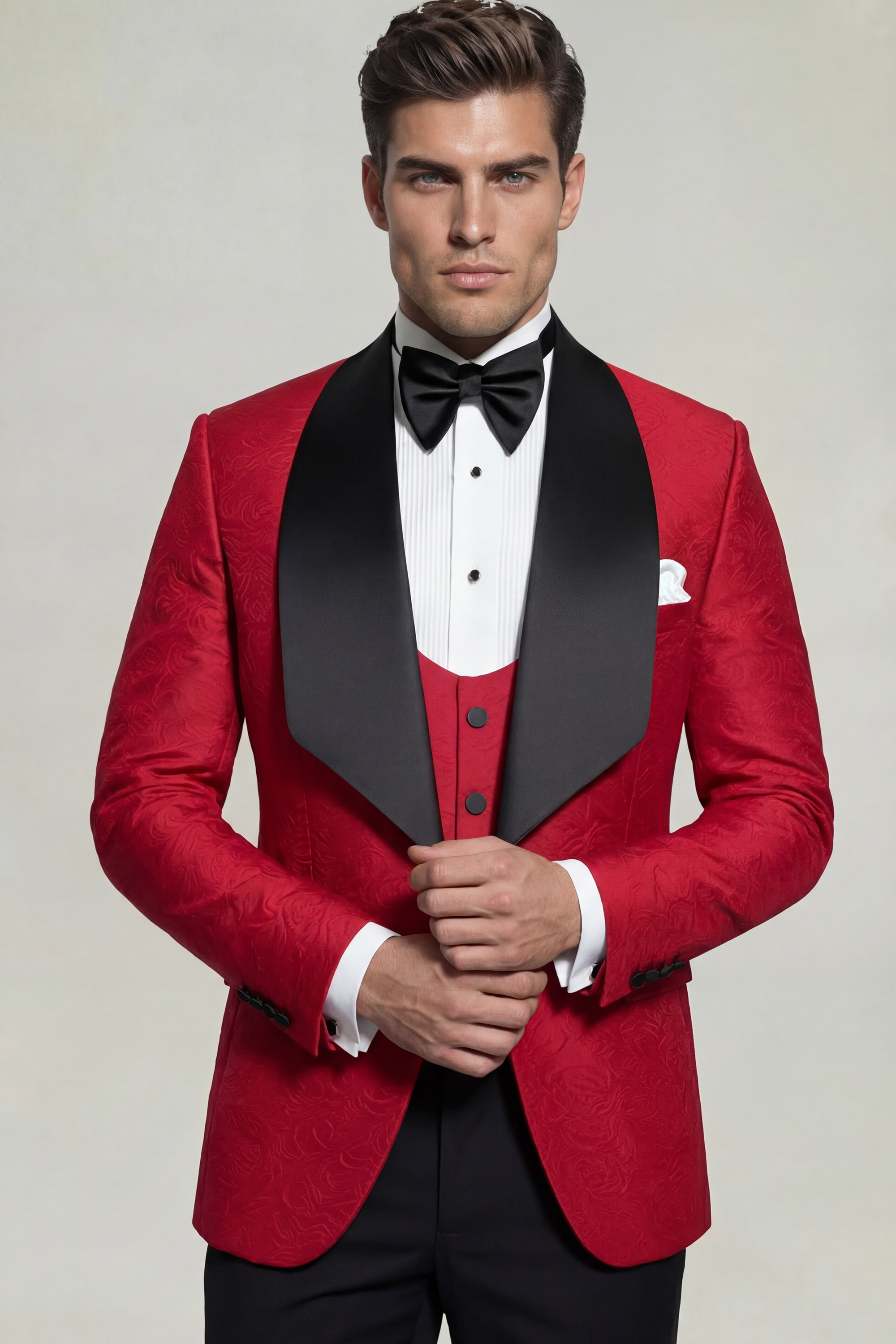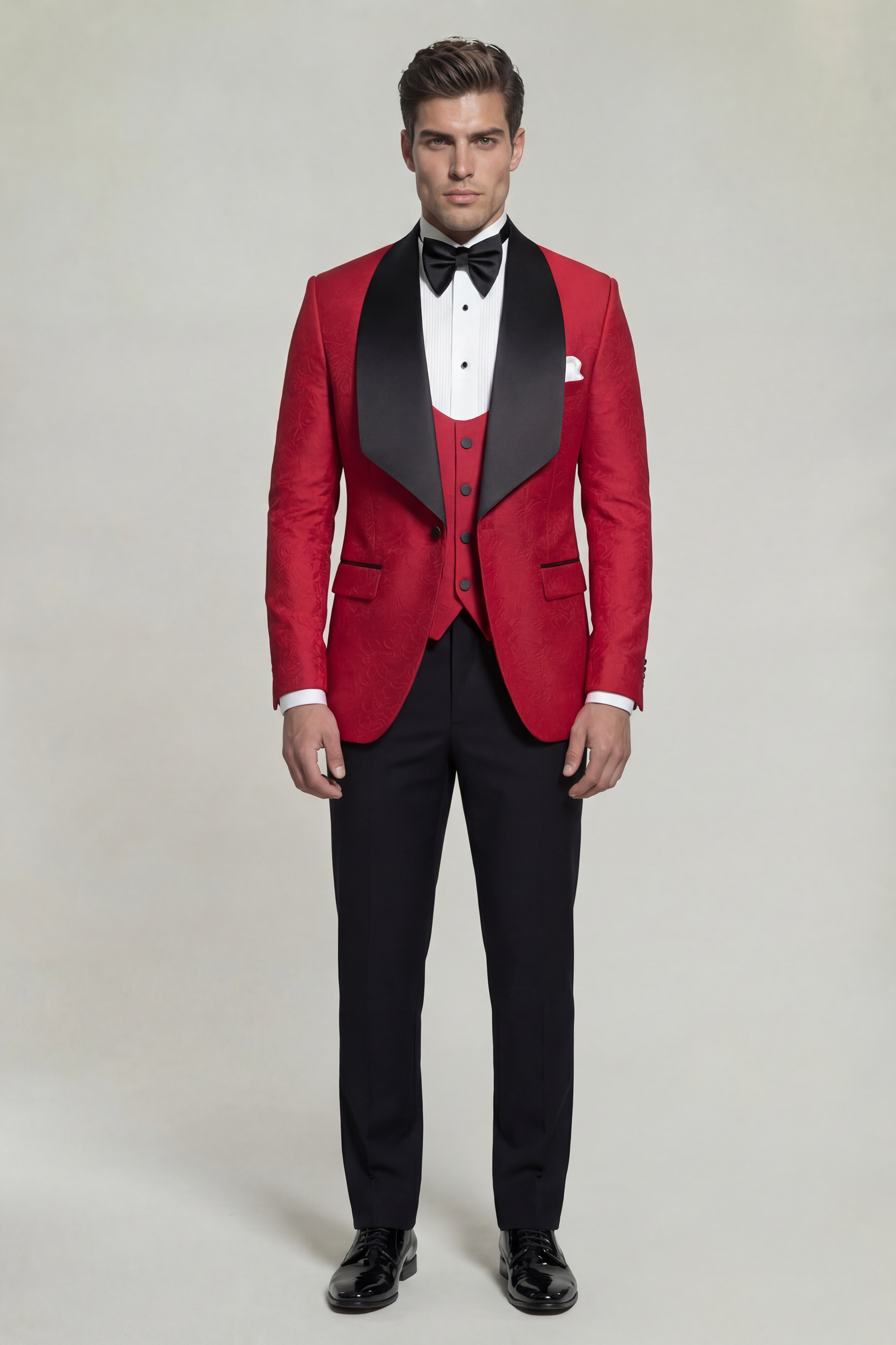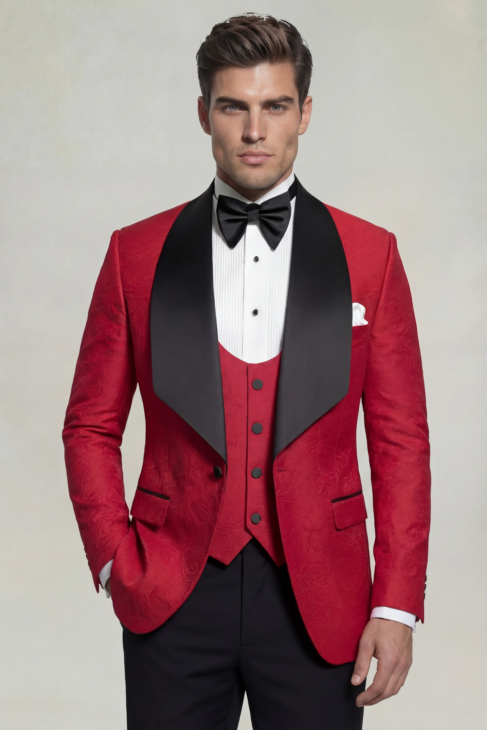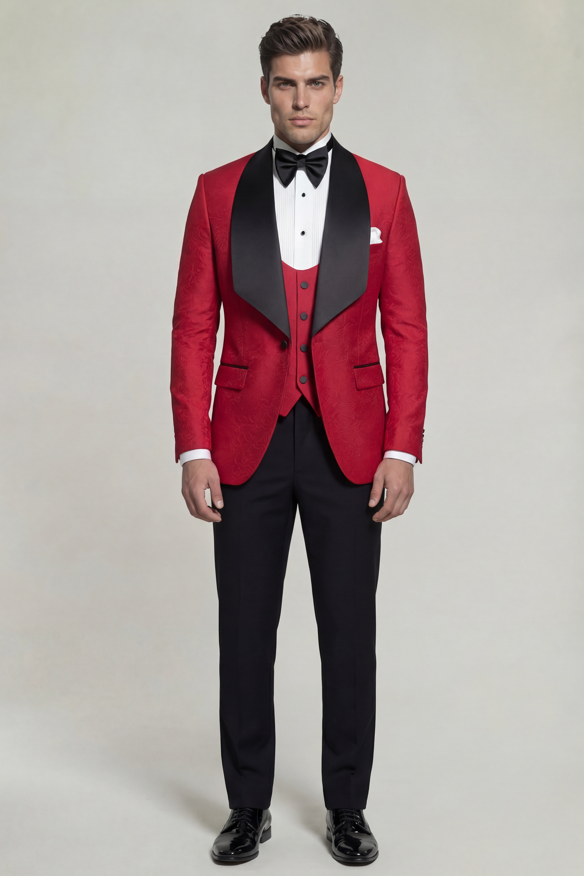 The Gentleman’s Guru Floral Red and Black Tuxedo with Shawl Lapel – 3 Piece is an exceptional choice for black-tie events, galas, weddings, and statement-making formal occasions. Designed to leave a lasting impression, it embodies modern sophistication, expert tailoring, and the signature excellence that defines Gentleman’s Guru.