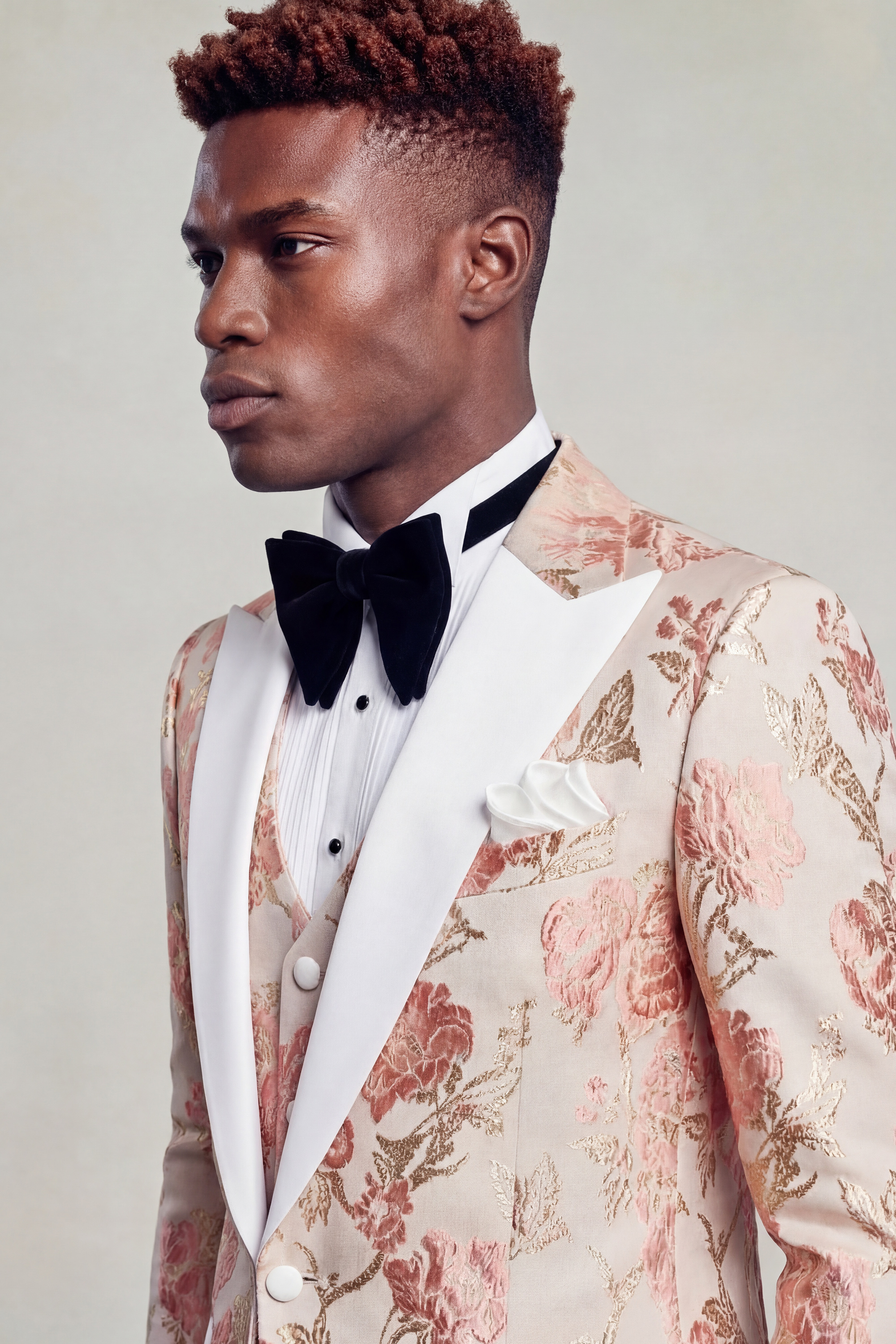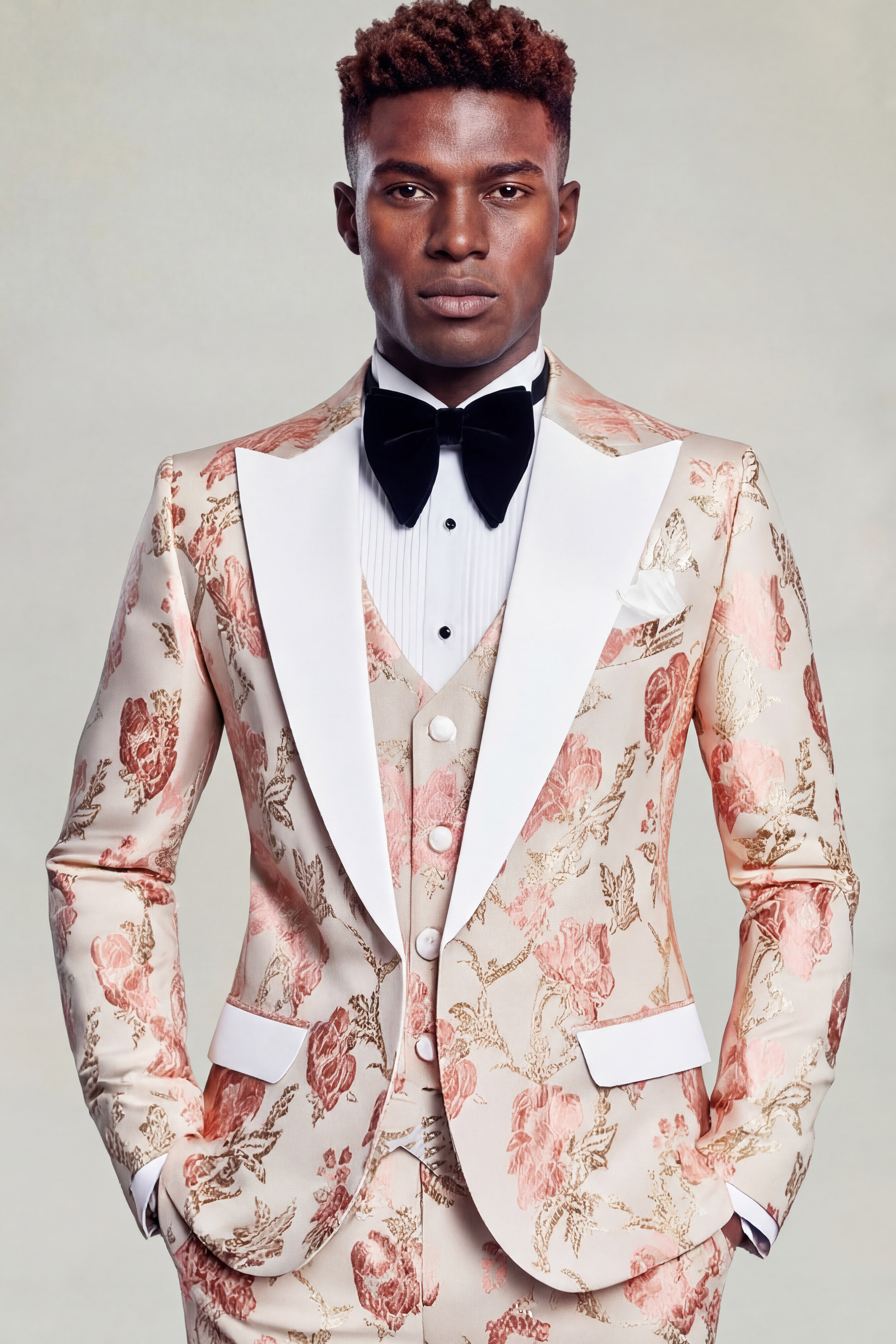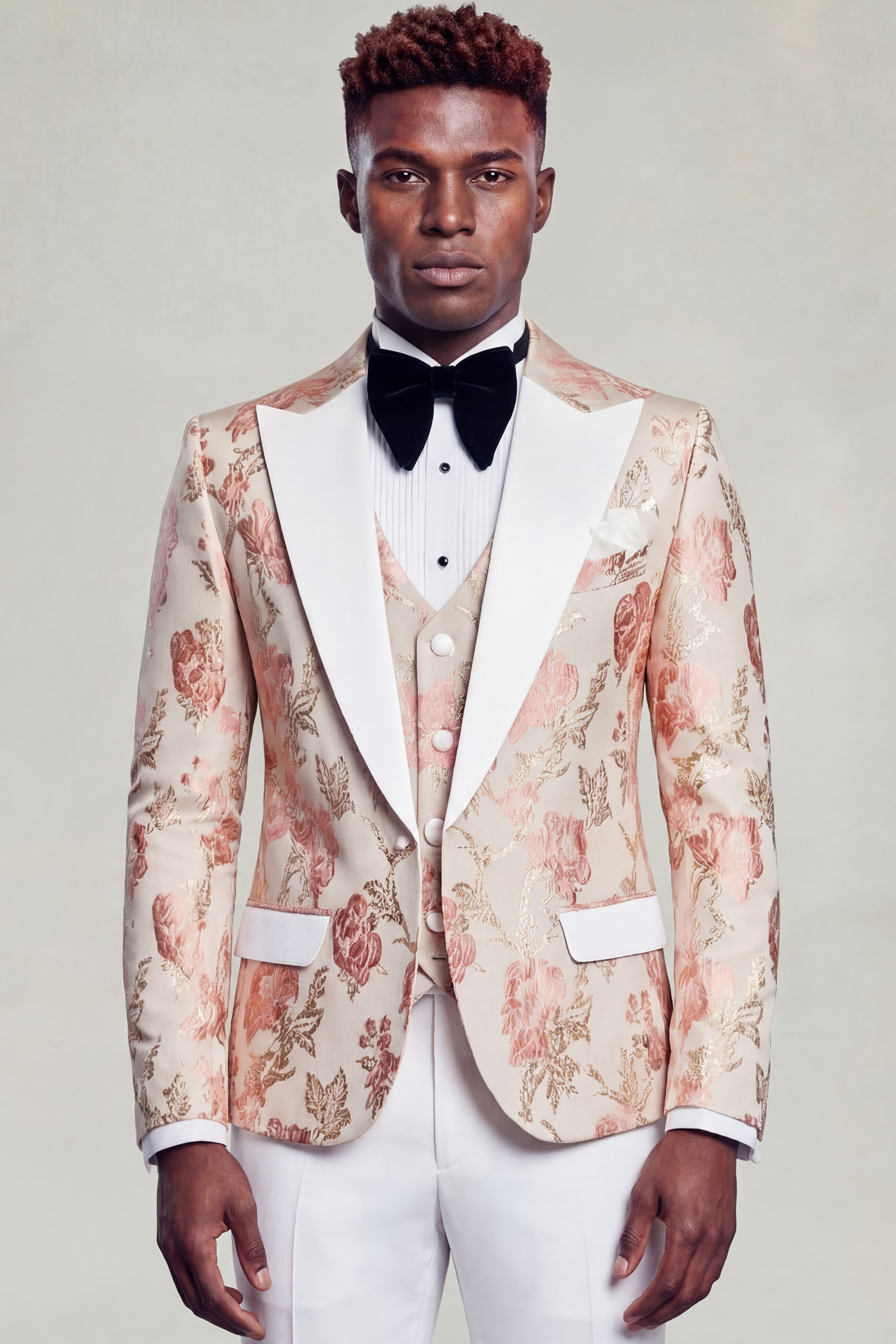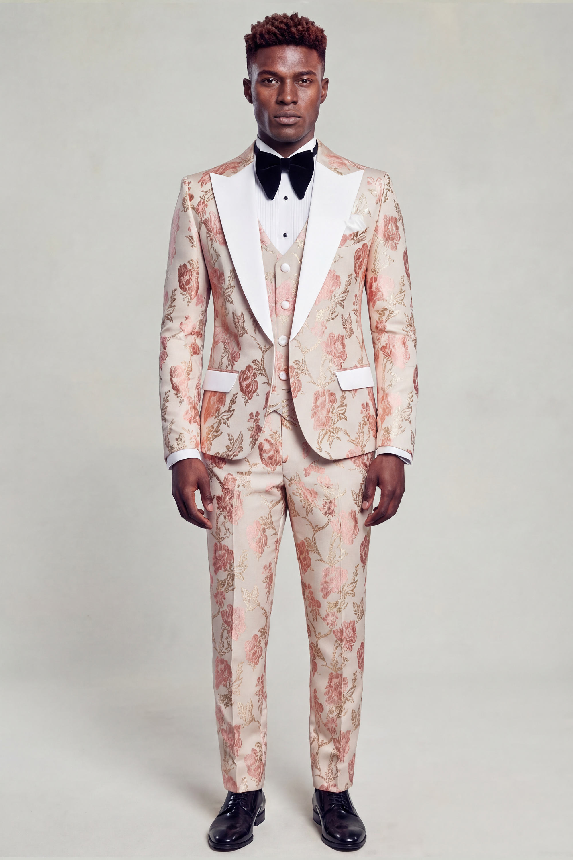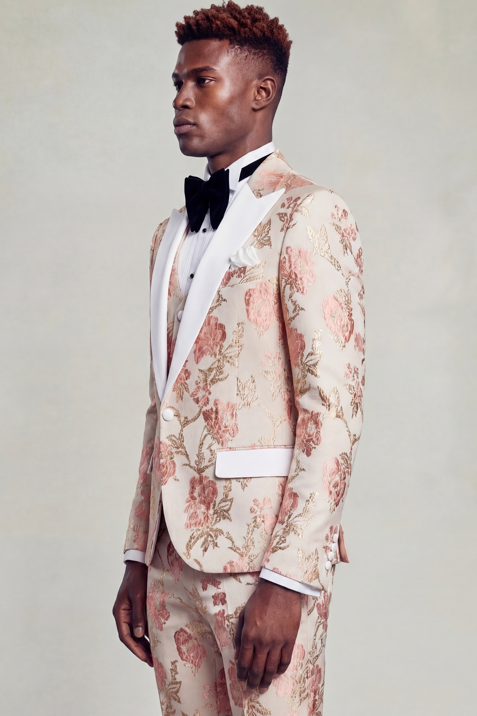 Tailored in a slim fit with a custom size option available, the tuxedo is crafted to deliver a sharp, sculpted silhouette while maintaining comfort and ease of movement. The fabric features a delicate vintage floral pattern set against a rich rose gold backdrop, offering depth and texture with a refined, understated charm.