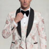 The fabric features a luxurious rose gold floral pattern set against a light, elegant backdrop, creating depth and visual refinement without overpowering the design. The jacket is styled with a modern single-breasted closure and accented by a wide black satin shawl lapel, offering a striking contrast that enhances the tuxedo’s formal appeal. Subtle black trim details along the pockets complete the jacket with clean structure and balance.