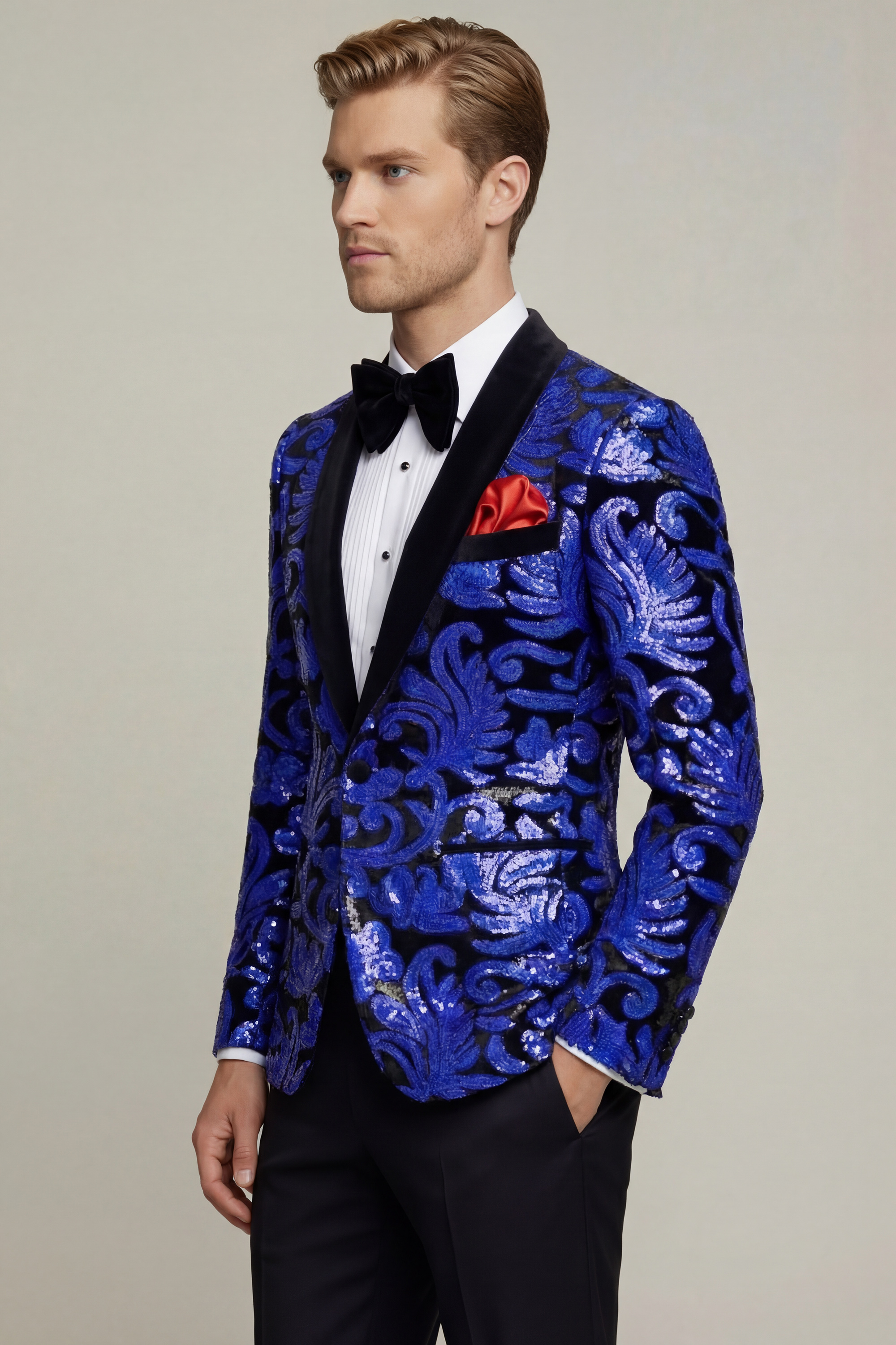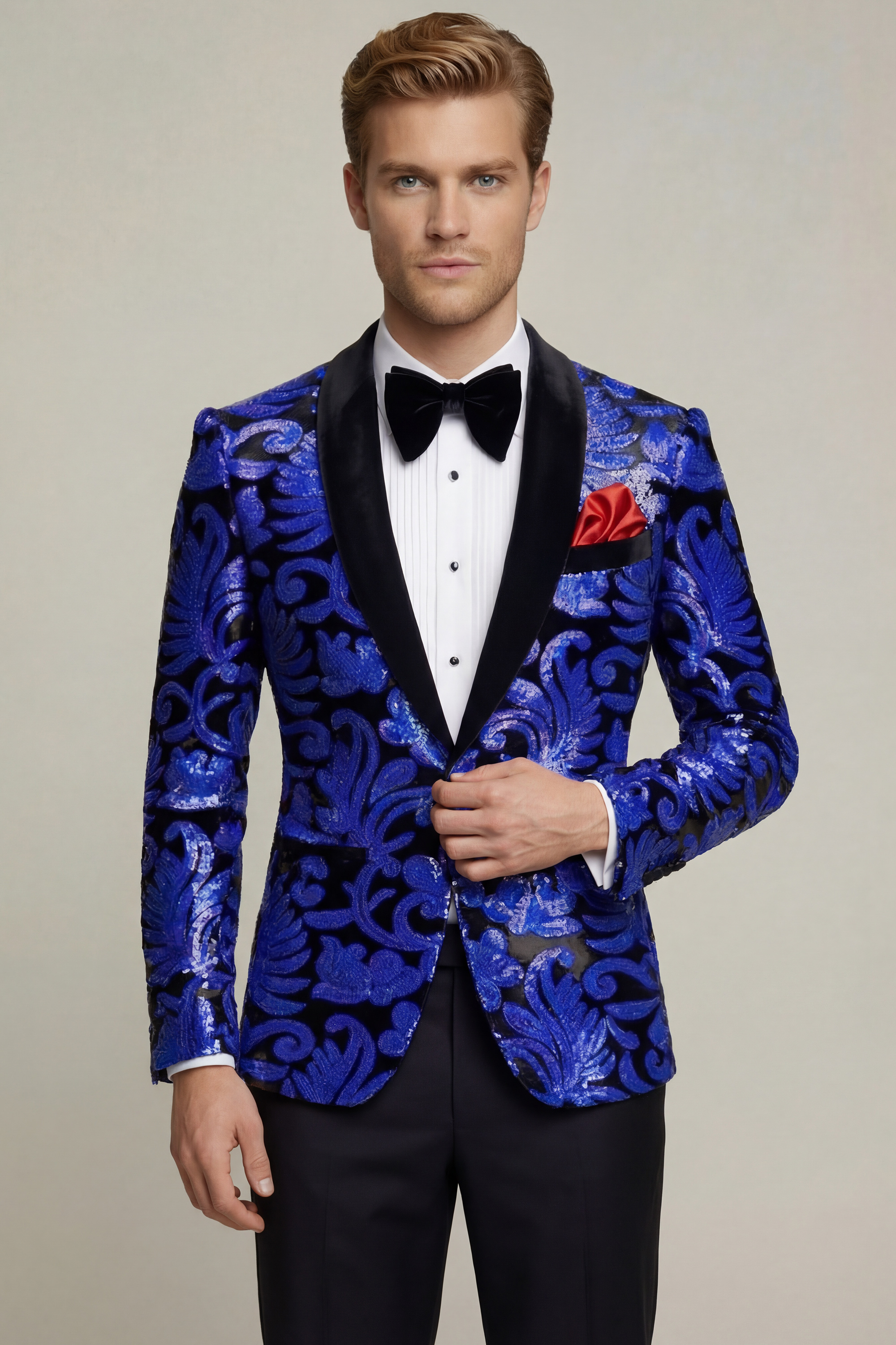 The sequined jacket captivates your attention from the get-go with its swirling patterns that sparkle mischievously as you move around. Velvet lapels always look classy and complete the ensemble perfectly. This single-breasted slim-fit tux jacket flatters your silhouette, so you look dapper and smart. Finish with a bow tie and a solid pocket square.