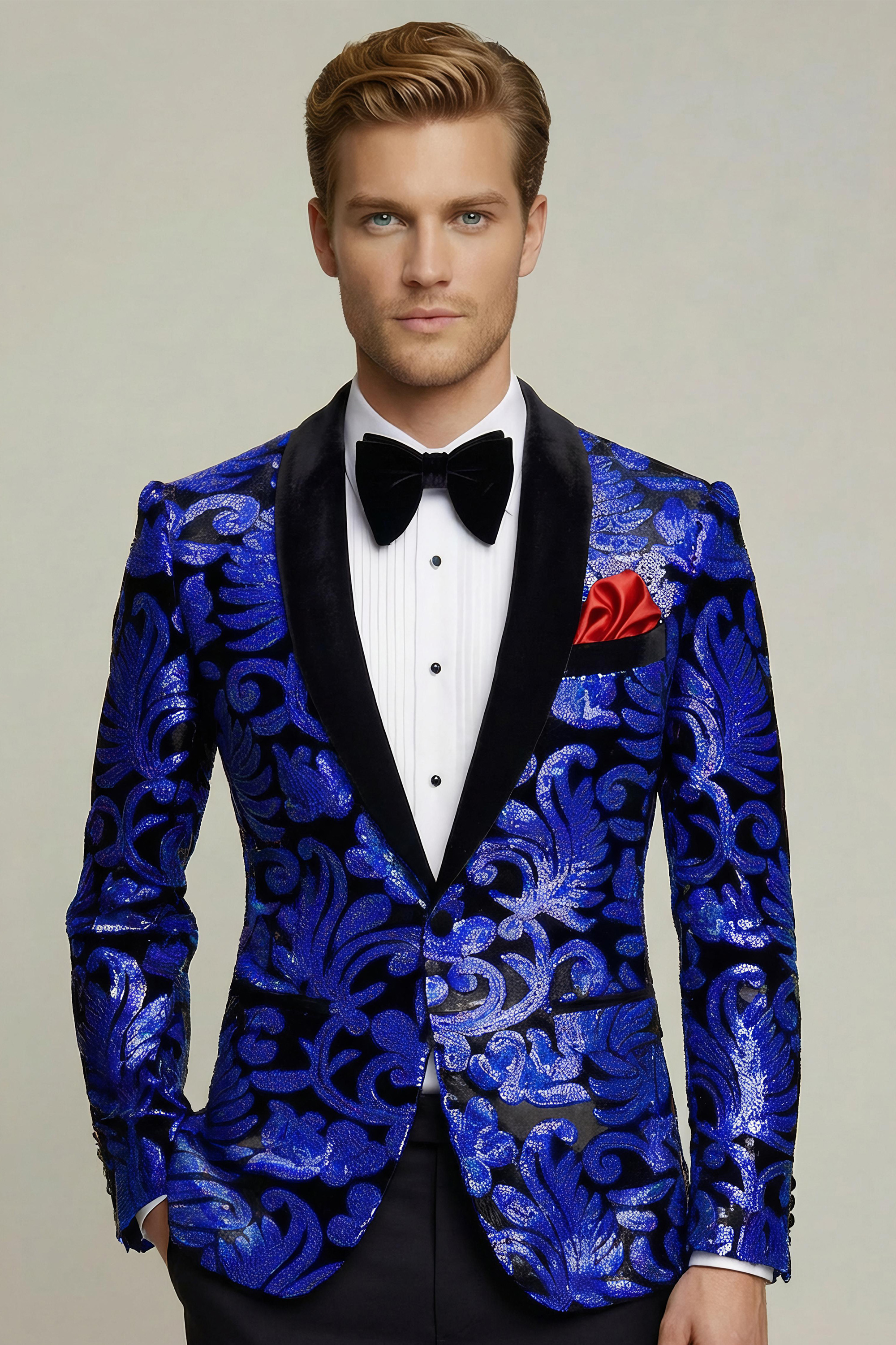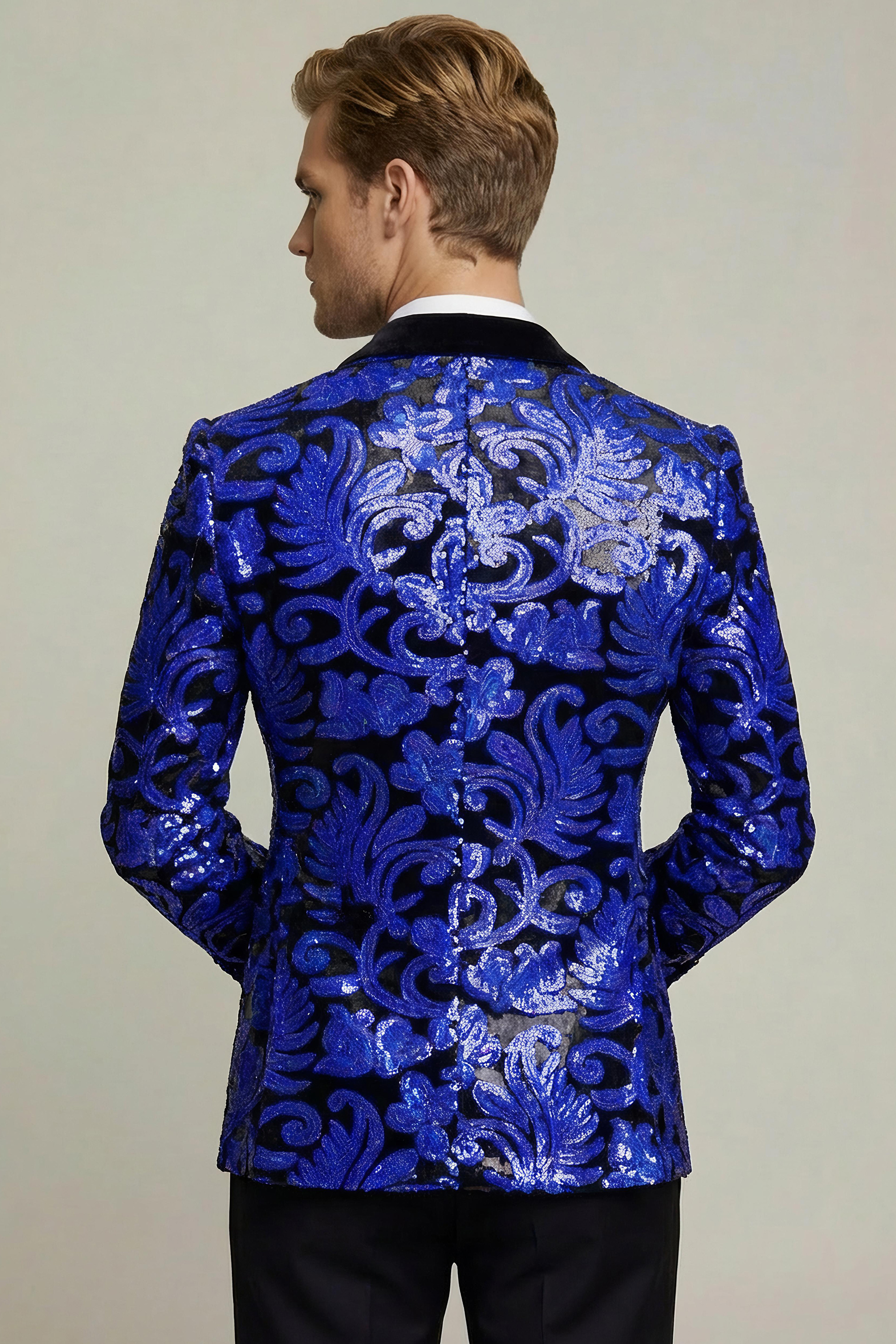 Want to be the “king of disco” at an upcoming party? Rest assured, when you hit the dance floor while sporting this impressive royal blue and black tuxedo jacket with sequins glittering playfully, all eyes will be on you! It is time to show off those crazy moves and let your hair down!