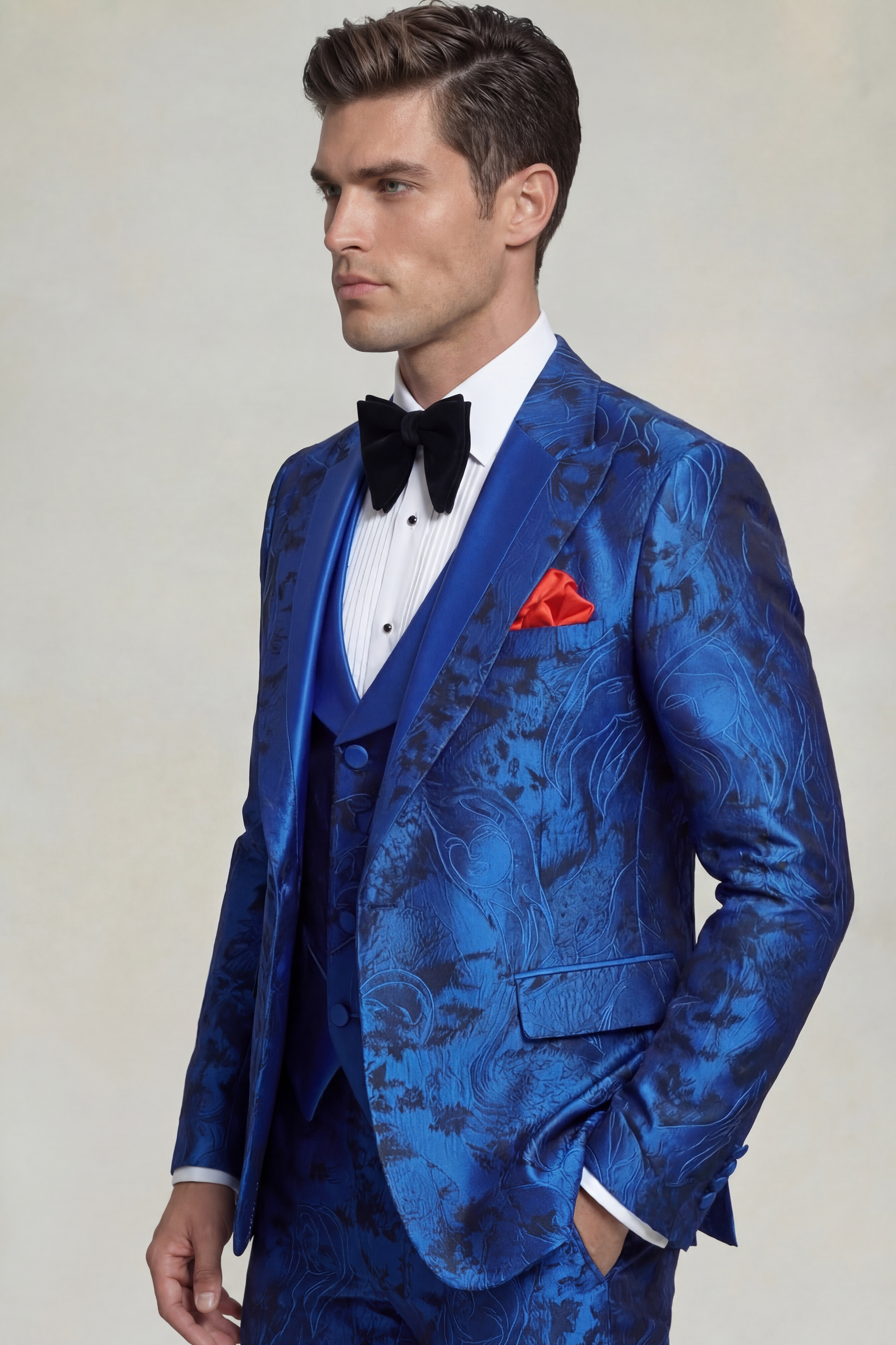 Handcrafted from a durable blend of wool, cotton, linen, and polyester, this tuxedo provides both comfort and resilience while maintaining its luxurious appearance. Perfect for weddings, proms, gala events, and upscale celebrations, the Royal Blue Geisha Print Tuxedo – 3 Piece is designed for those who want to stand out with confidence while maintaining timeless sophistication.
