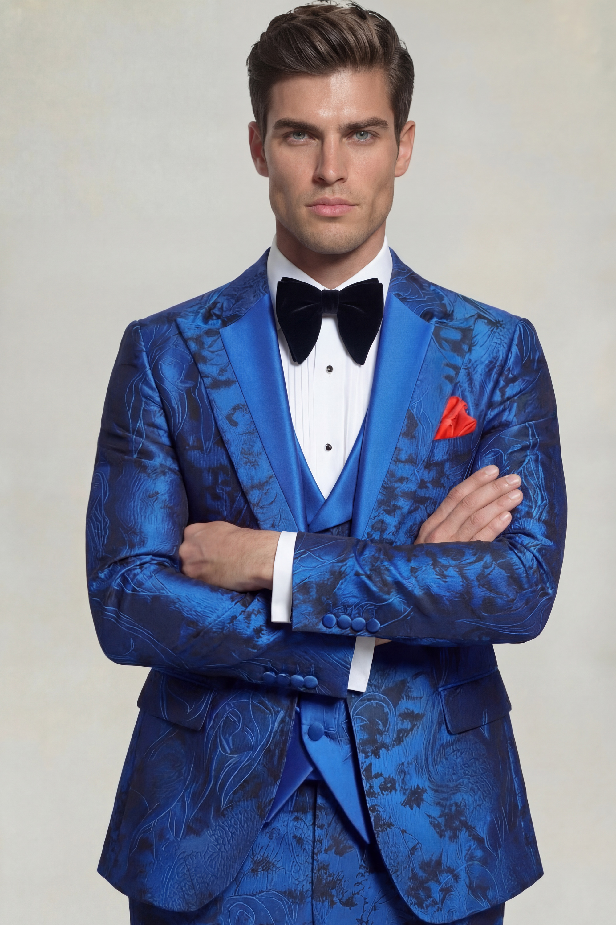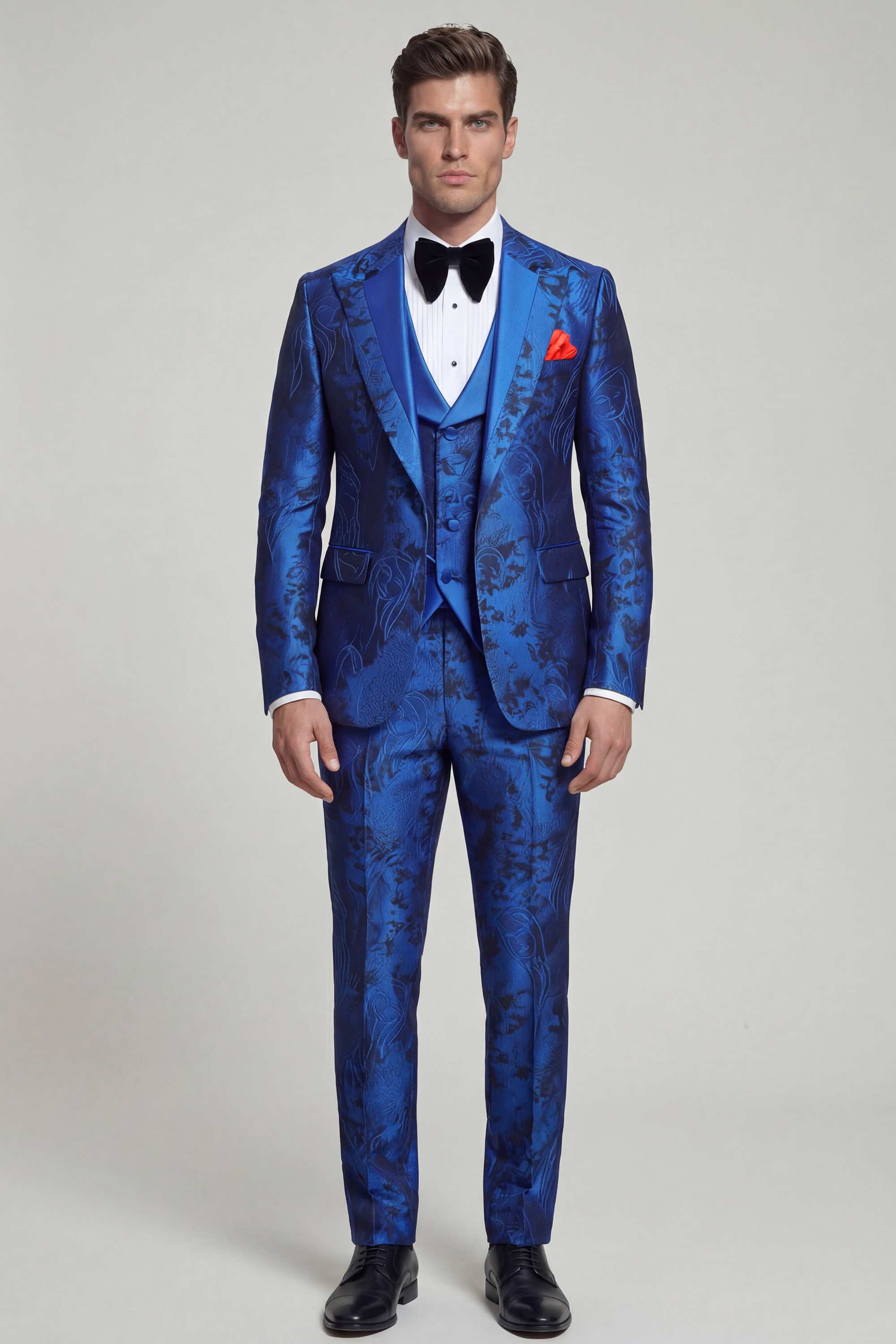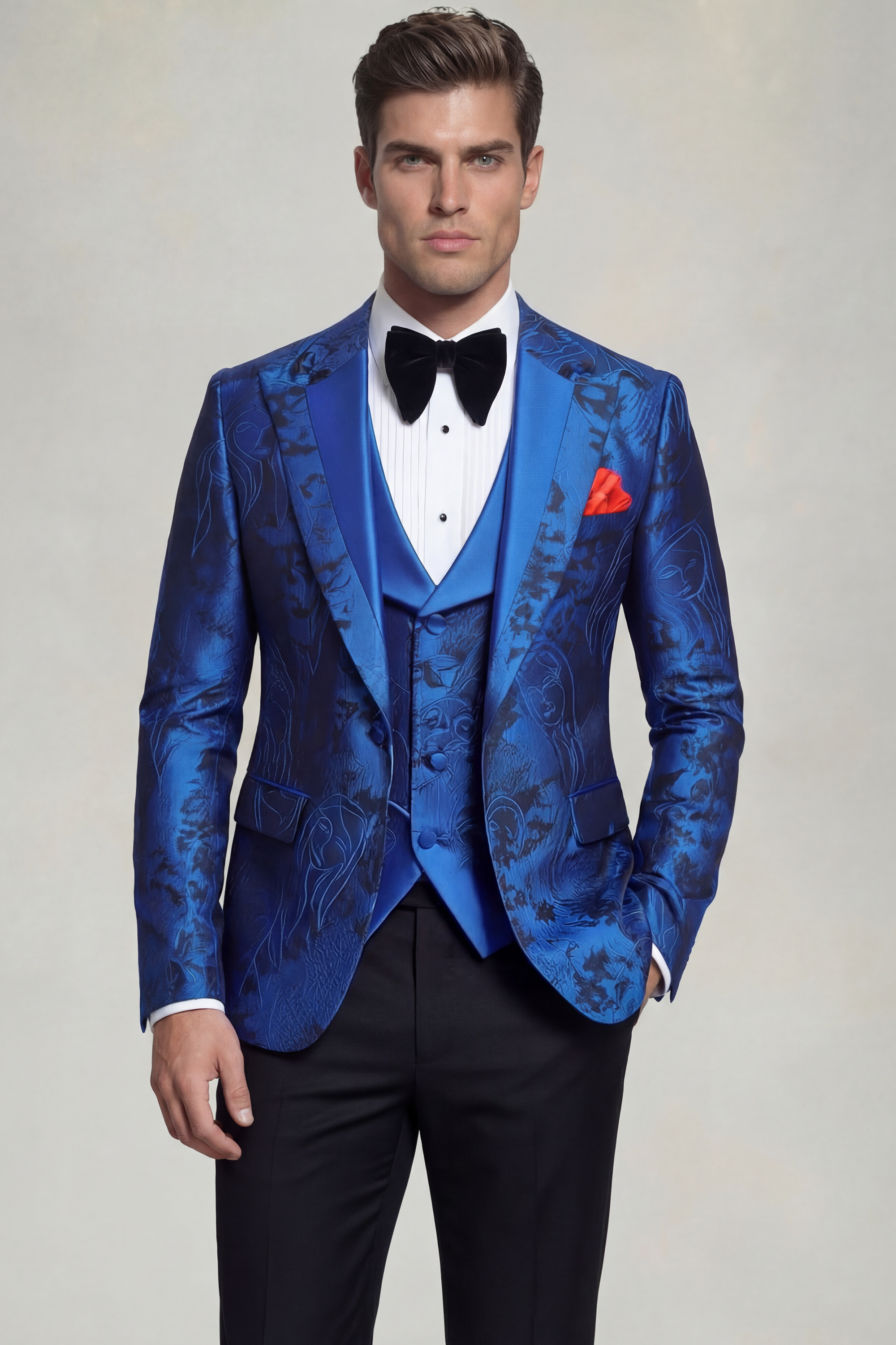The jacket showcases a contemporary single-breasted closure with one button and is finished with a modern peak lapel, creating a sleek contrast that highlights the richness of the patterned fabric. Satin blue trim detailing along the lapel edges adds a refined touch, reinforcing the tuxedo’s polished aesthetic. Fully lined and half canvassed, the jacket offers superior structure, comfort, and long-lasting wear.