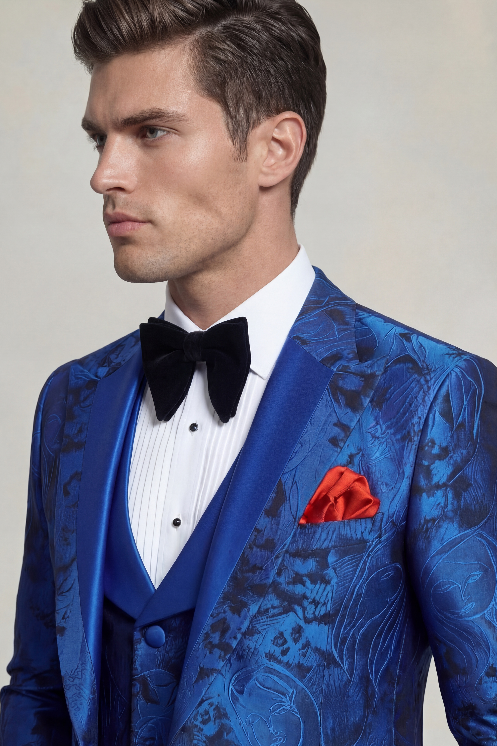 Tailored in a modern slim fit with a custom size option available, this tuxedo is designed to deliver a clean, structured silhouette that enhances the wearer’s natural shape. The luxurious royal blue fabric features an intricate geisha-inspired print subtly woven throughout the material, adding visual depth and an artistic element that elevates the entire ensemble.