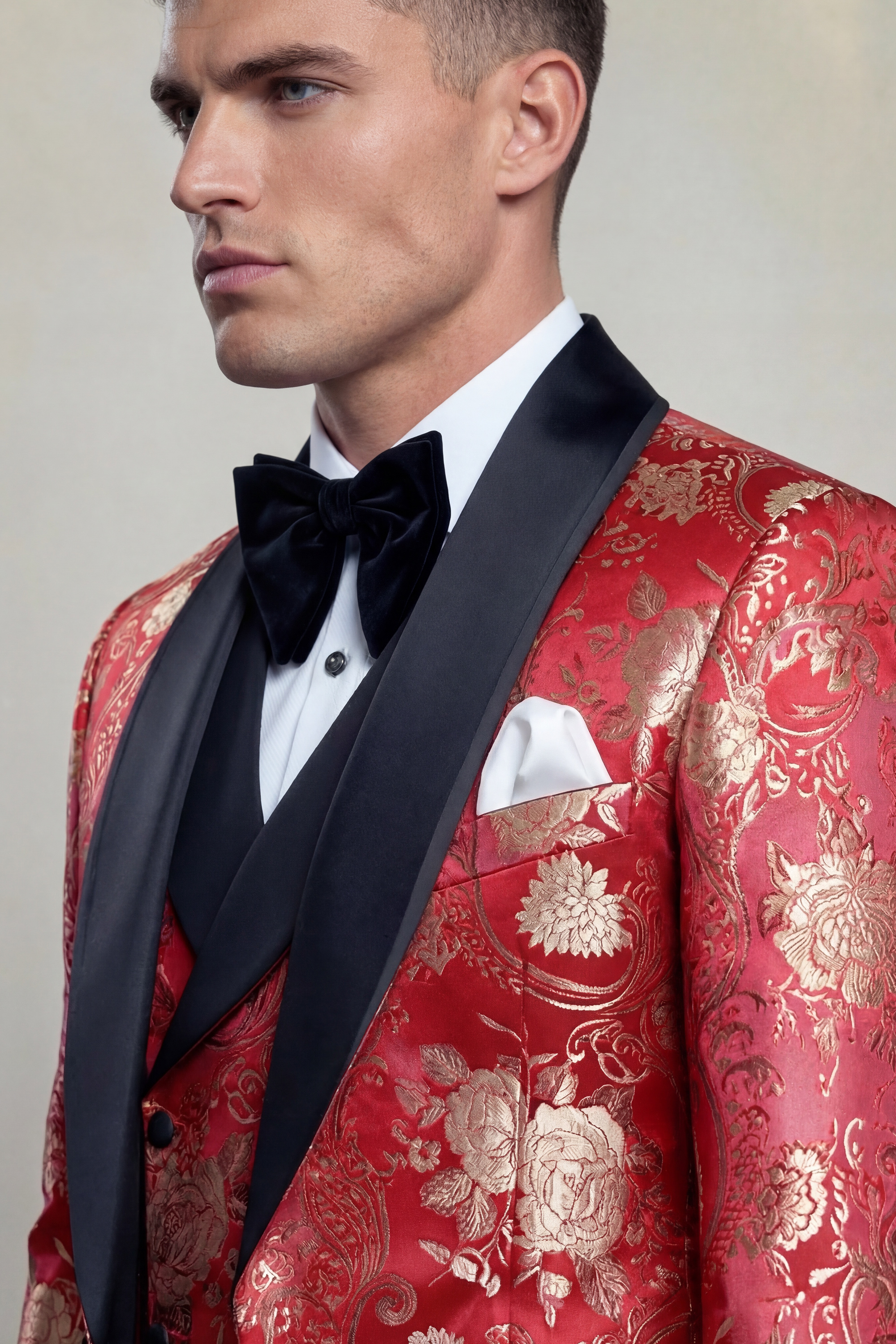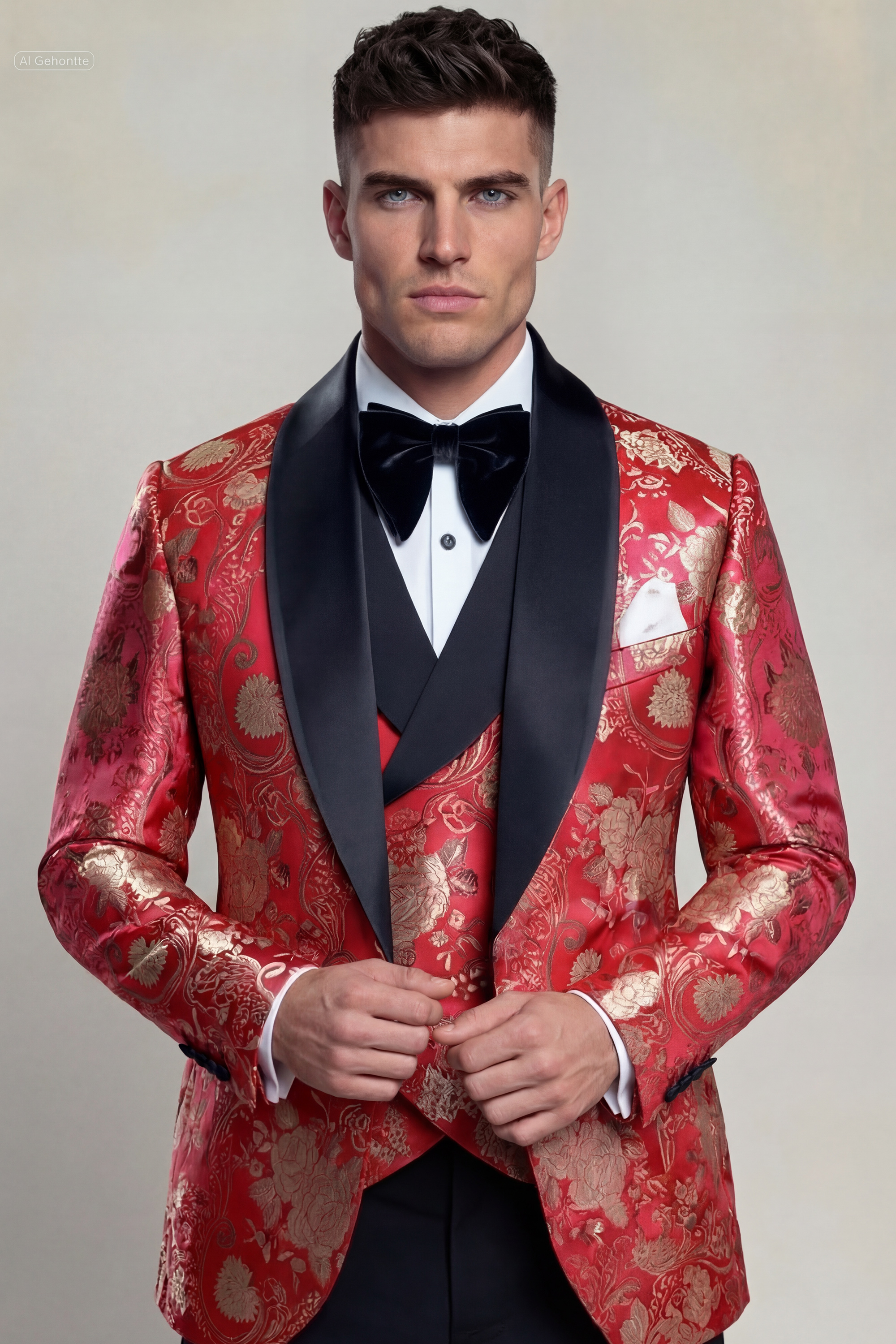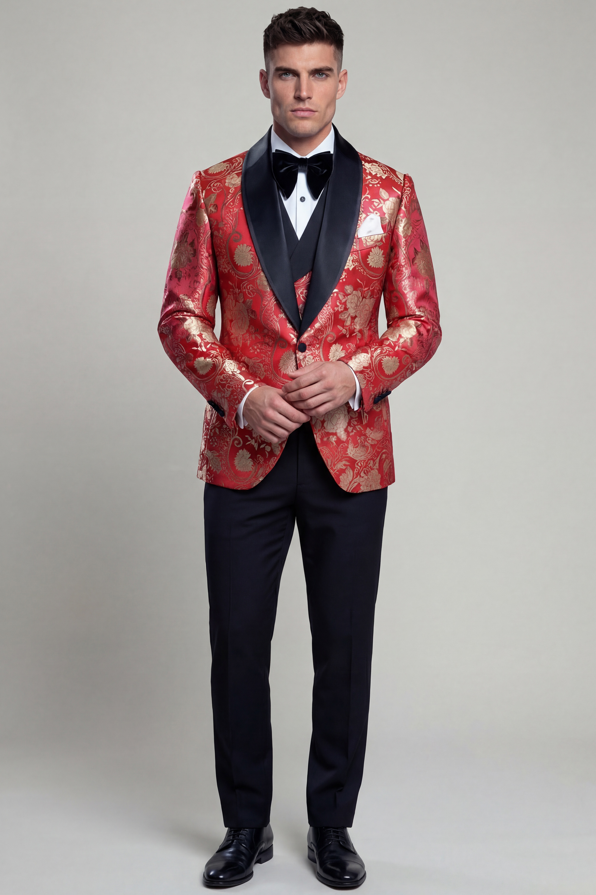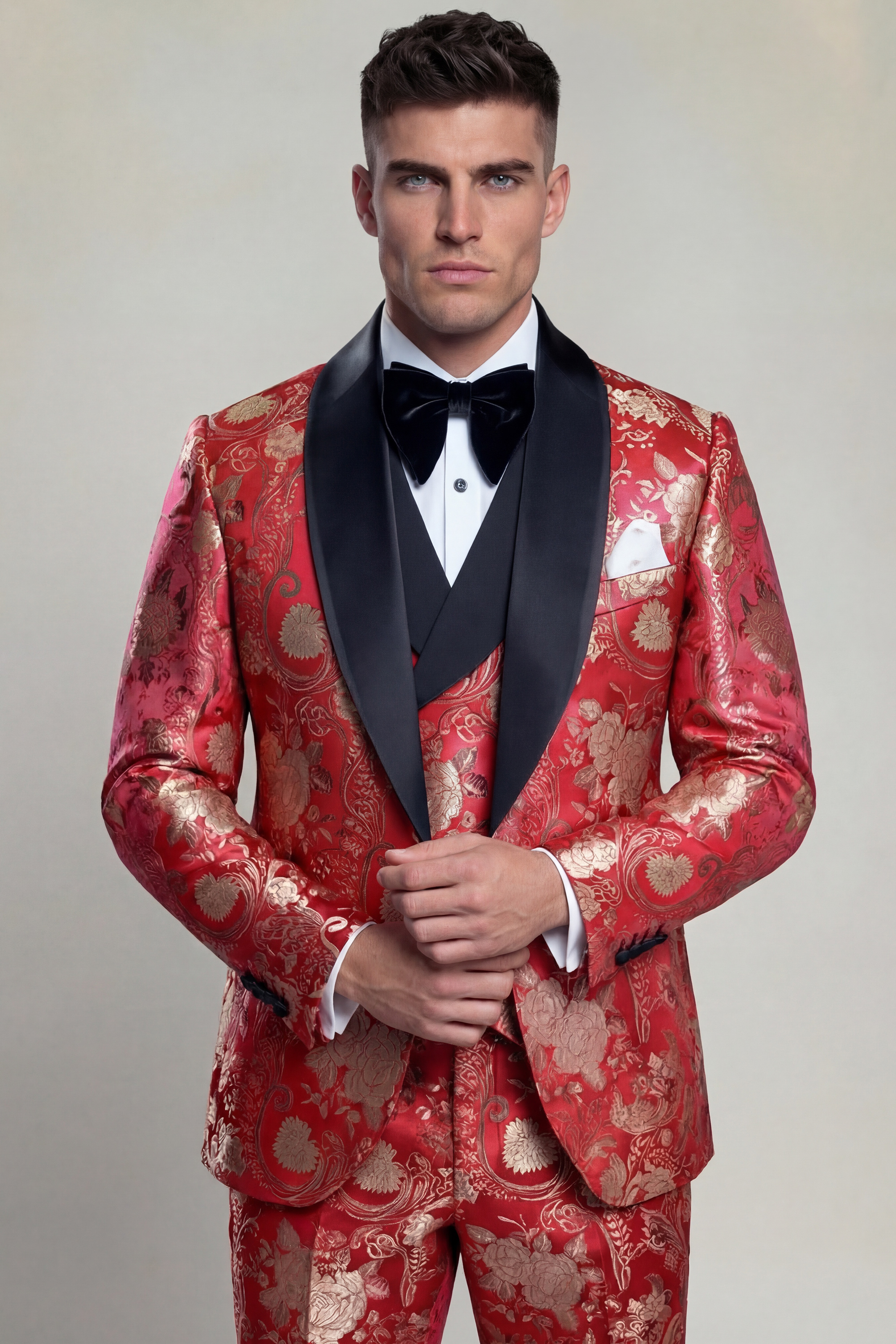 Finished with the Gentleman’s Guru signature crimson stitches, this tuxedo reflects meticulous craftsmanship and attention to detail. Completed with classic black trousers, the Ruby Red and Gold Floral Tuxedo is an ideal choice for weddings, formal receptions, galas, and black-tie events where a confident and distinguished presence is essential.