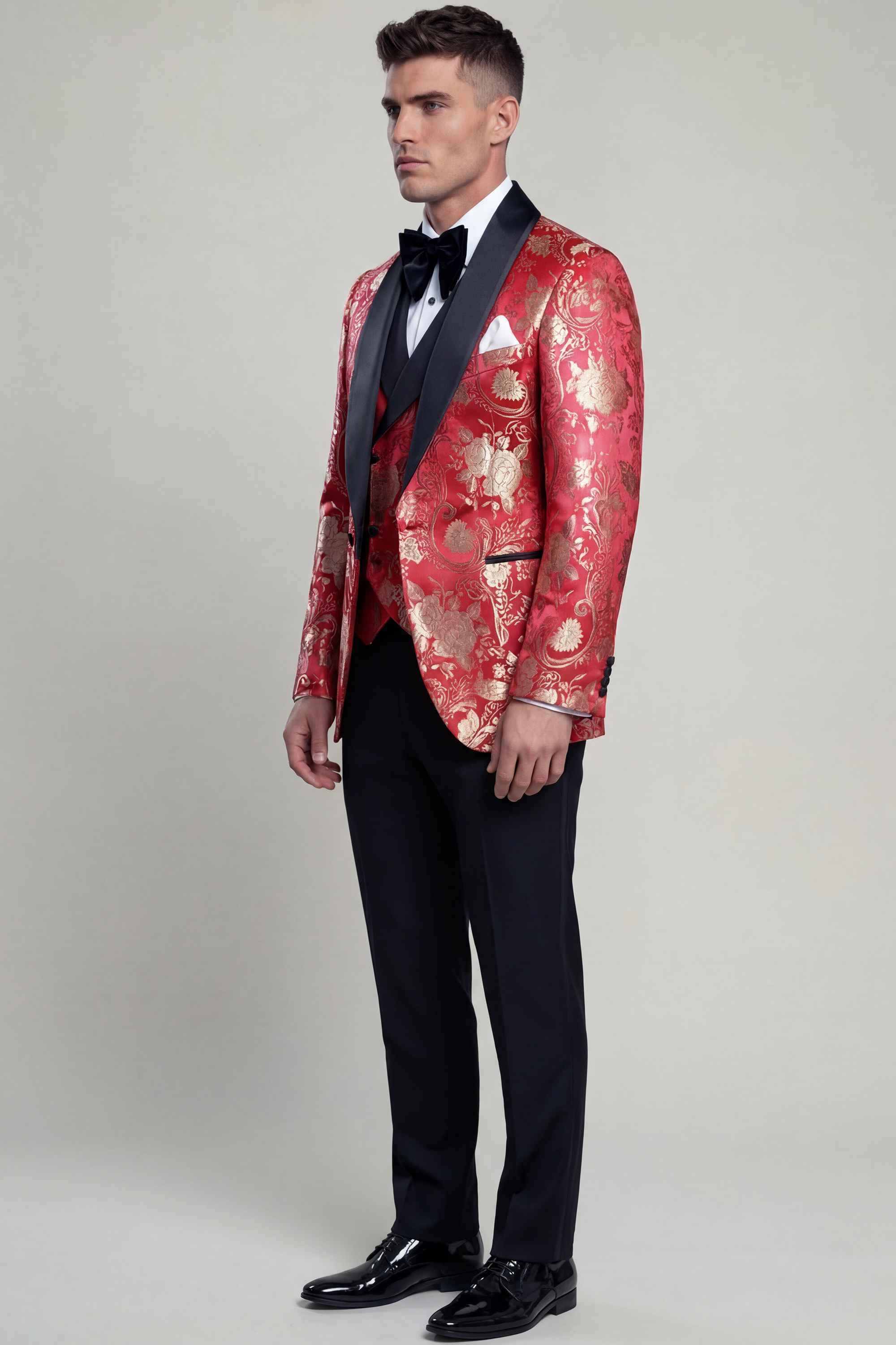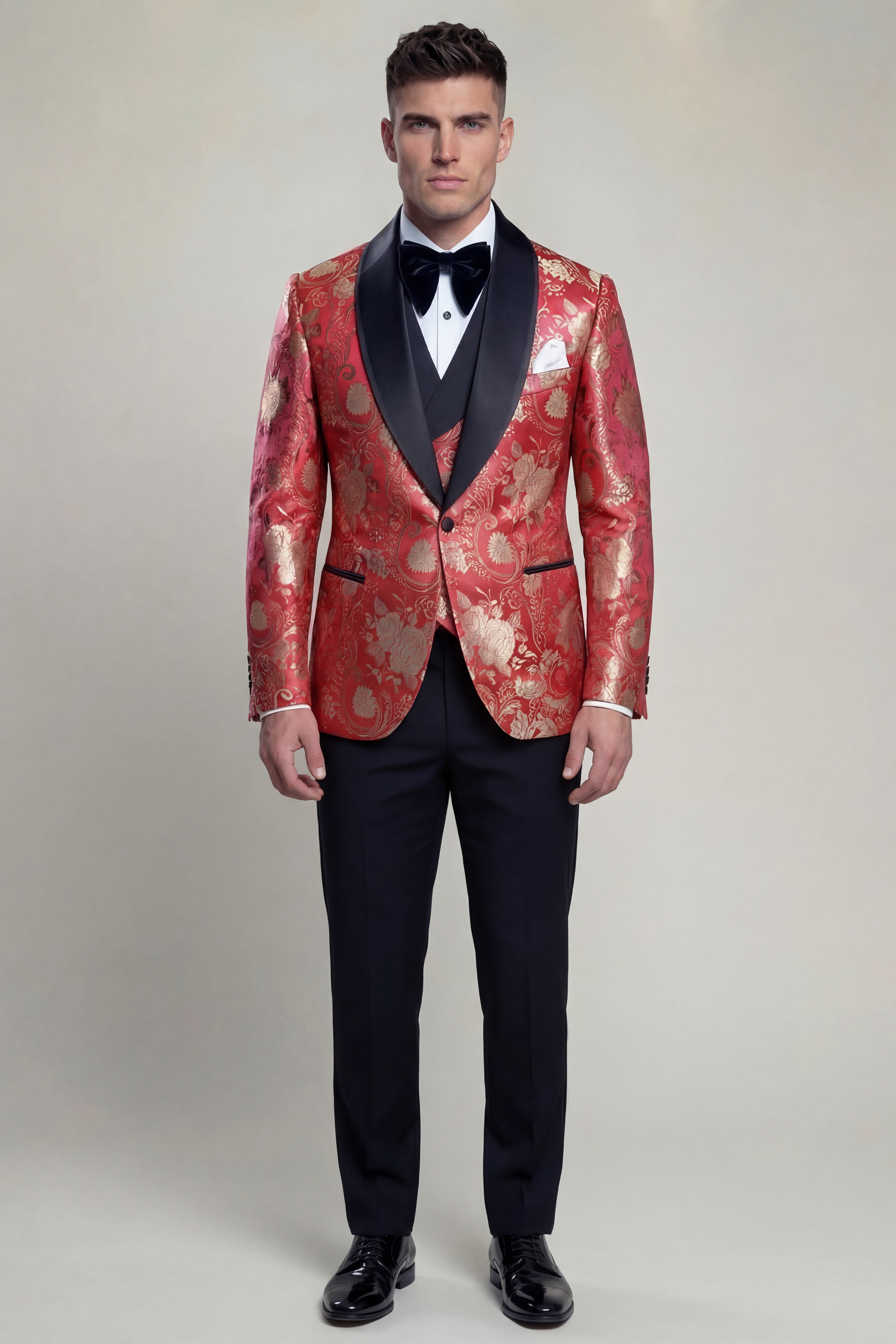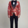 Tailored in a slim fit silhouette, the tuxedo delivers a clean, modern profile, with a custom size option available to ensure a precise and confident fit. The fabric showcases a luxurious ruby red base adorned with an intricate gold floral pattern, creating a rich visual texture that reflects timeless sophistication. The single-breasted jacket features a one-button closure and is accented with a wide black satin shawl collar, providing a bold contrast that enhances the overall design.