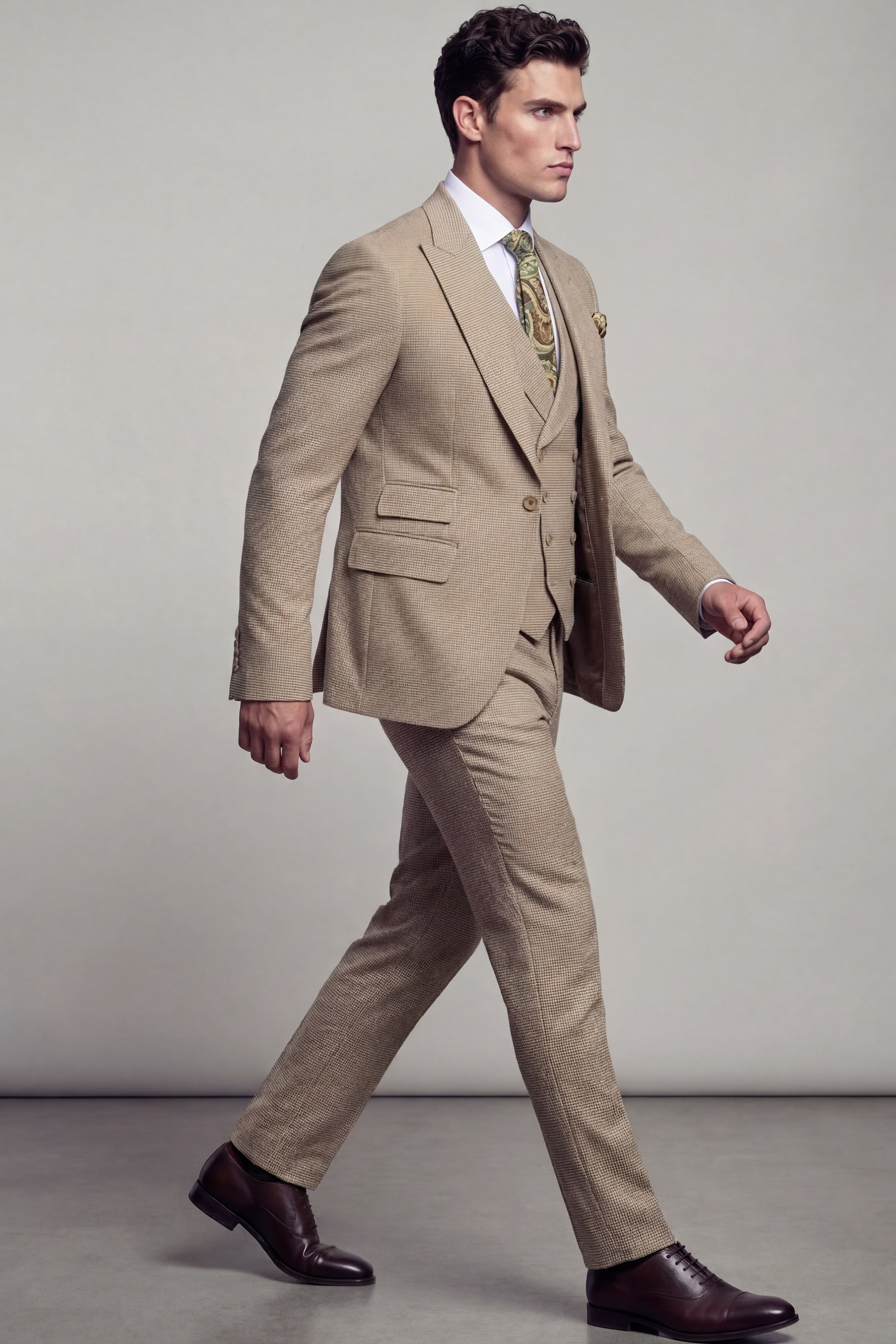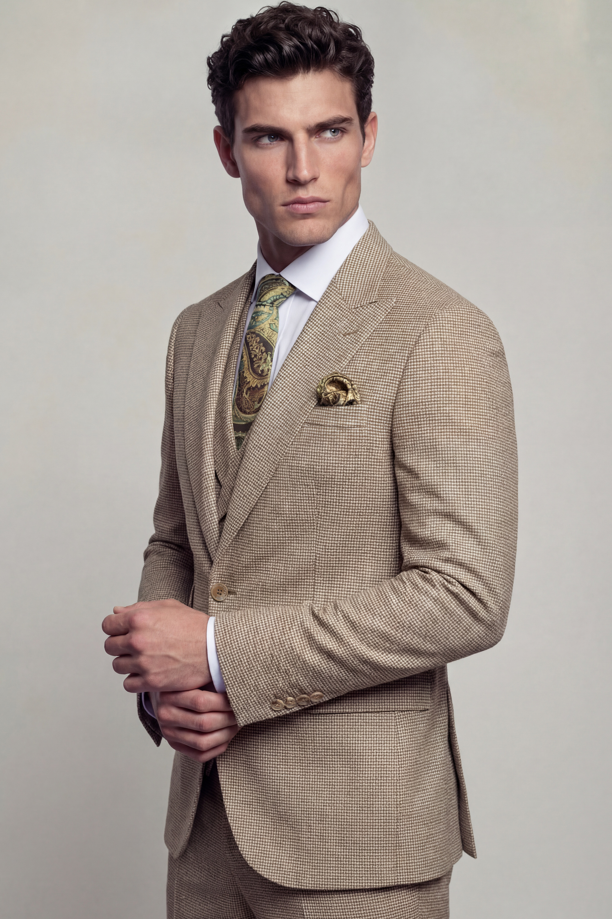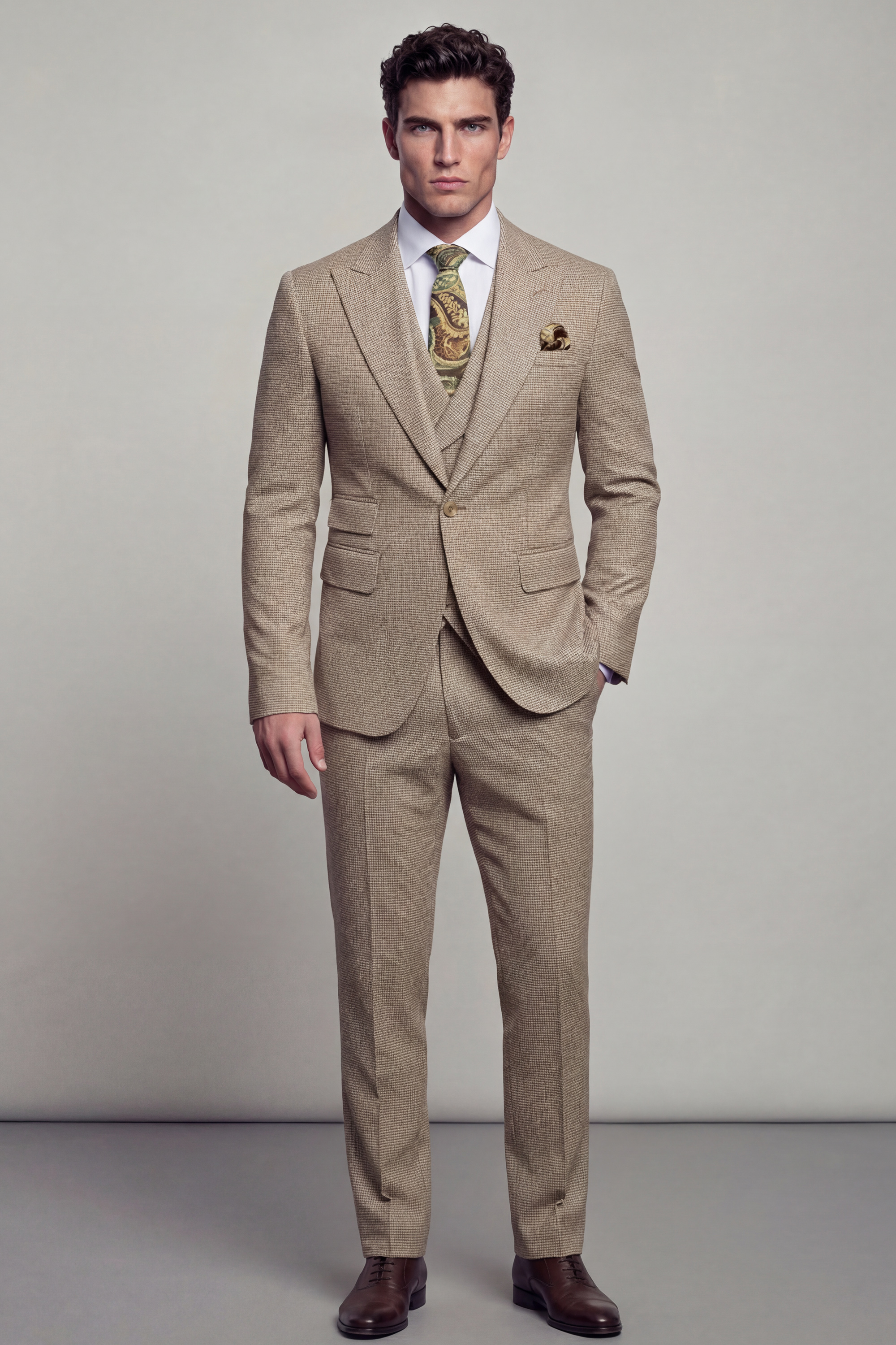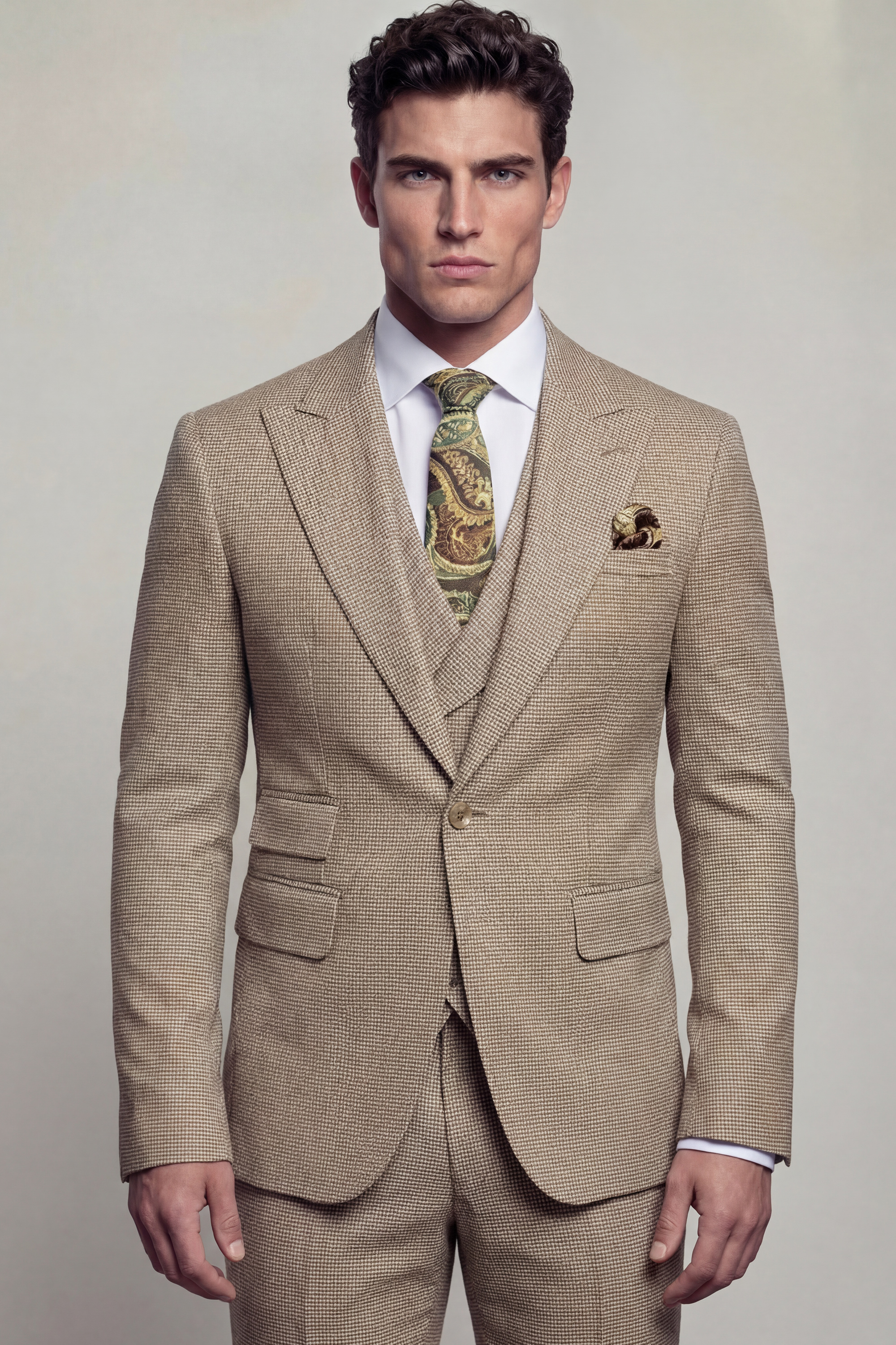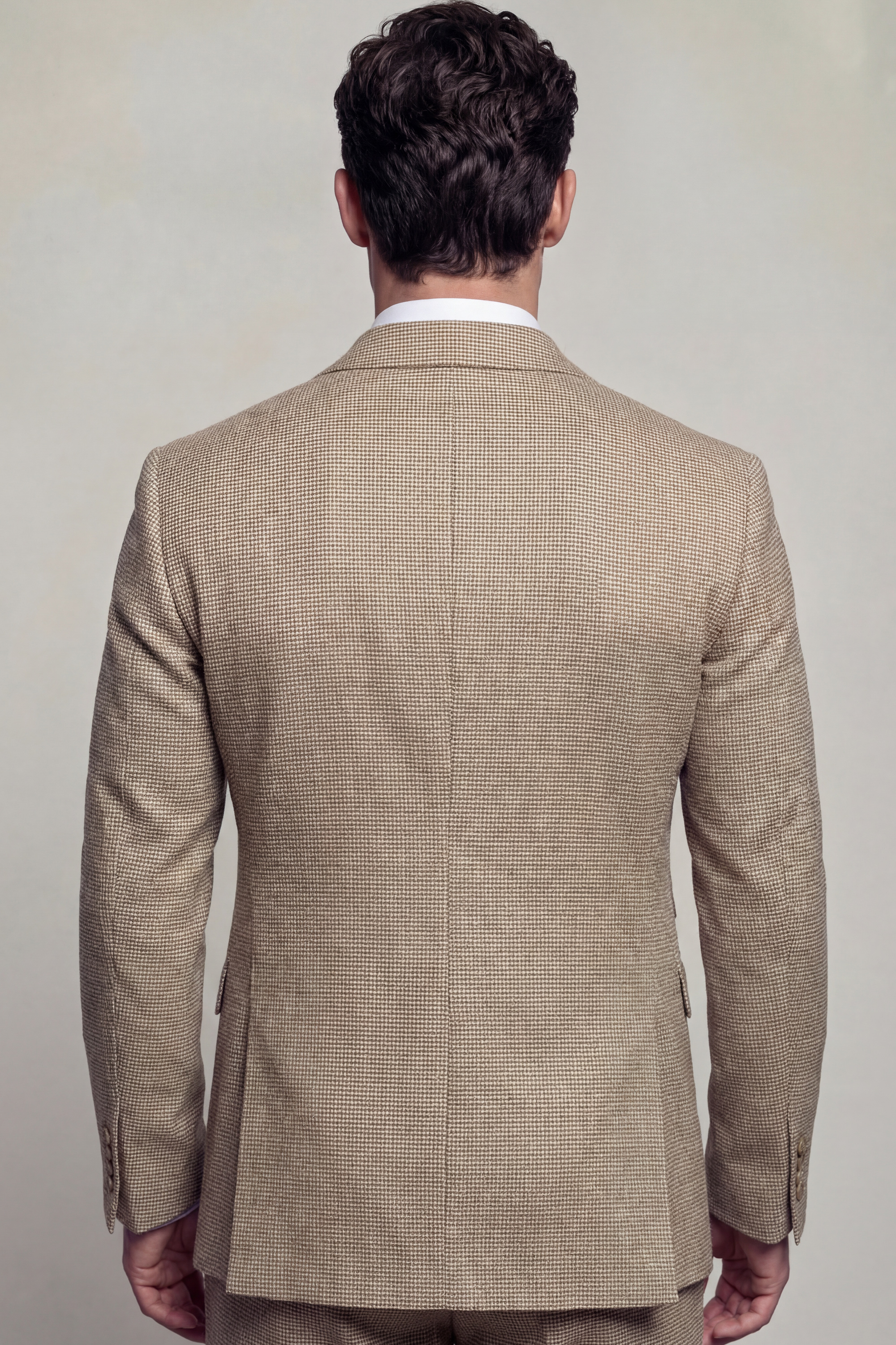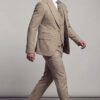 Tailored in a slim fit with a custom size option available, this suit is crafted to create a sharp, structured silhouette that enhances the natural frame while ensuring lasting comfort. The fabric features a tan houndstooth pattern set against a classic khaki backdrop, offering depth and texture while maintaining a refined and versatile aesthetic.