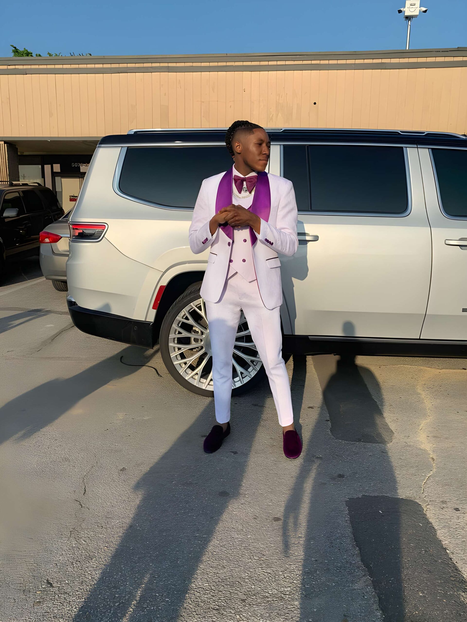 Making a lasting impression at your next formal event is easy with this sophisticated and stylish tuxedo. Take your wardrobe to the next level when you add this floral purple and white tuxedo to your collection.