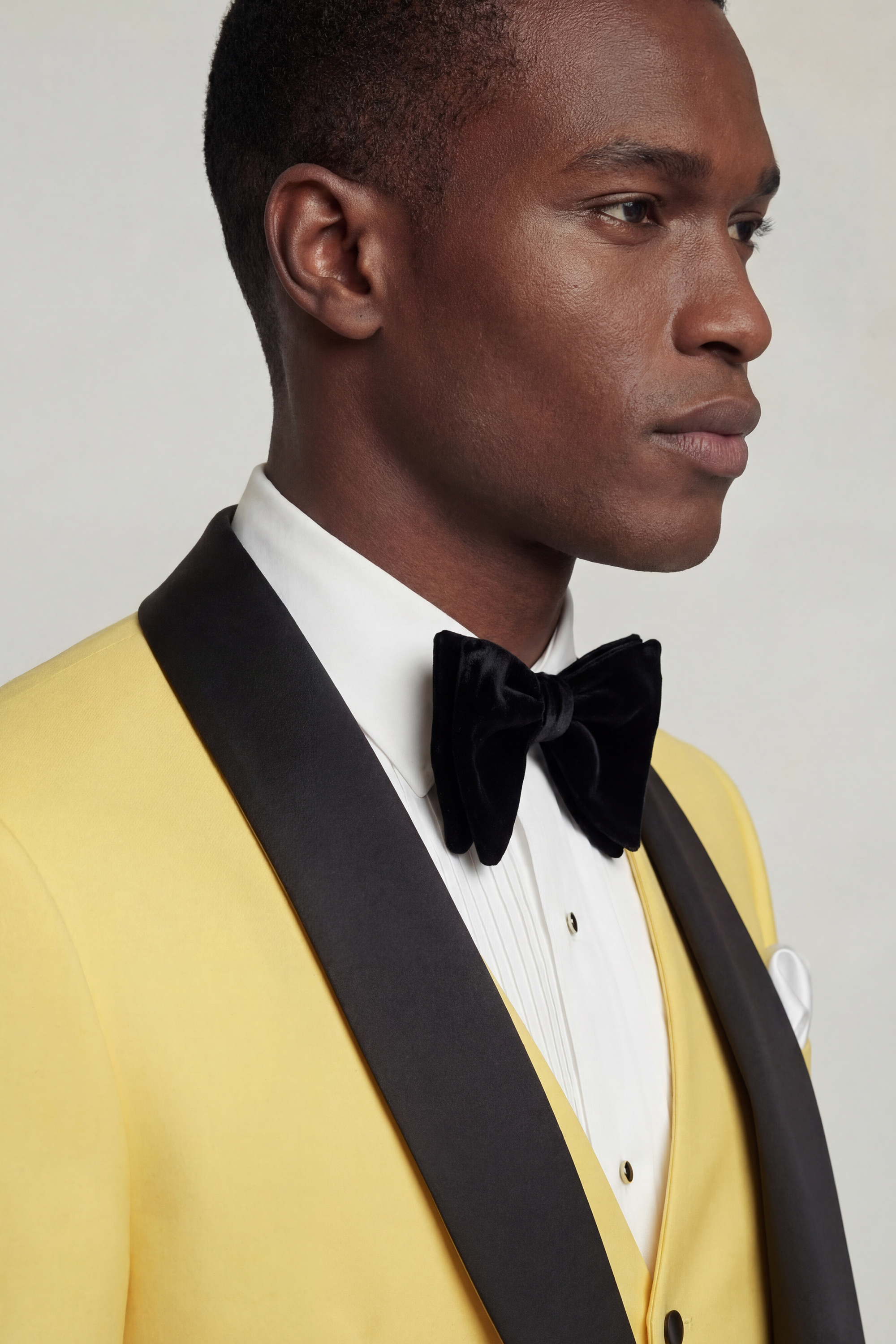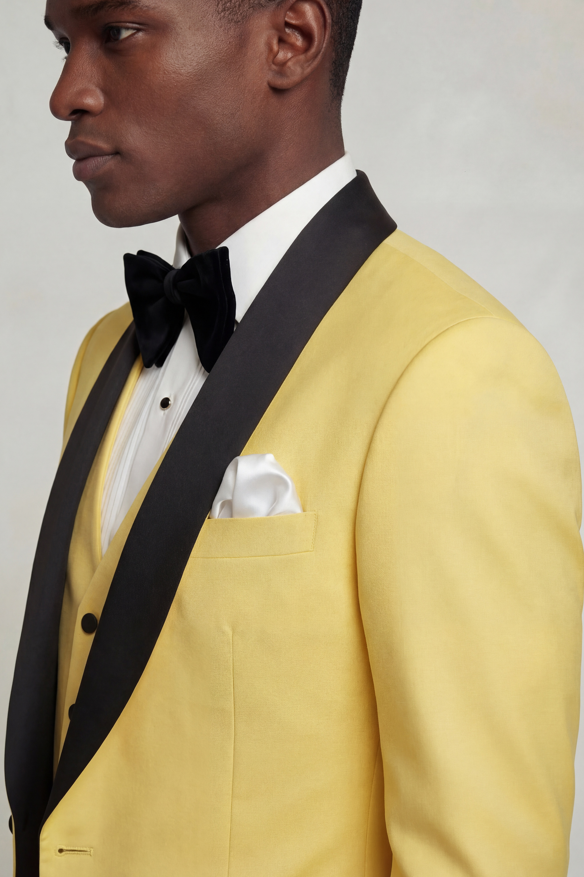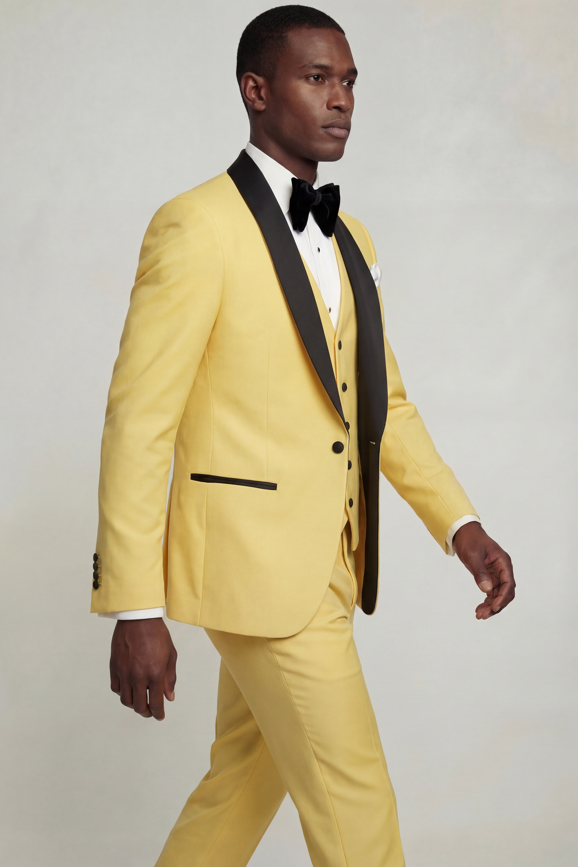Presenting The Gentleman’s Guru Modern Yellow and Black Tuxedo – 3 Piece, a bold and distinguished expression of contemporary formalwear crafted for the gentleman who embraces confidence and individuality. Designed to command attention while maintaining refined elegance, this tuxedo blends striking contrast with impeccable tailoring.