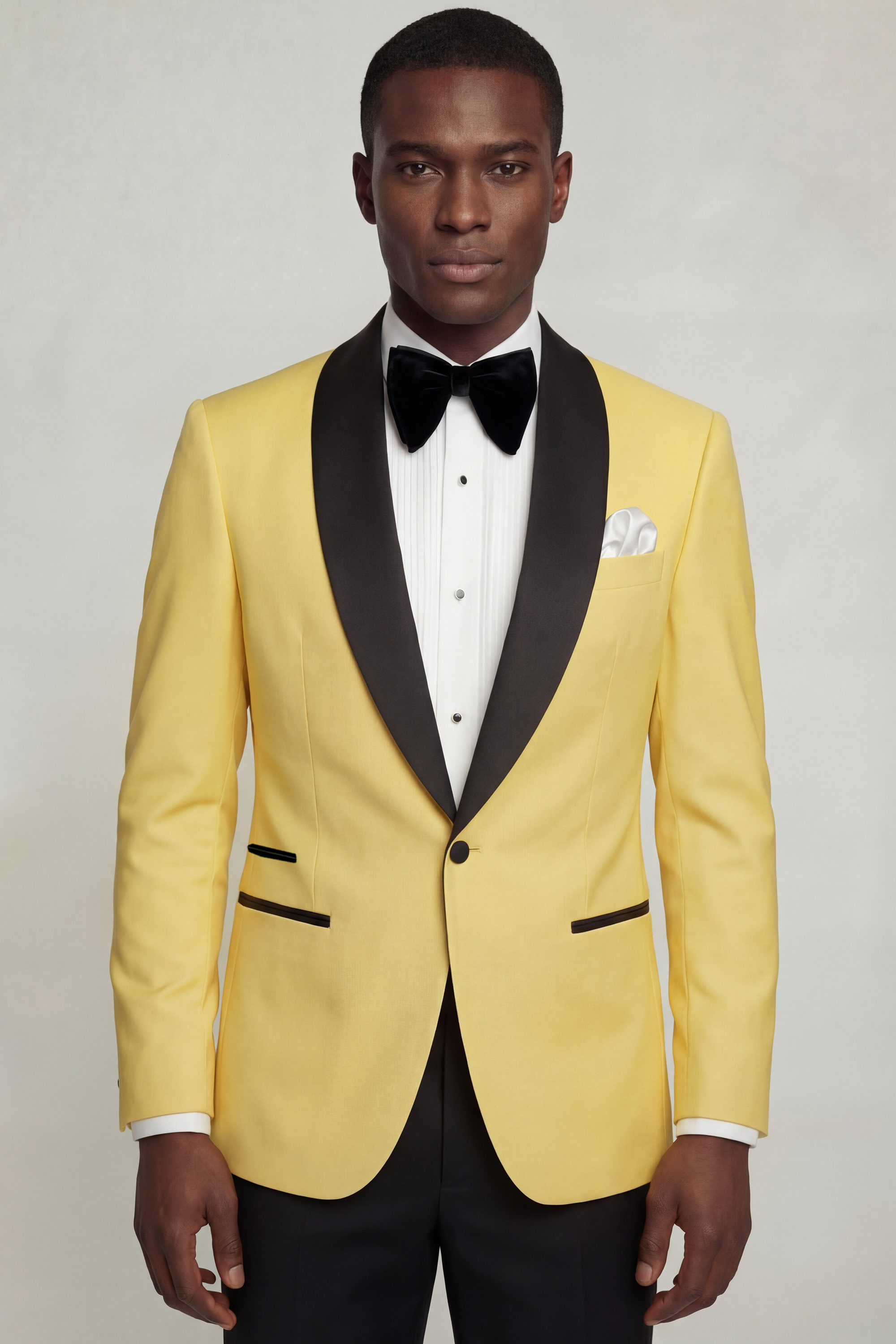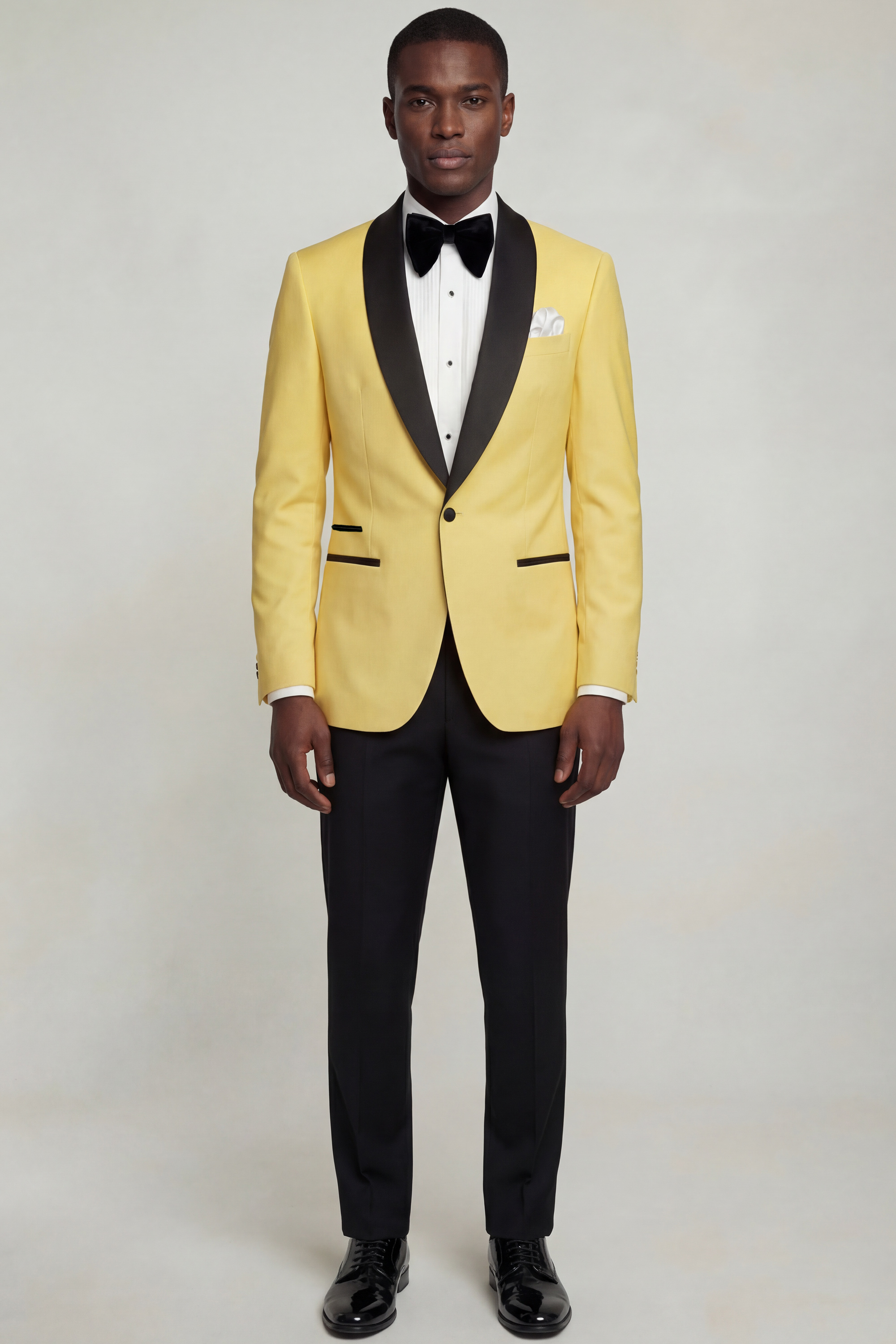The fabric features a solid classic pattern that showcases the dynamic interplay of yellow and black, creating a powerful visual statement suited for high-impact formal occasions. The jacket is styled with a modern single-breasted closure and one button, highlighted by a refined shawl peak collar that adds a contemporary edge to the traditional tuxedo profile. Three front pockets provide balanced structure while maintaining clean, elegant lines.